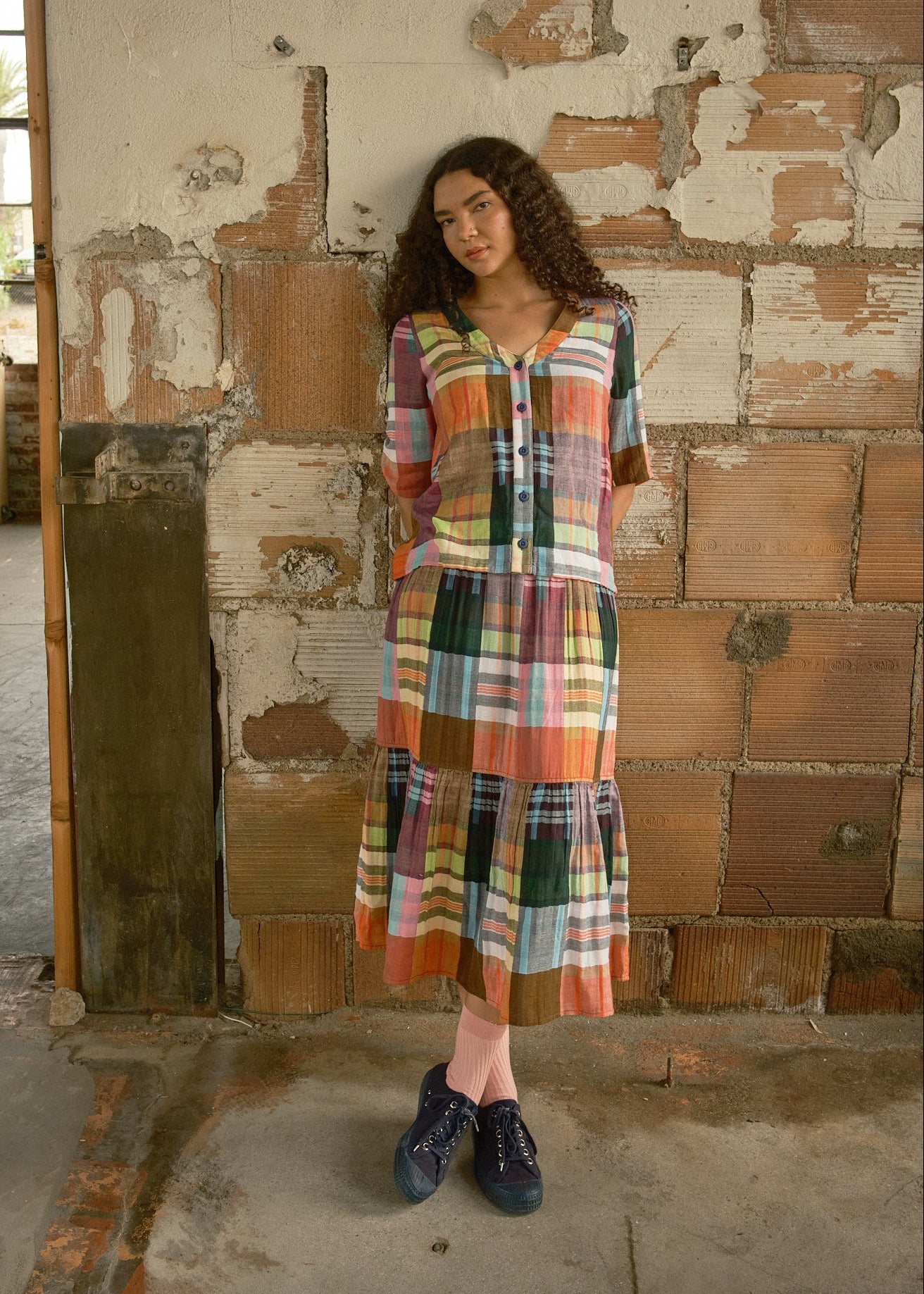 a v-neck placket button up top with ¾ sleeves and side gussets. made in our paintbox textile, a supersoft lightweight luxe doublegauze featuring a complex multicolored plaid in rich hues.