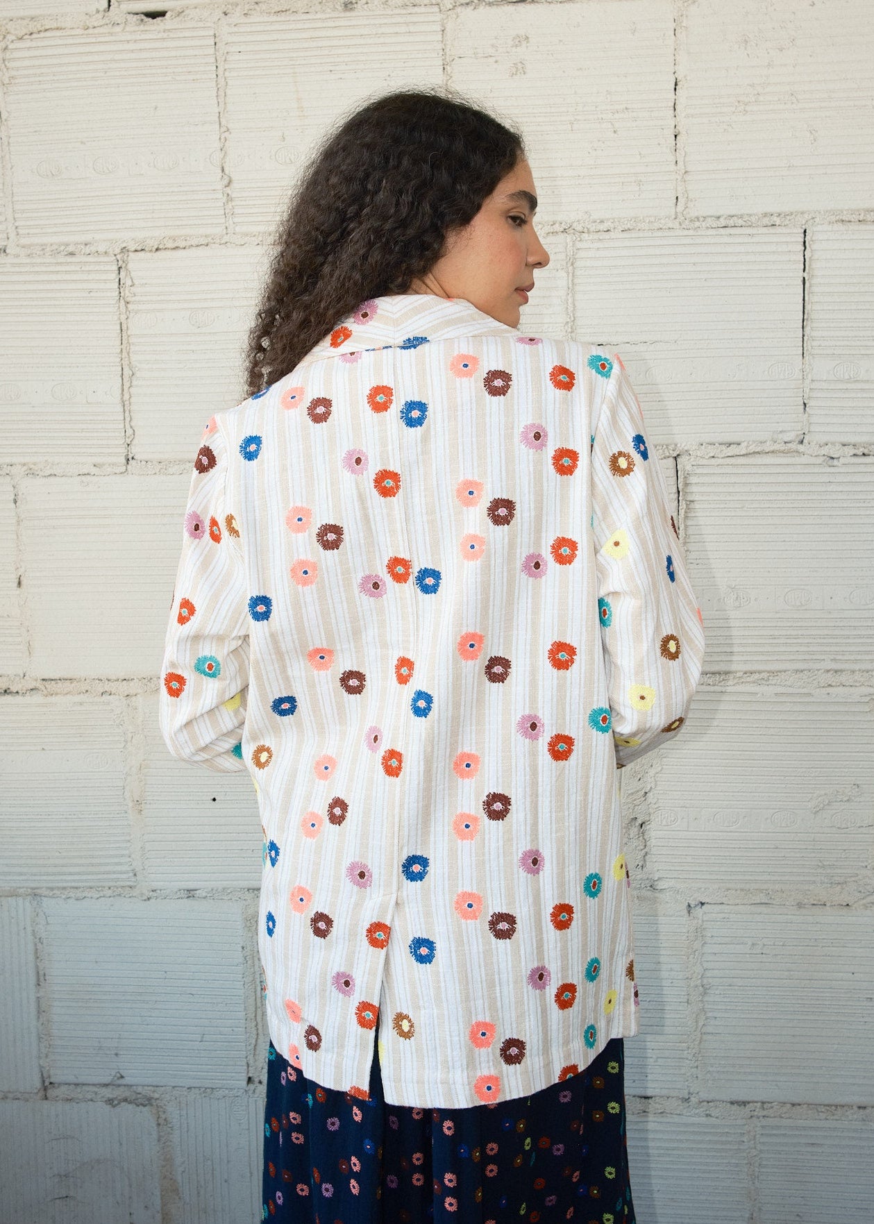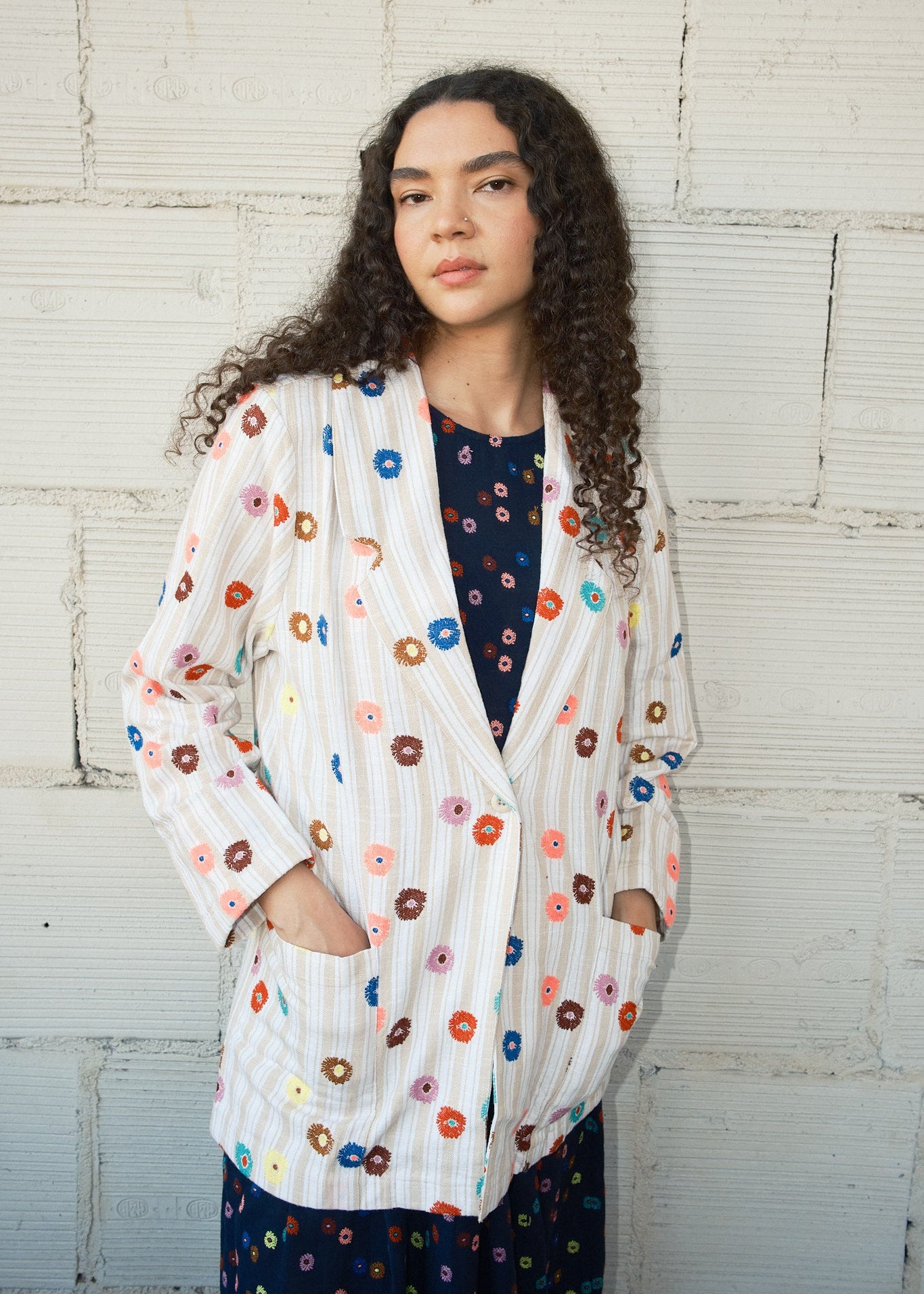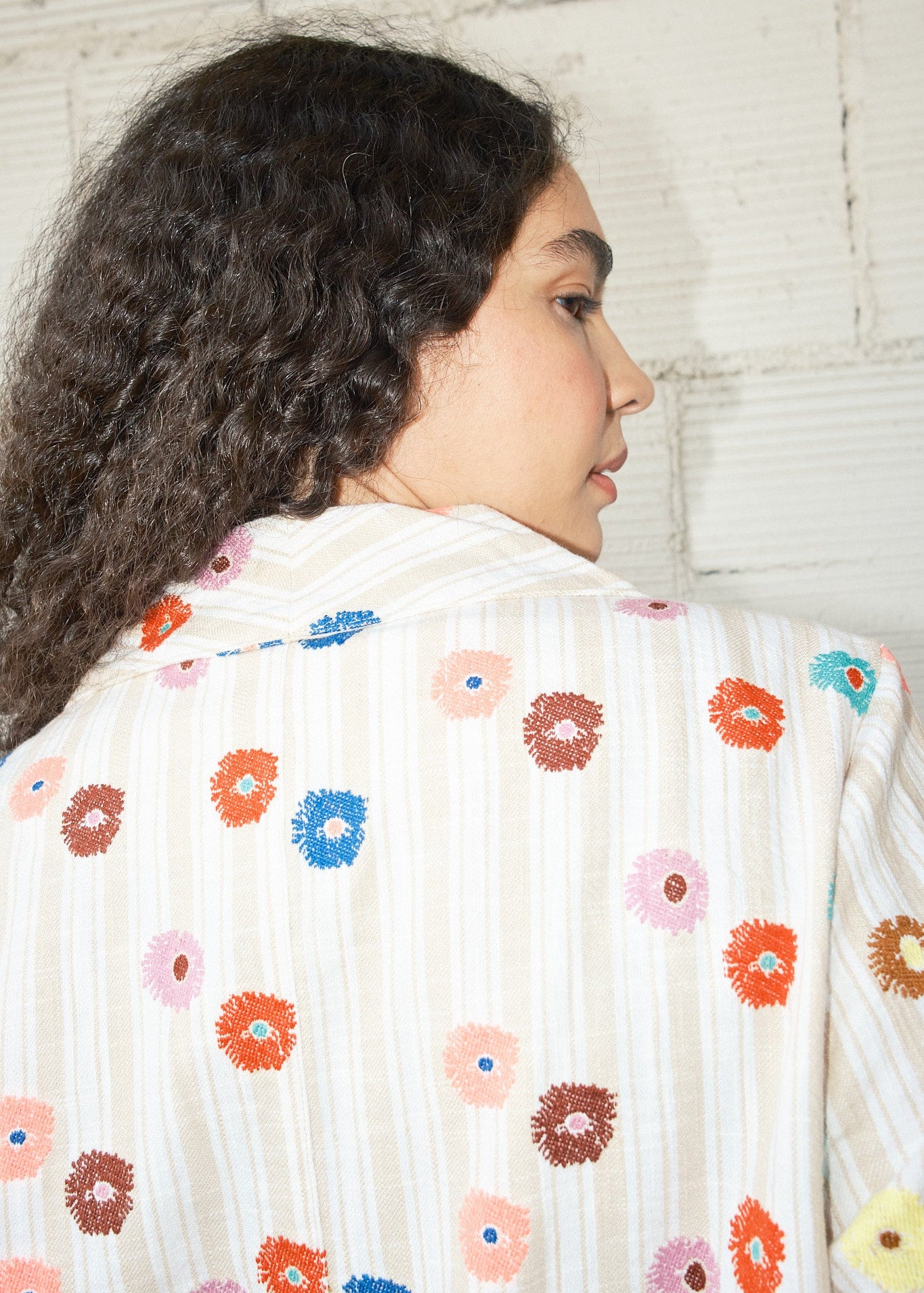 an oversized blazer with a single button closure and patch pockets. made in our fresco textile, a soft linen-like singlecloth, featuring a khaki stripe with multicolored woven flower motifs.