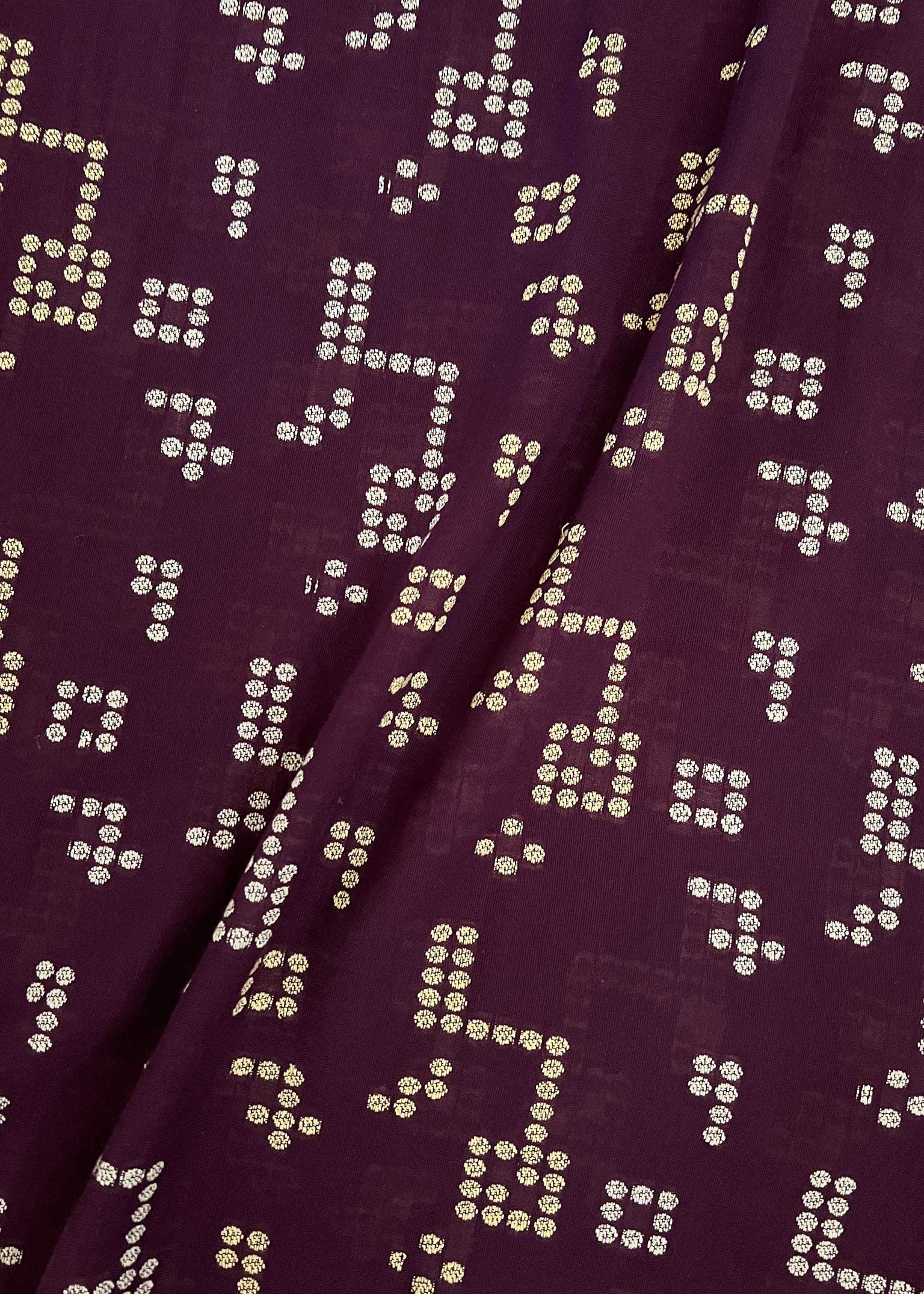a sleeveless maxi dress with a waist seam, ruched back panel, and side slit pockets.  made in our crossword textile, a gossamer lightweight singlecloth in deep eggplant with small woven dots in cream and pale yellow.