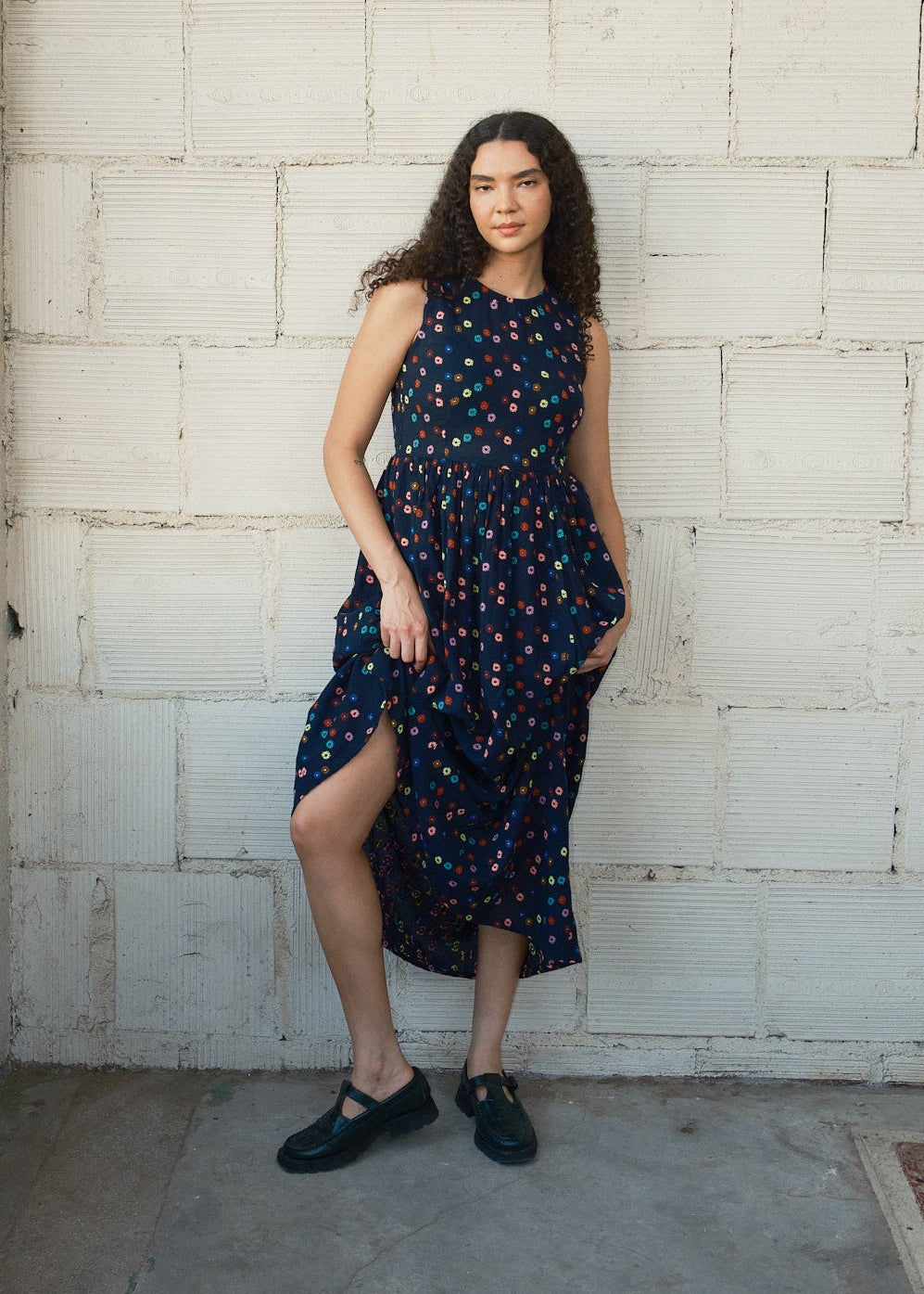 a sleeveless maxi dress with a waist seam, ruched back panel, and side slit pockets. made in our polka textile, a gauzy lightweight midnight navy singlecloth featuring woven mini multicolor floral motifs.