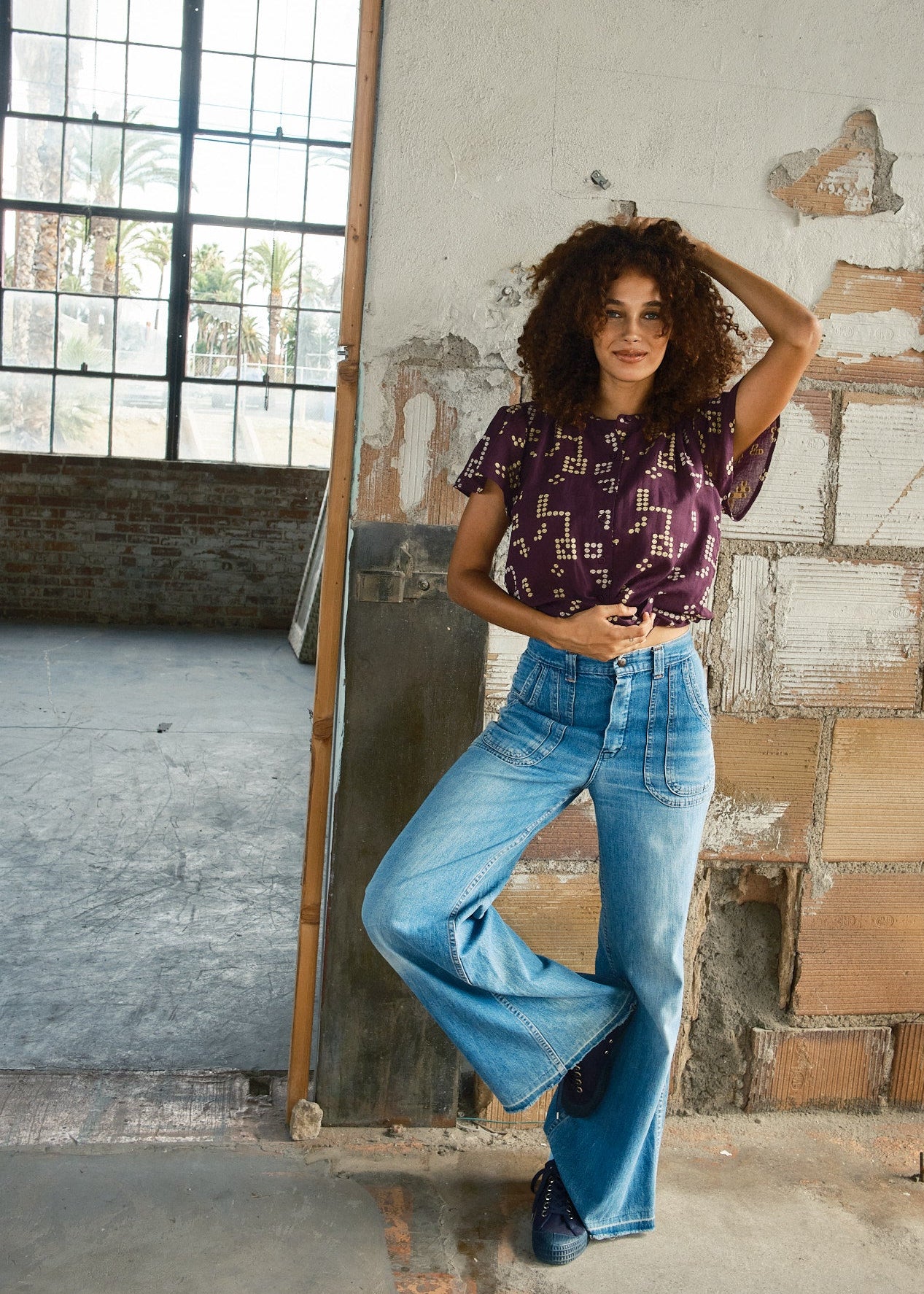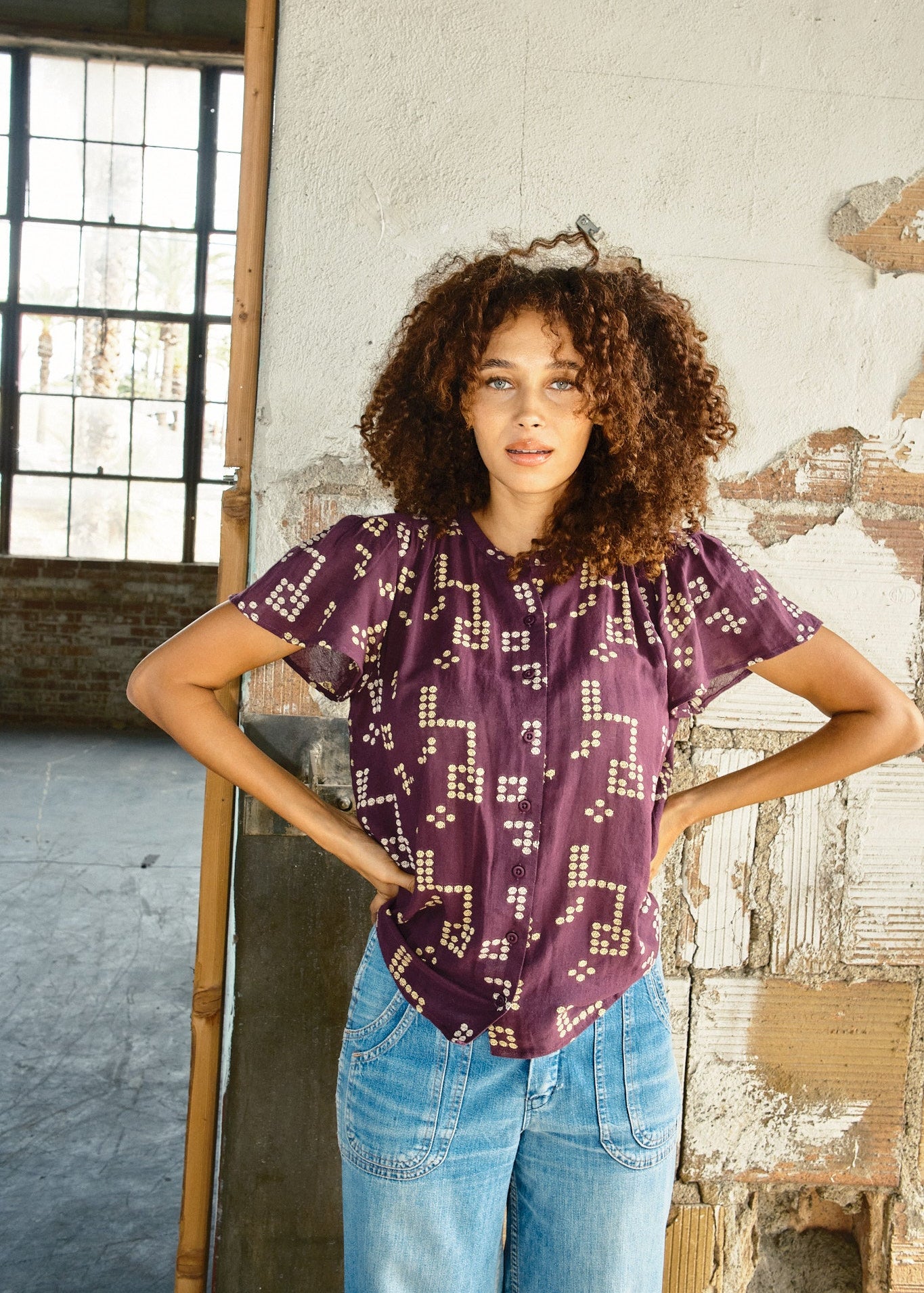 a button-front top with a mandarin collar, flutter sleeves, and shoulder yokes. made in our crossword textile, a gossamer lightweight singlecloth in deep eggplant with small woven dots in cream and pale yellow.
