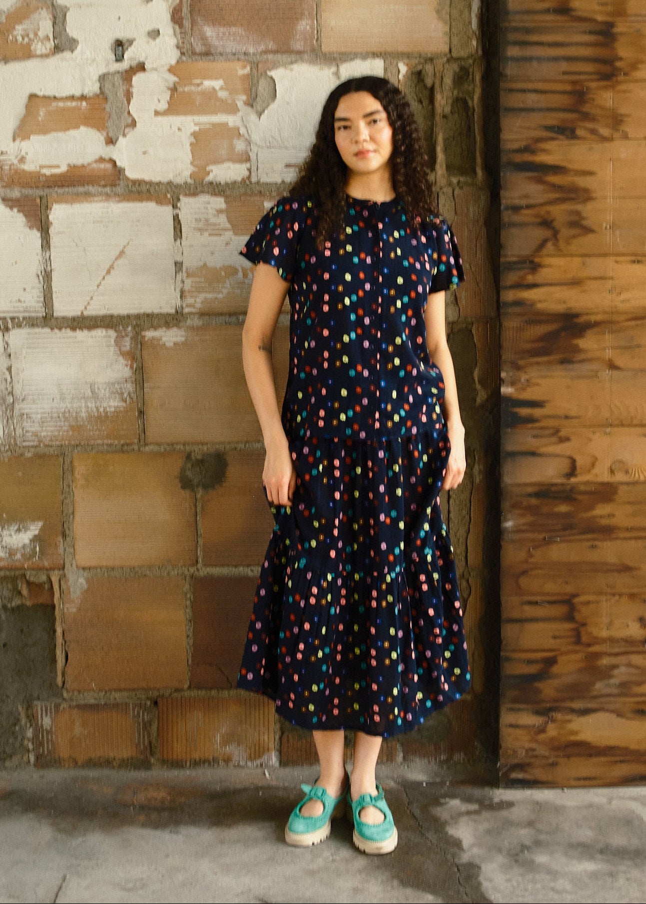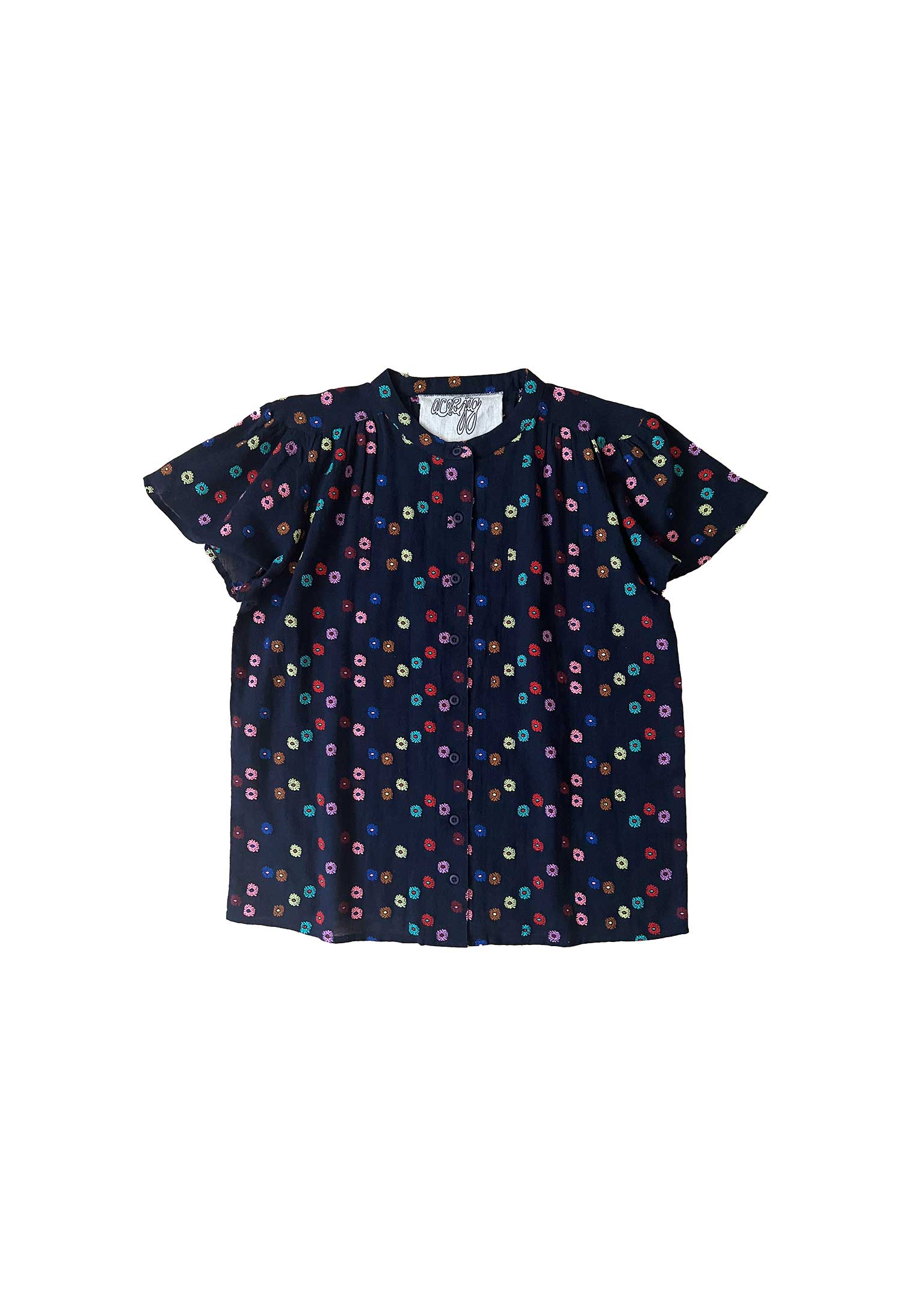 a button-front top with a mandarin collar, flutter sleeves, and shoulder yokes. made in our polka textile, a gauzy lightweight midnight navy singlecloth featuring woven mini multicolor floral motifs.