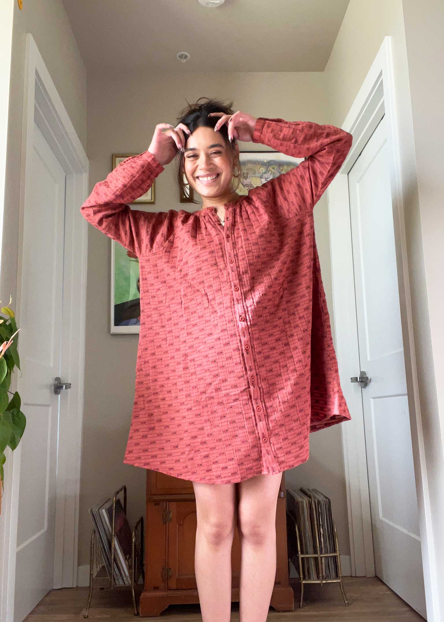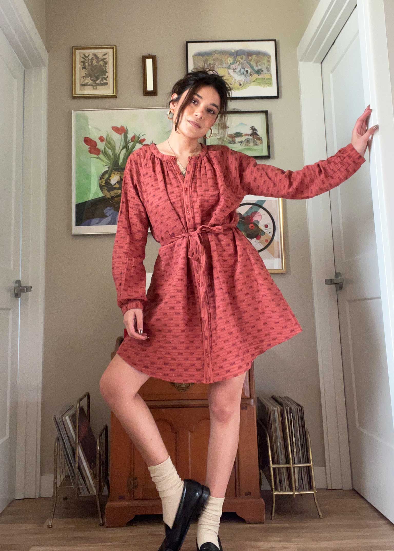 a button front minidress with full length raglan sleeves and a gathered neckline. Comes with a removable fabric belt. made in our palette textile, a lightweight textured gauzy terracotta singlecloth with small woven flowers in rose red and brown.