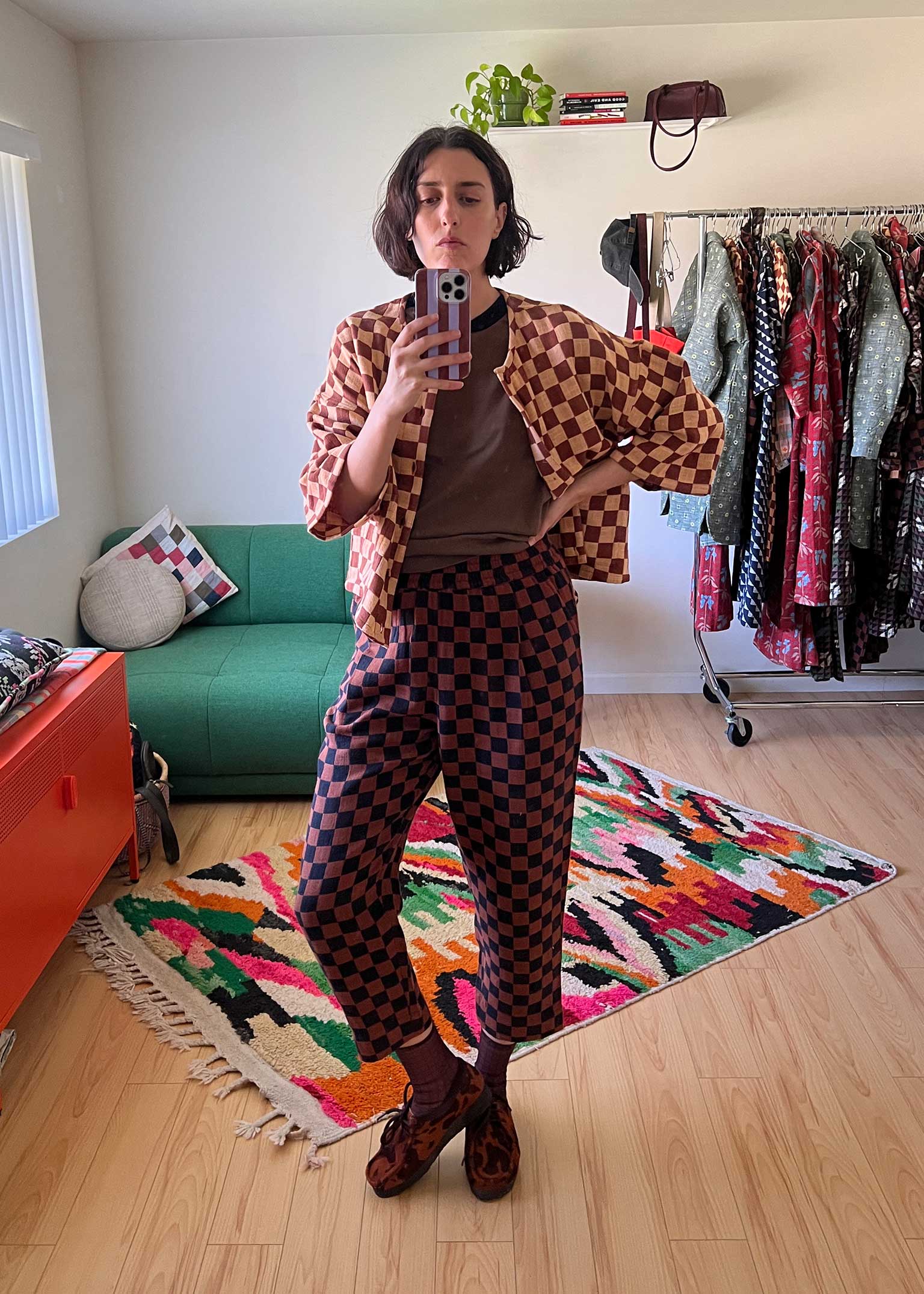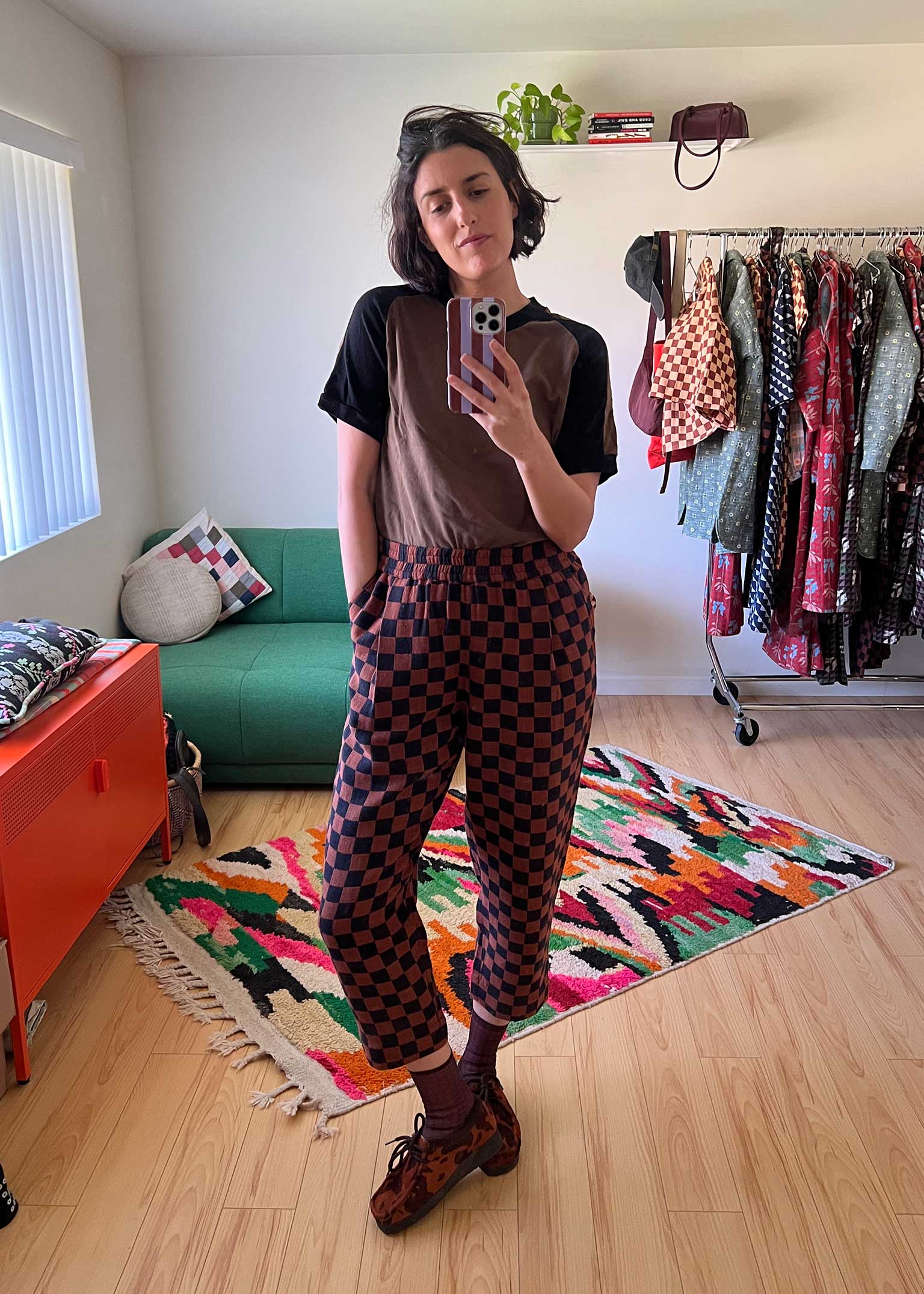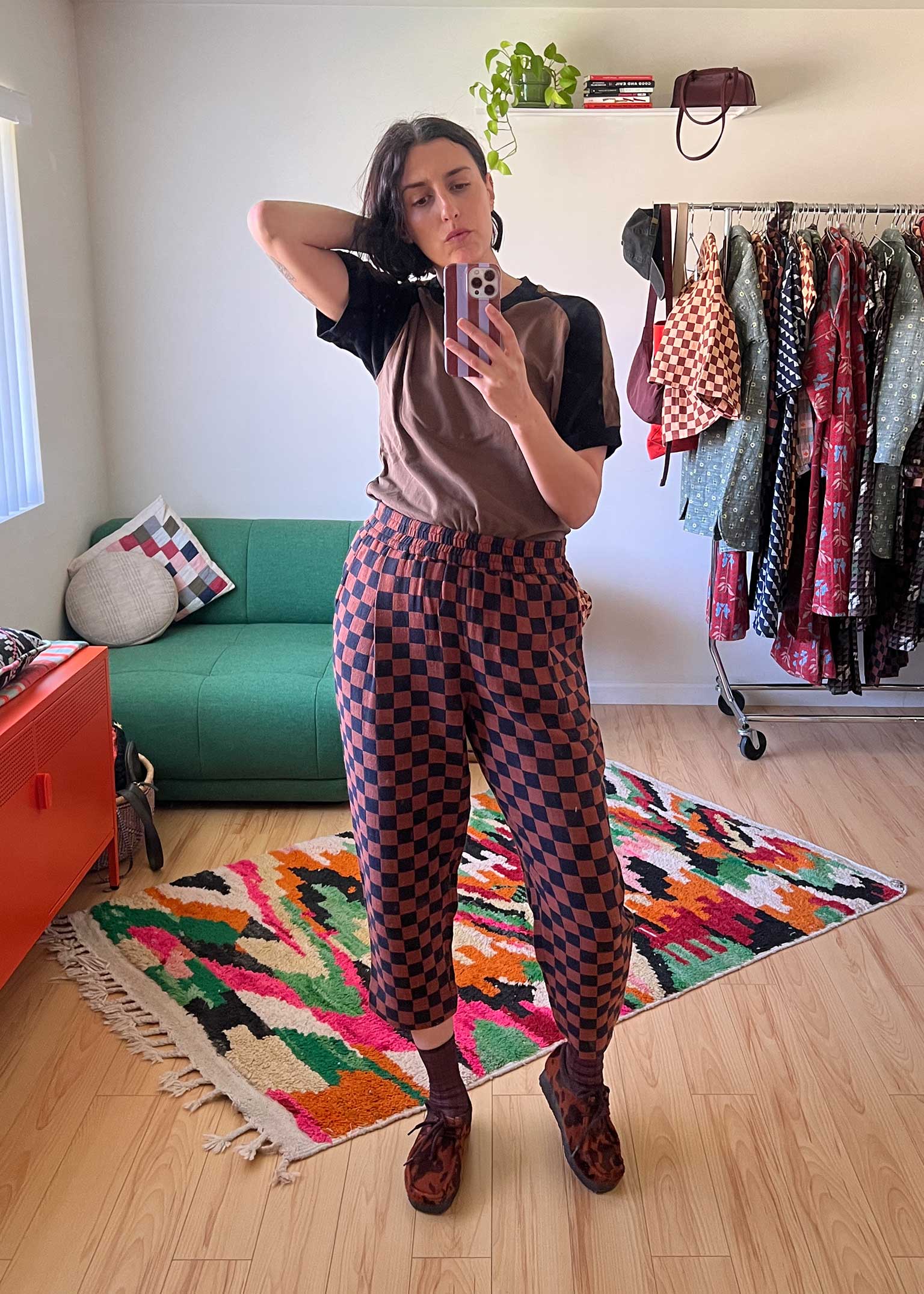 a pull-on pant with a subtle barrel leg, elasticated waistband and patched back pockets. made in our reason textile, a lofty supersoft doublecloth featuring a black and cinnamon brown woven checker pattern. this feels like a knit!