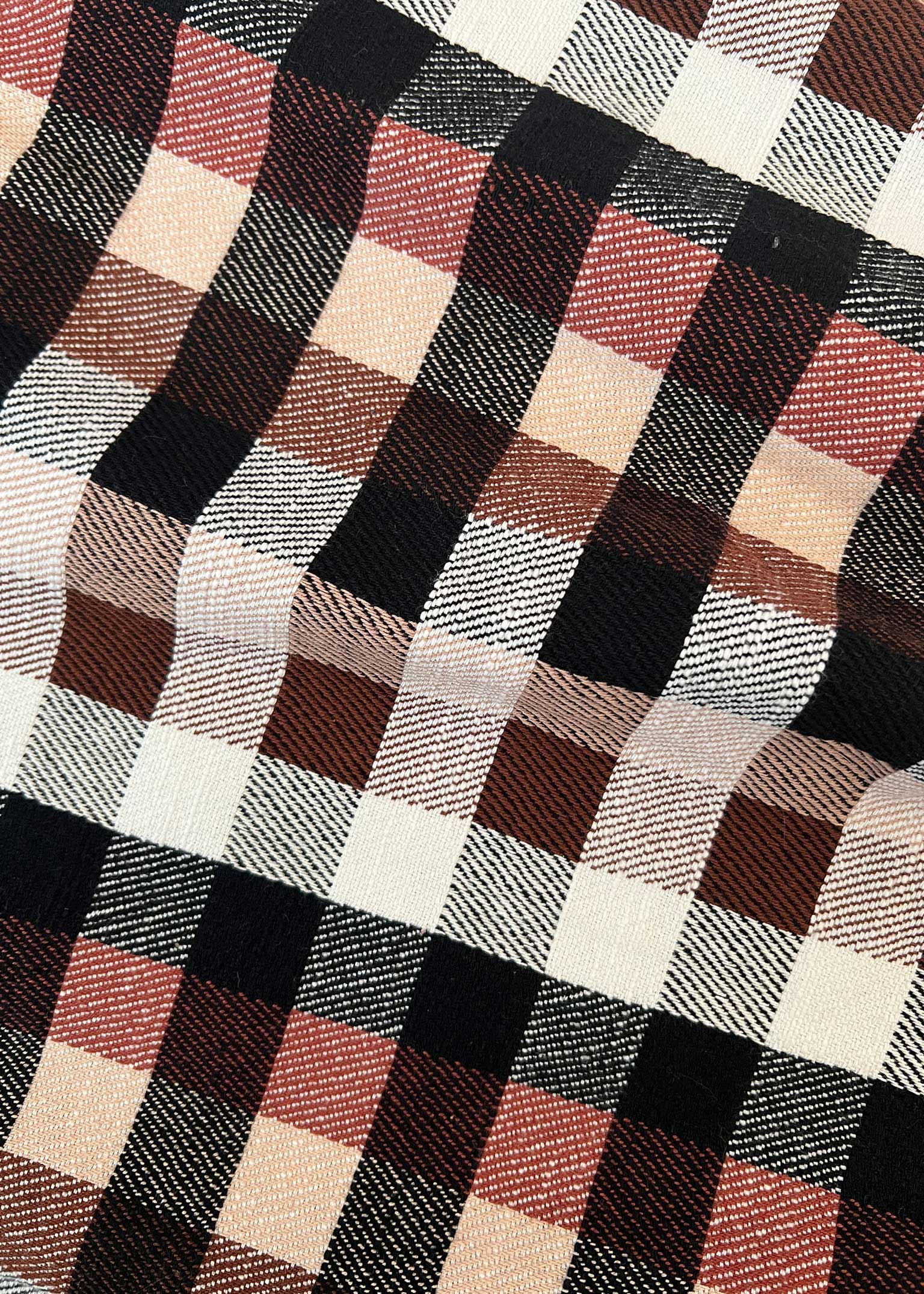 a pull-on pant with a subtle barrel leg, elasticated waistband and patched back pockets. made in our tune textile, a midweight singlecloth featured a plaid of black, brown, and neutrals.