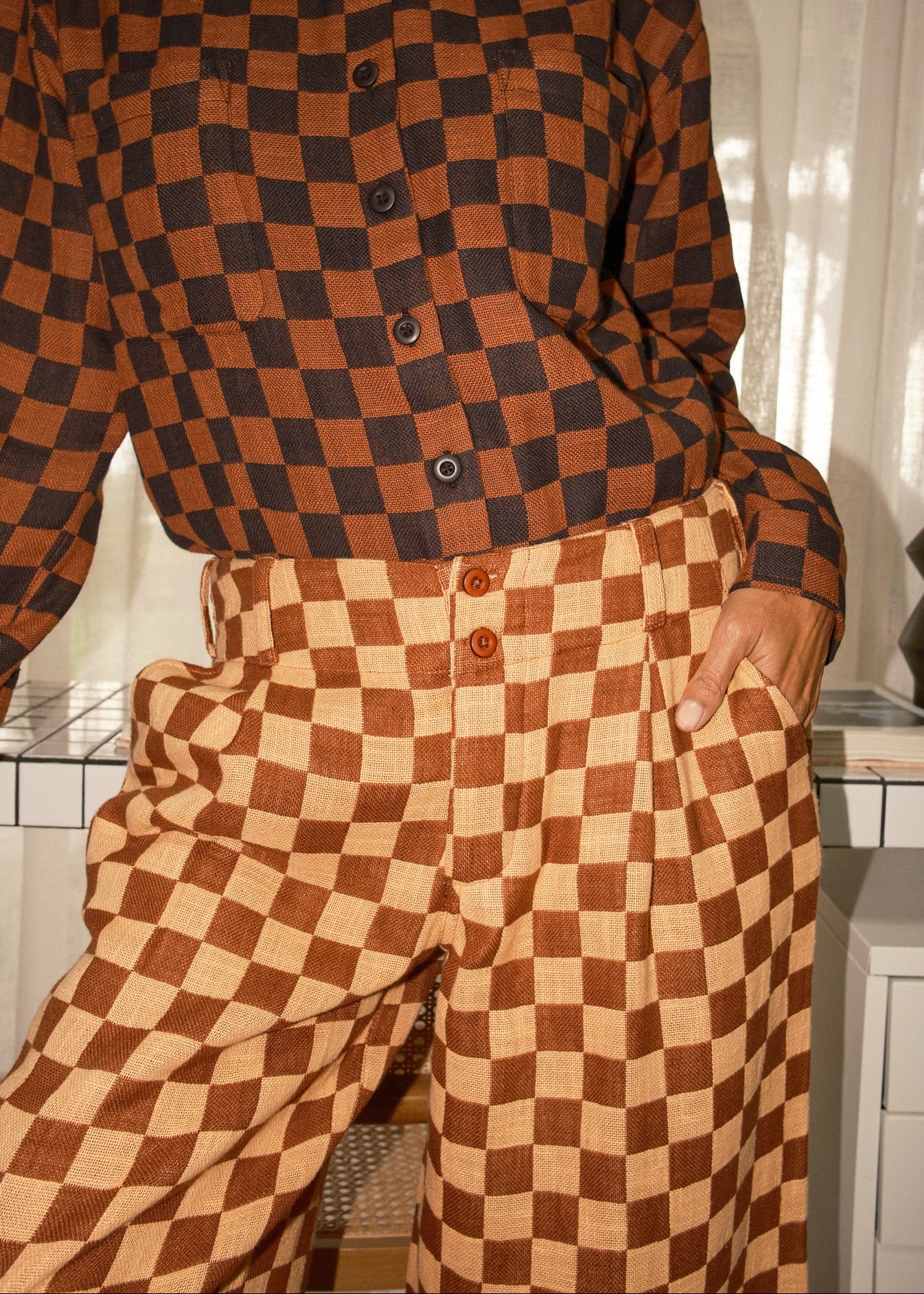 a low waist tailored, slouchy trouser with a button front and wide leg. made in our rhyme textile, a lofty supersoft doublecloth featuring a pale peach and cinnamon brown woven checker pattern. this feels like a knit!