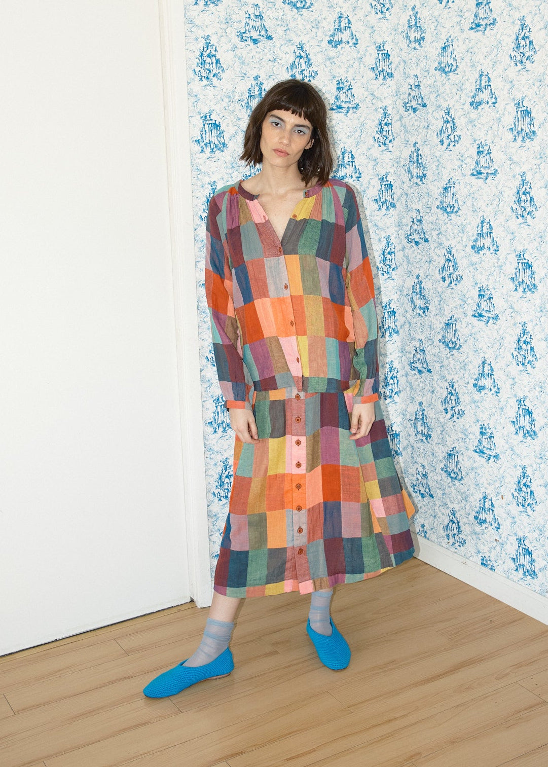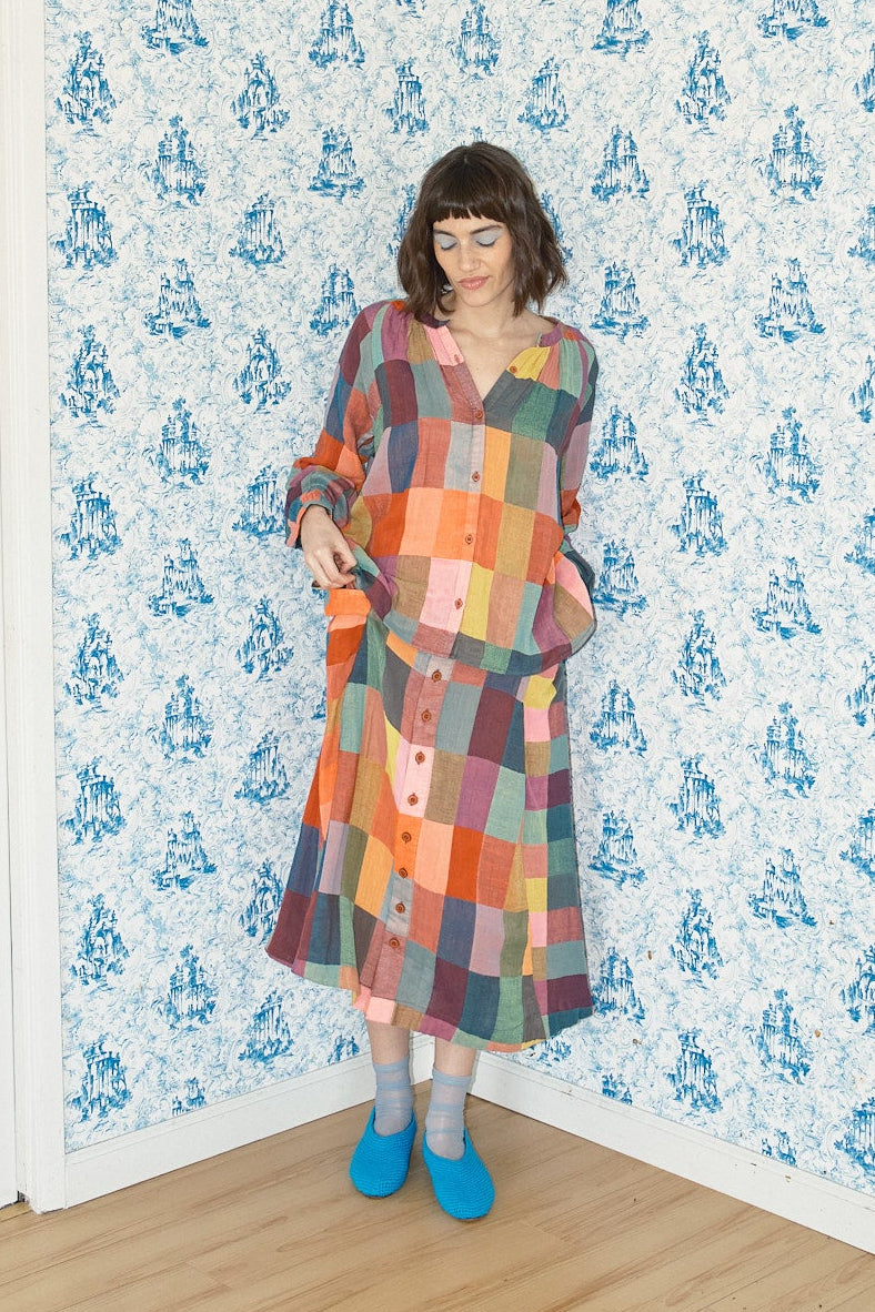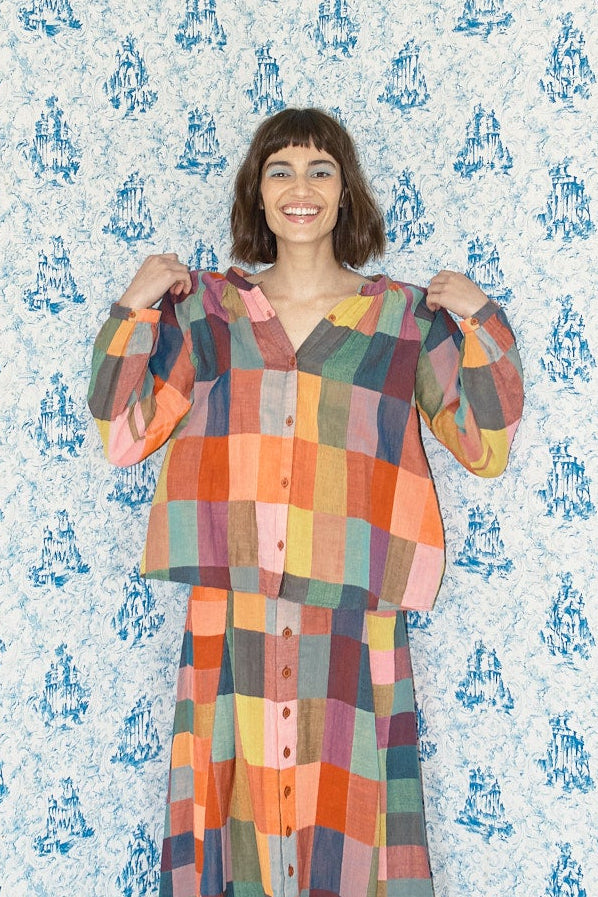 an essential button front blouse with raglan sleeves and a slightly gathered neckline. made in our glossary textile, a super lightweight multicolored doublegauze, featuring a woven rectangular pattern in rich tonal heathered colors.