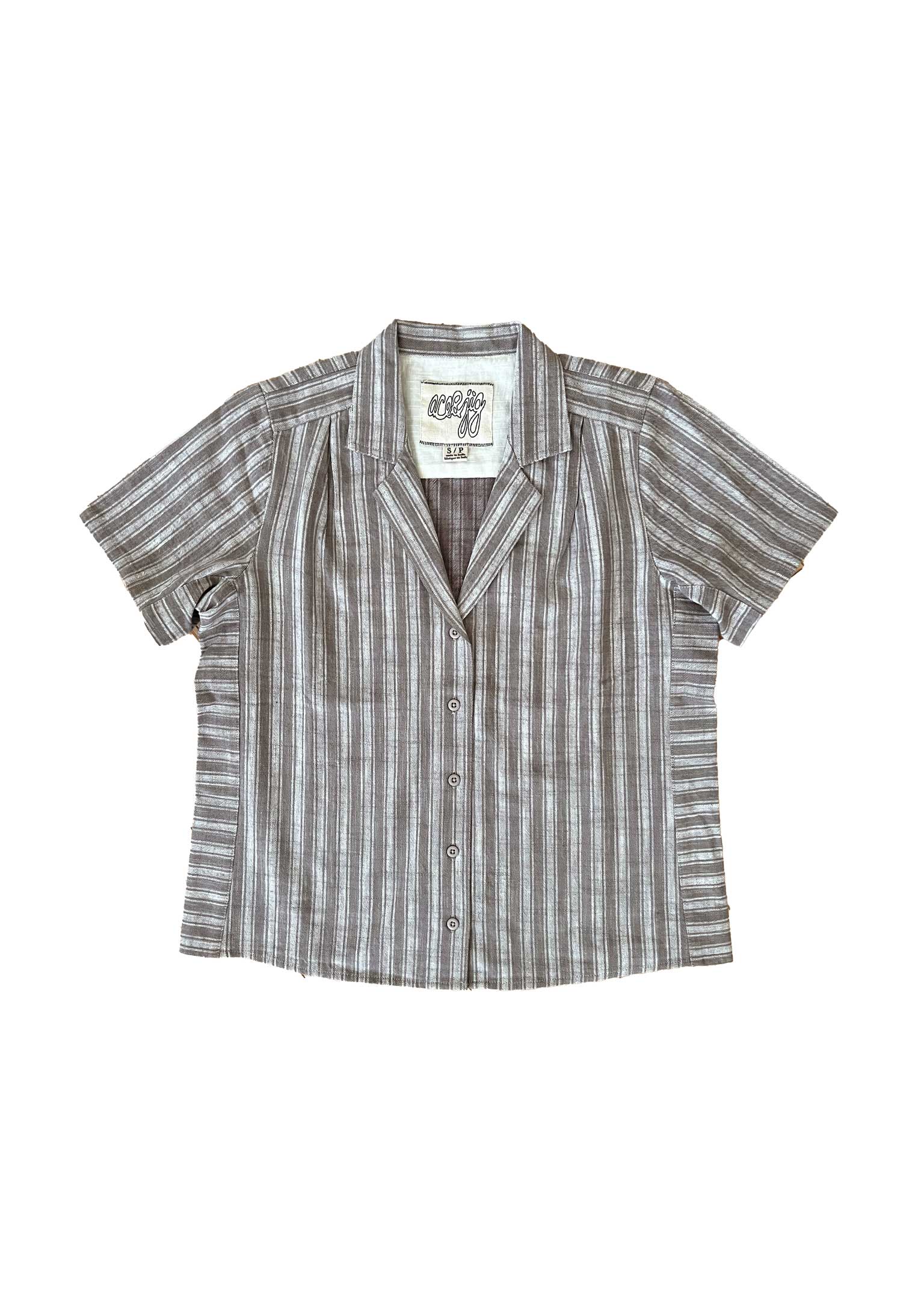 a button-up shirt with a notched collar and short sleeves. think: our classic winnie top with the collar of our murphy top! made in our scribble textile, a midweight woven singlecloth in a warm gray with subtle faded chalky white stripes.
