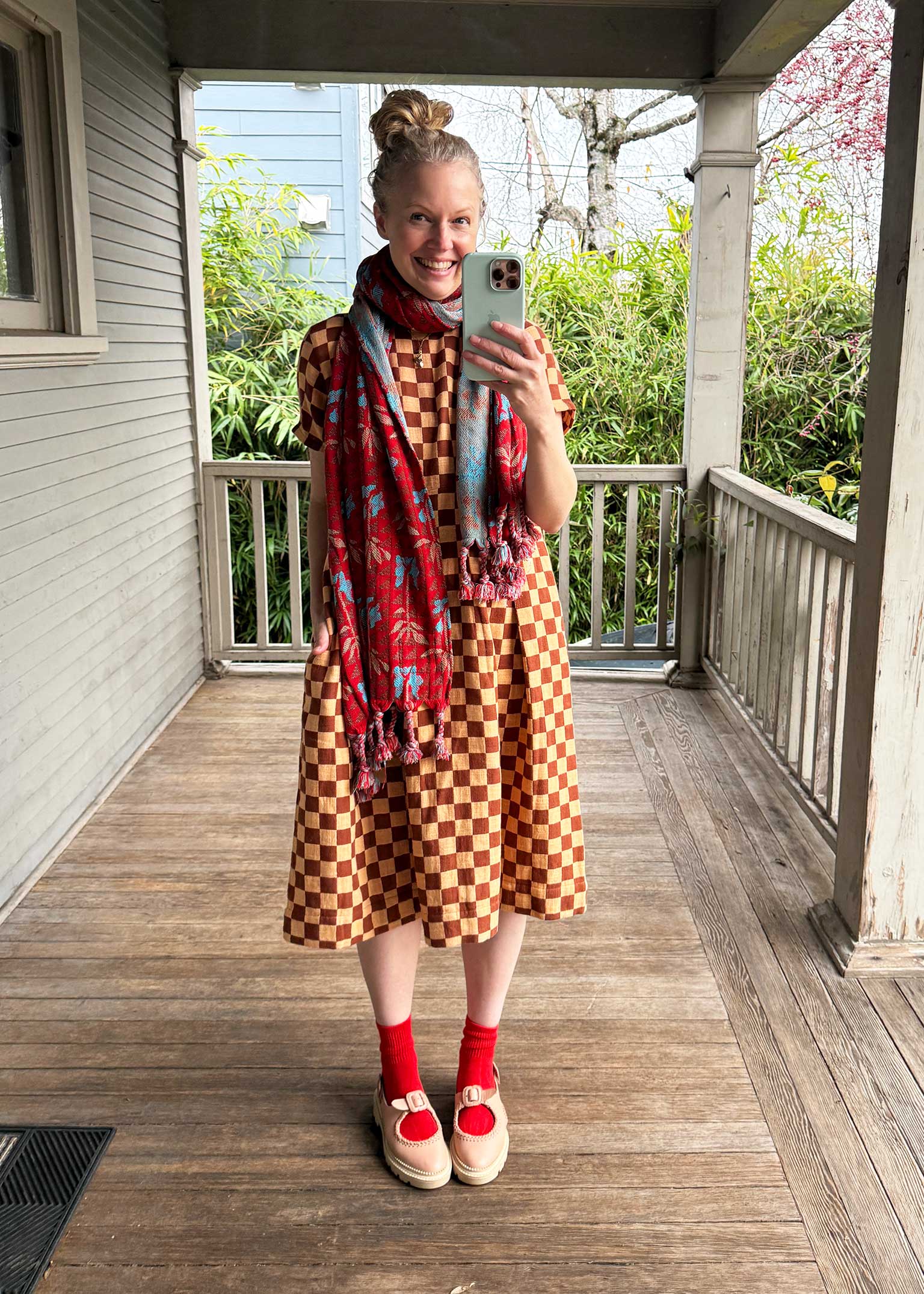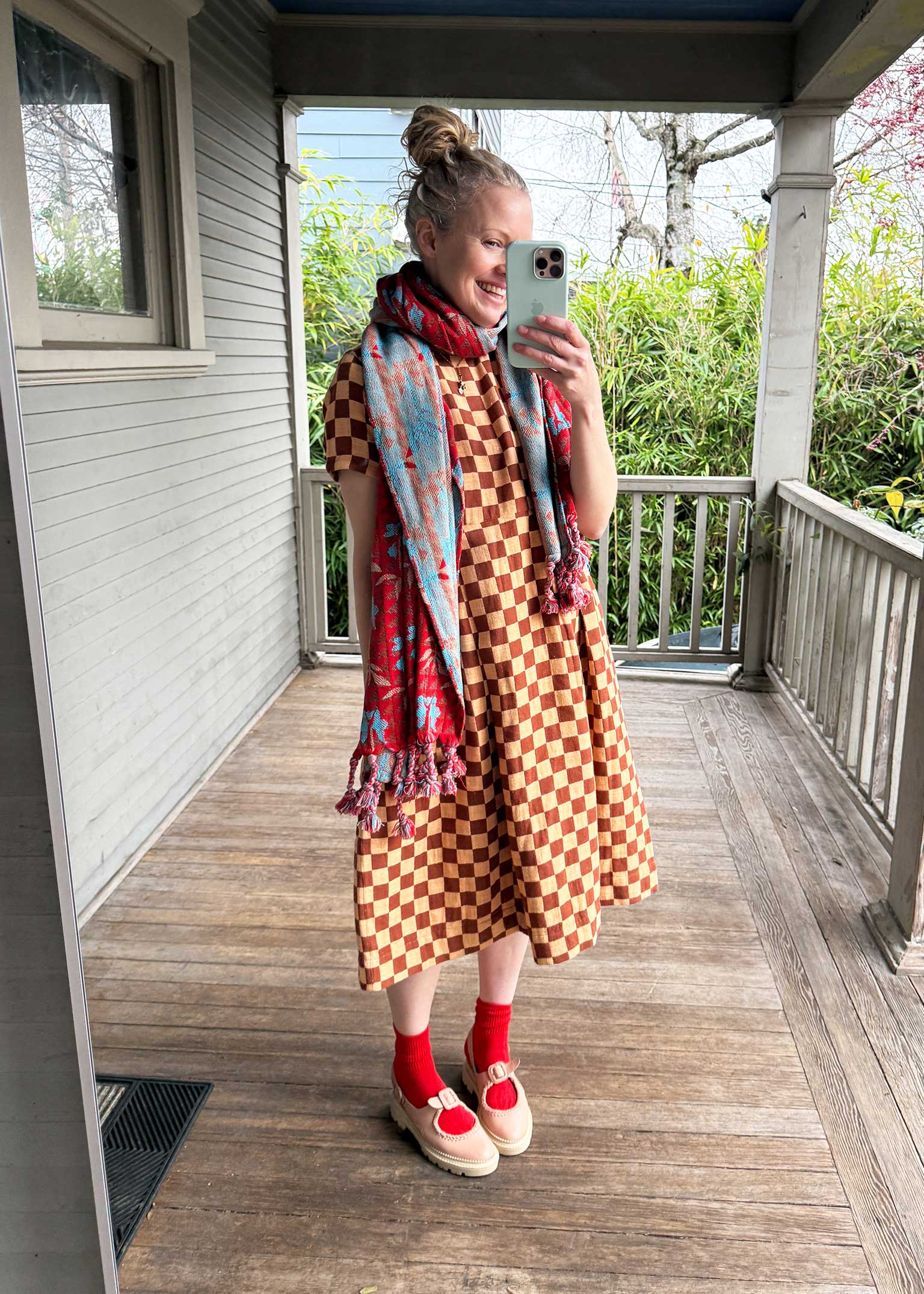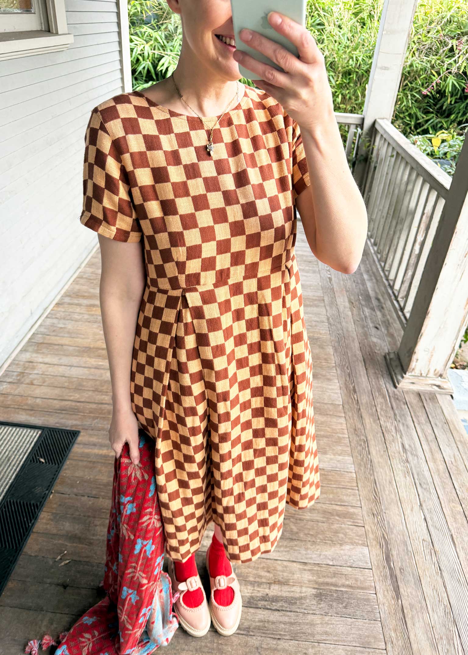 · a short sleeve midi dress with a crew neck, fitted bodice, pleated skirt and side slit pockets. made in our rhyme textile, a lofty supersoft doublecloth featuring a pale peach and cinnamon brown woven checker pattern. this feels like a knit!