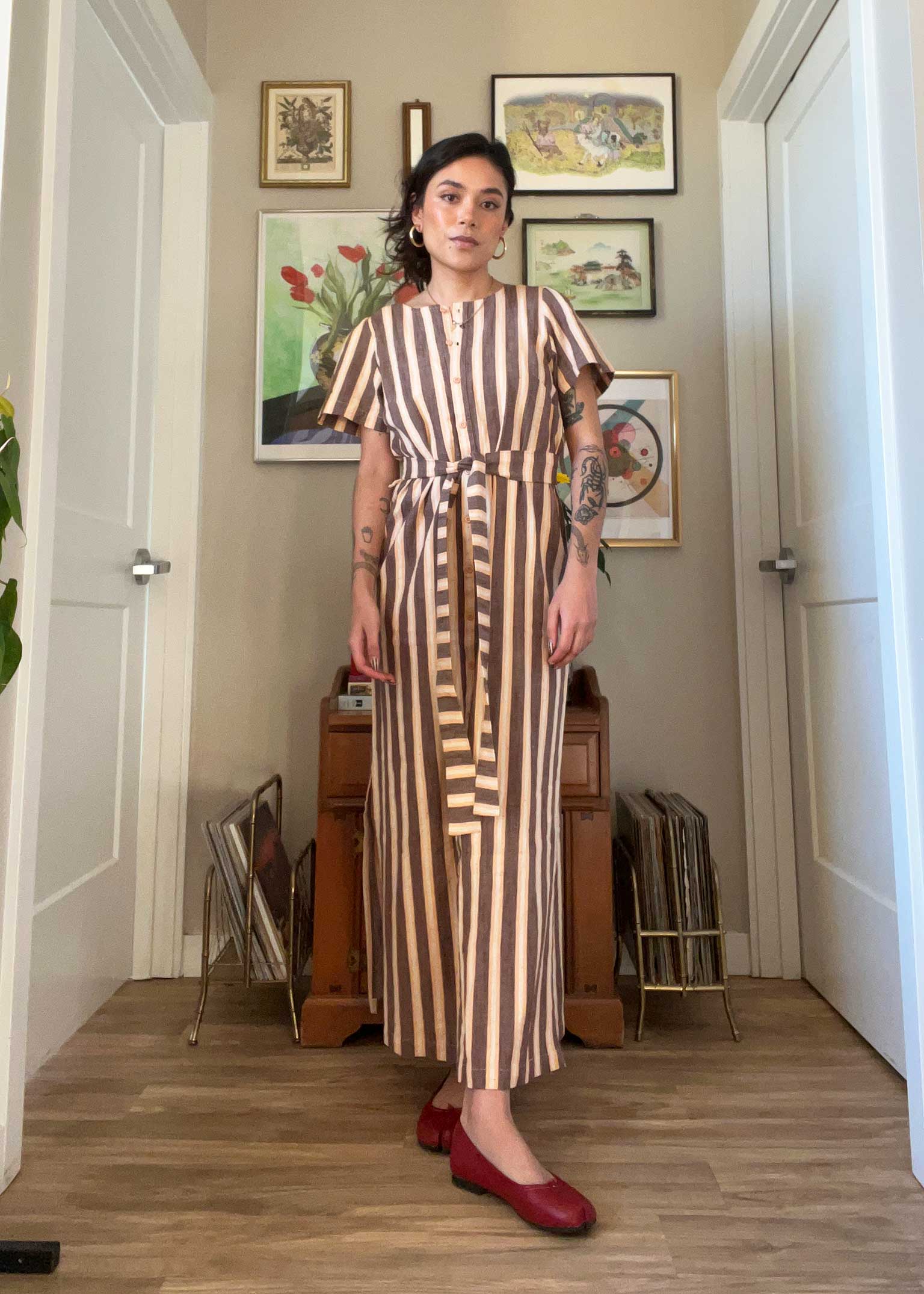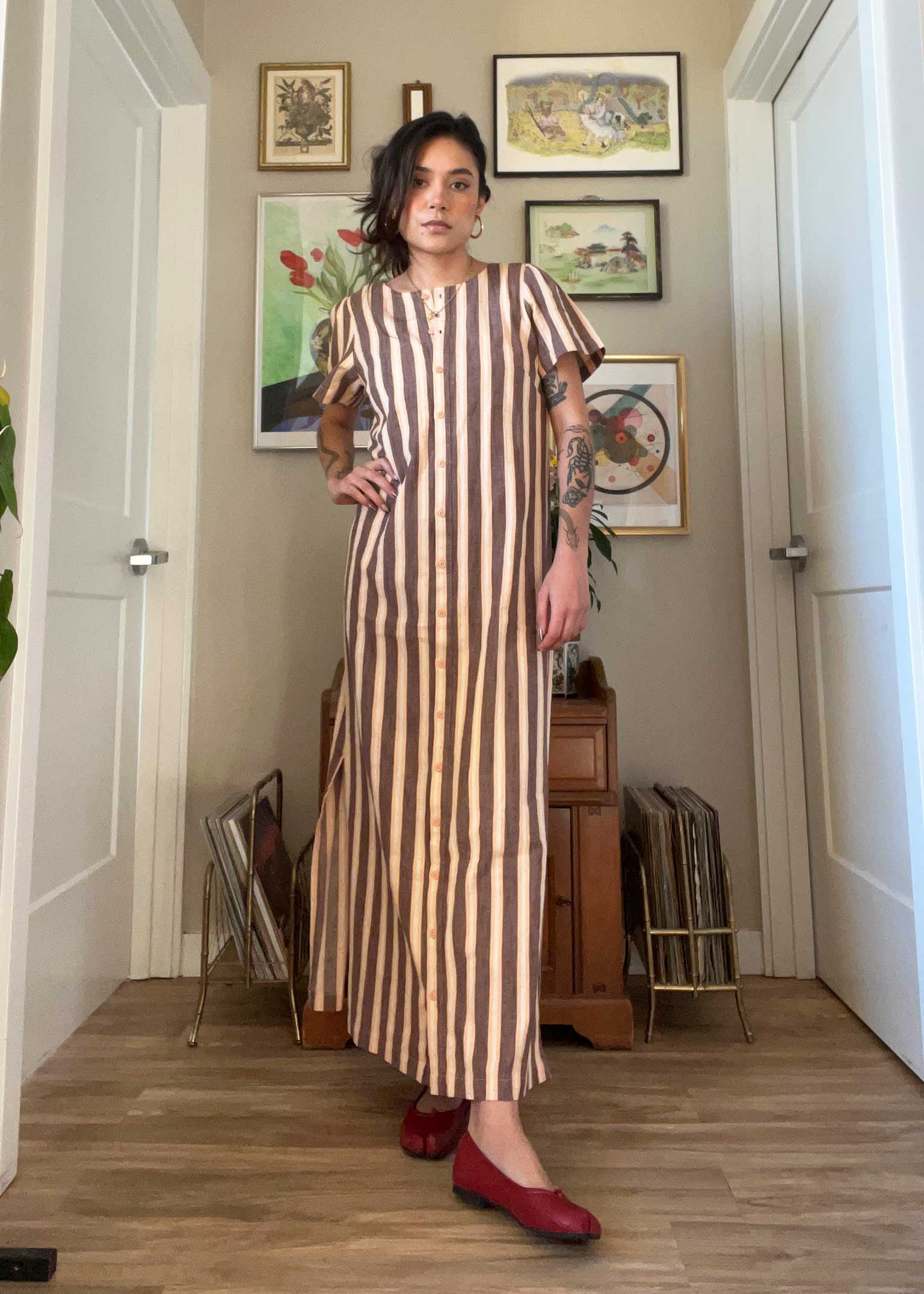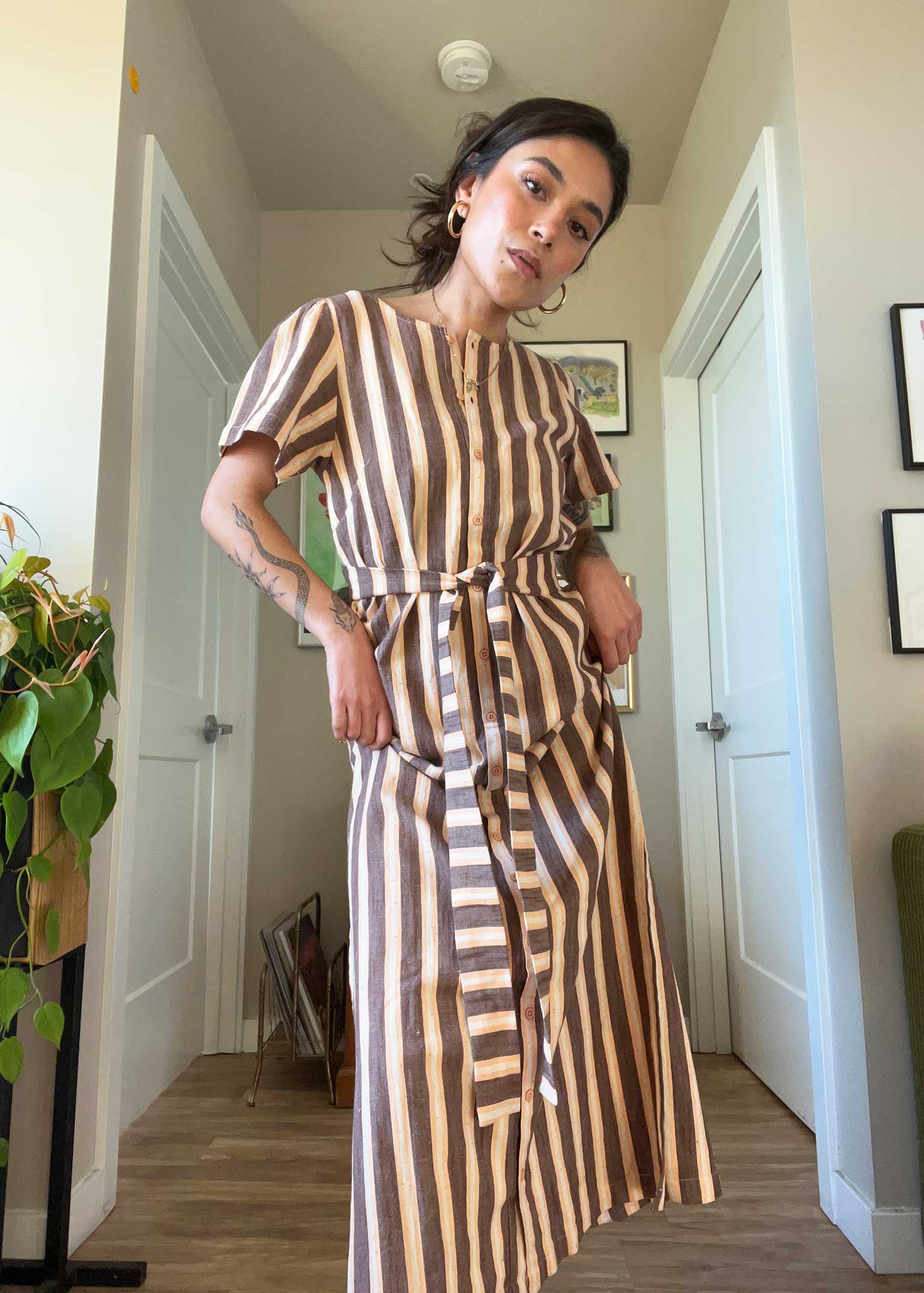 a short sleeve maxidress featuring subtly pleated sleeves, a button front, and a removable fabric belt. made in our crete textile, a  midweight twill singlecloth, featuring woven stripes in cappuccino brown, light peach, and natural, with multicolored flecks throughout.