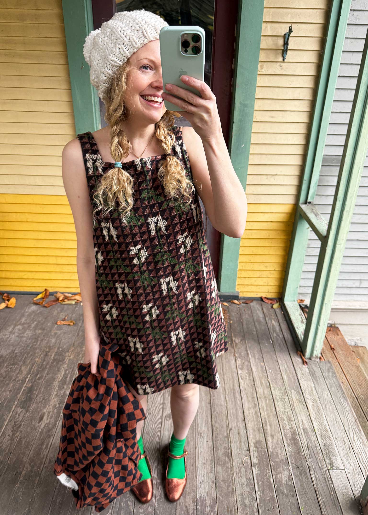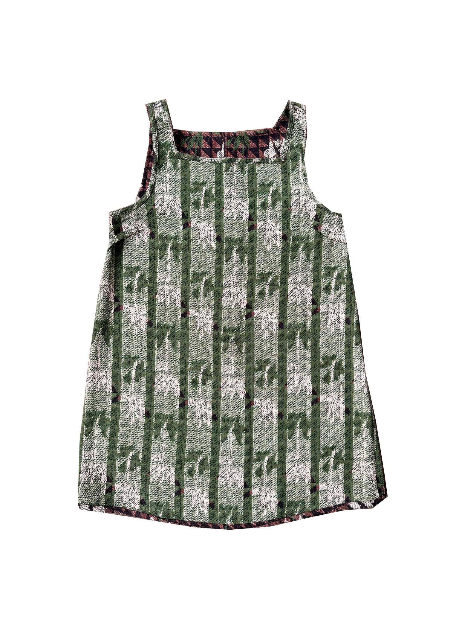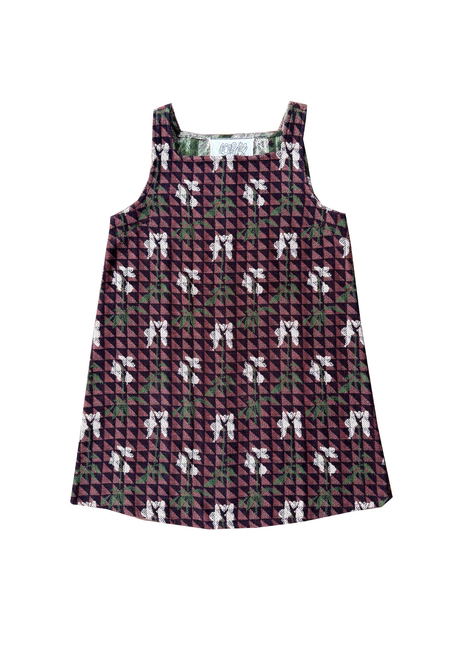 a sleeveless, reversible a-line minidress with a center back seam and subtle darting at the chest. made in our atrium textile, a luxe supersoft substantial textile with woven lily motifs in cream and green atop black and brown triangles.