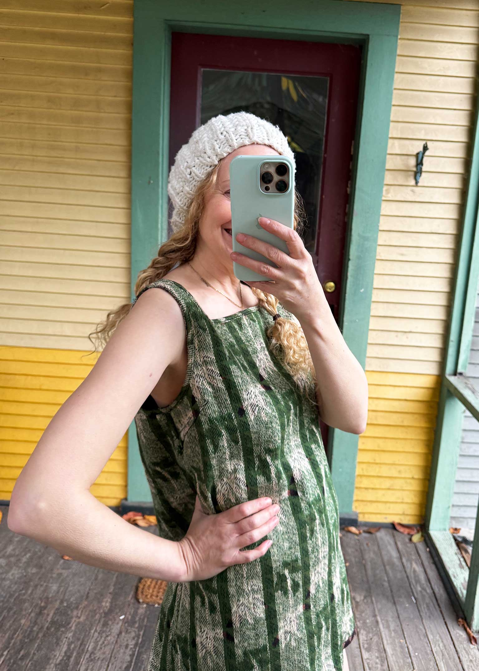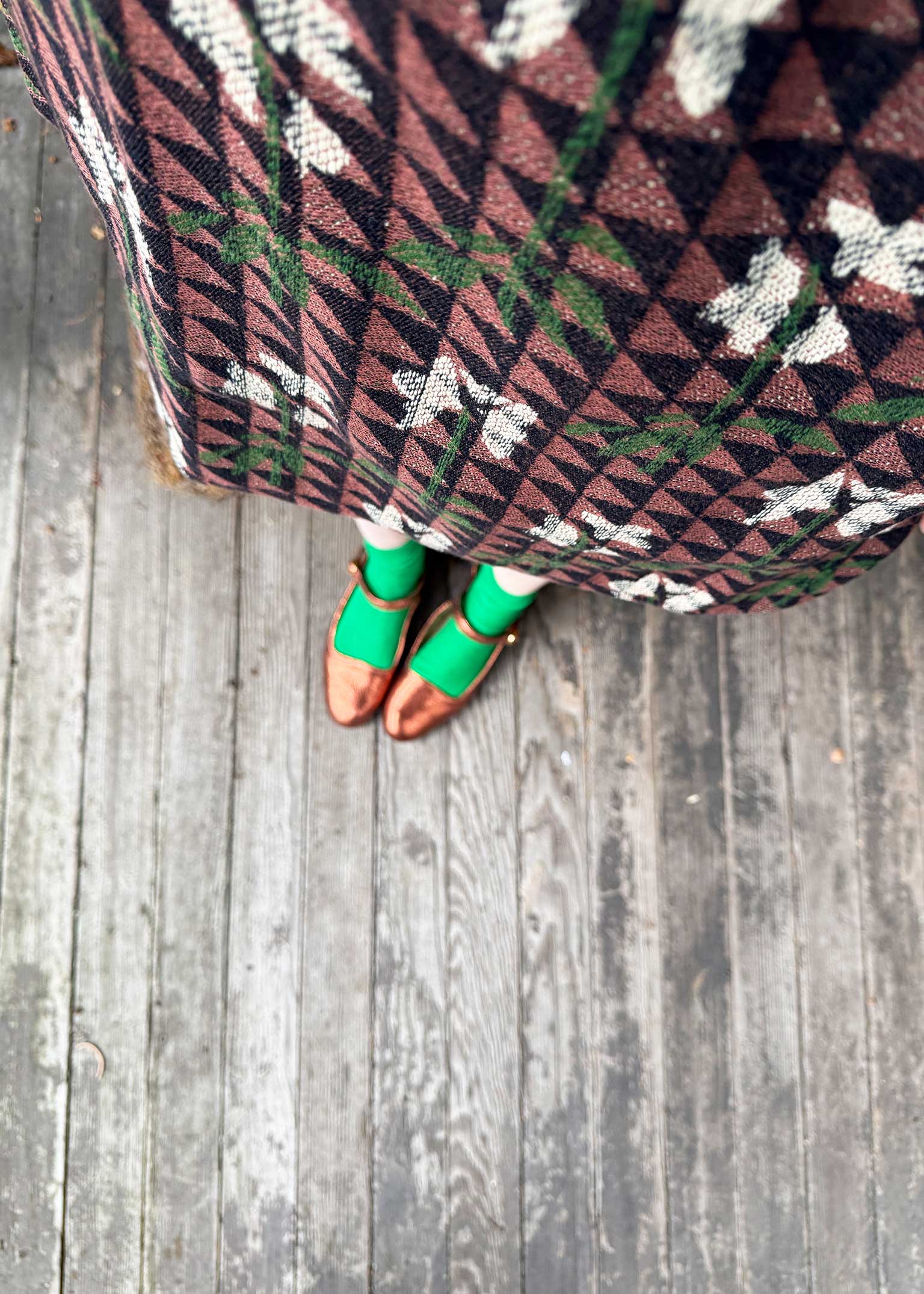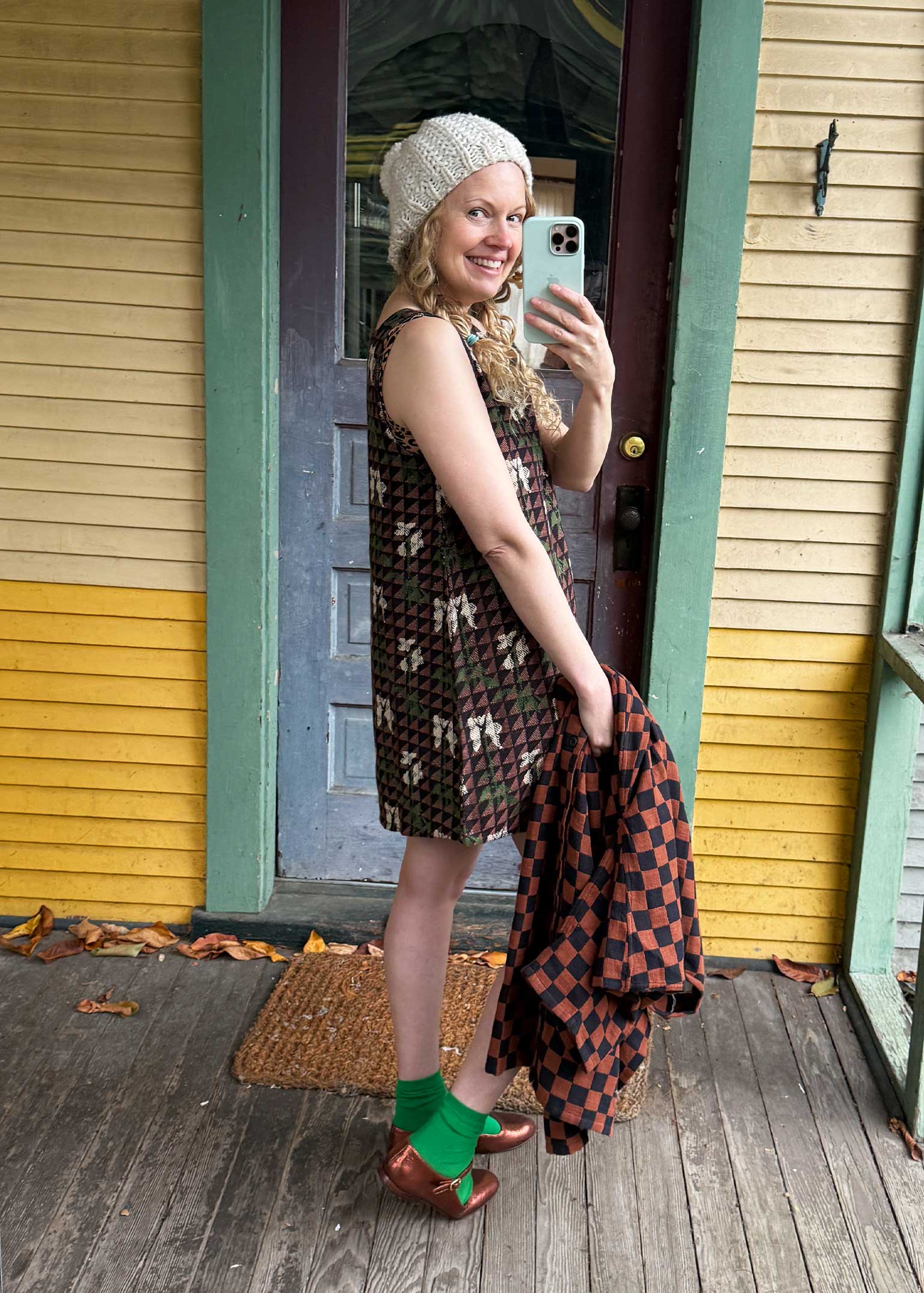 a sleeveless, reversible a-line minidress with a center back seam and subtle darting at the chest. made in our atrium textile, a luxe supersoft substantial textile with woven lily motifs in cream and green atop black and brown triangles.