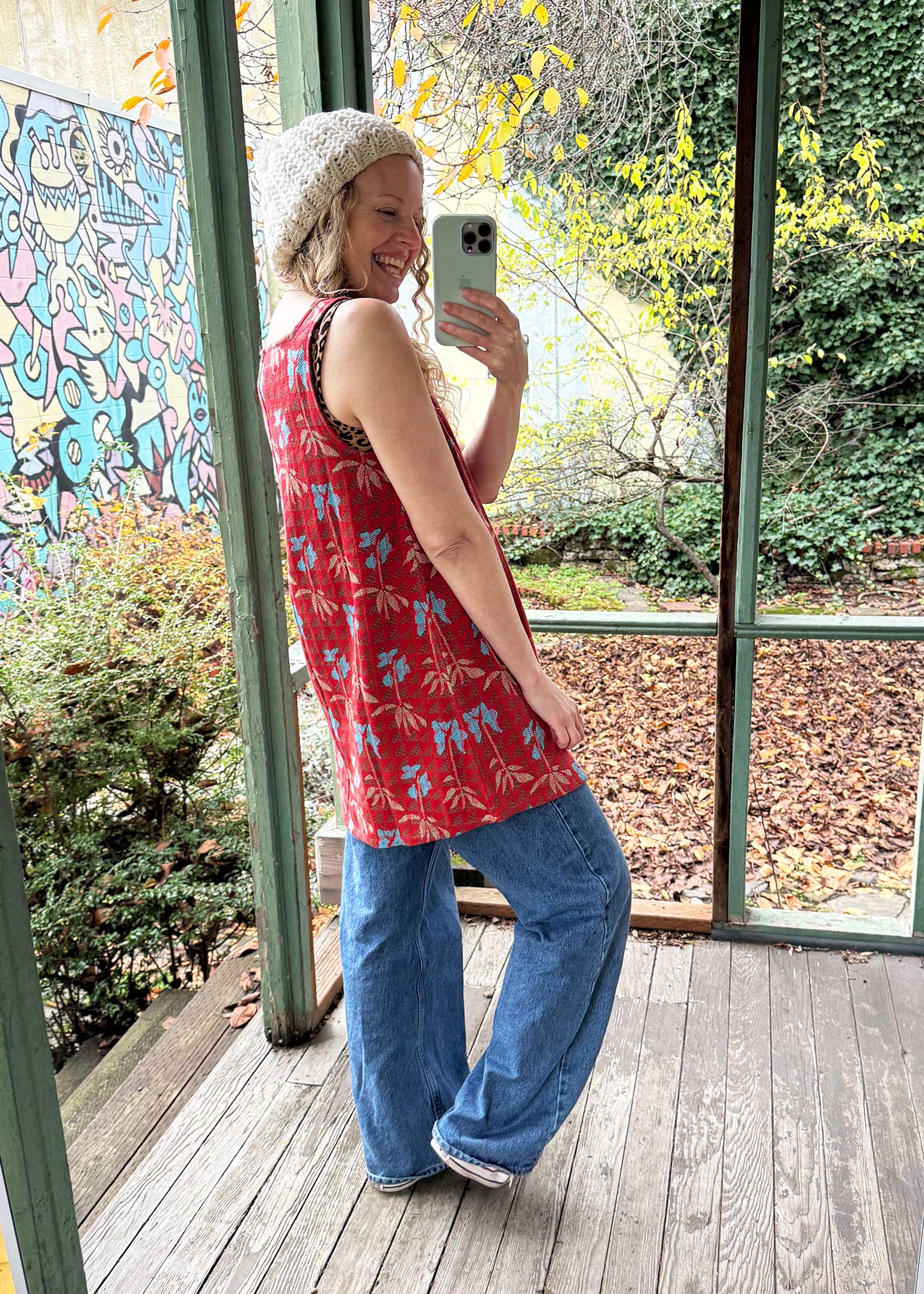 a sleeveless, reversible a-line minidress with a center back seam and subtle darting at the chest. made in our birdcage textile, a luxe supersoft substantial textile with woven lily motifs in peach and cyan atop red and umber triangles.