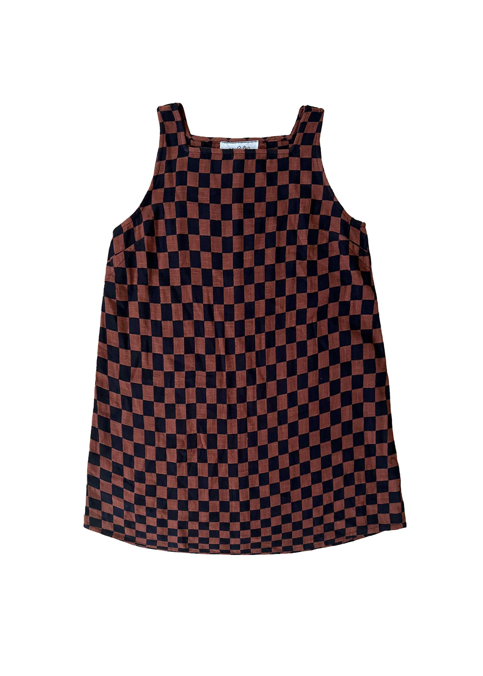 a sleeveless a-line minidress with a center back seam and subtle darting at the chest. made in our reason textile, a lofty supersoft doublecloth featuring a black and cinnamon brown woven checker pattern. this feels like a knit!
