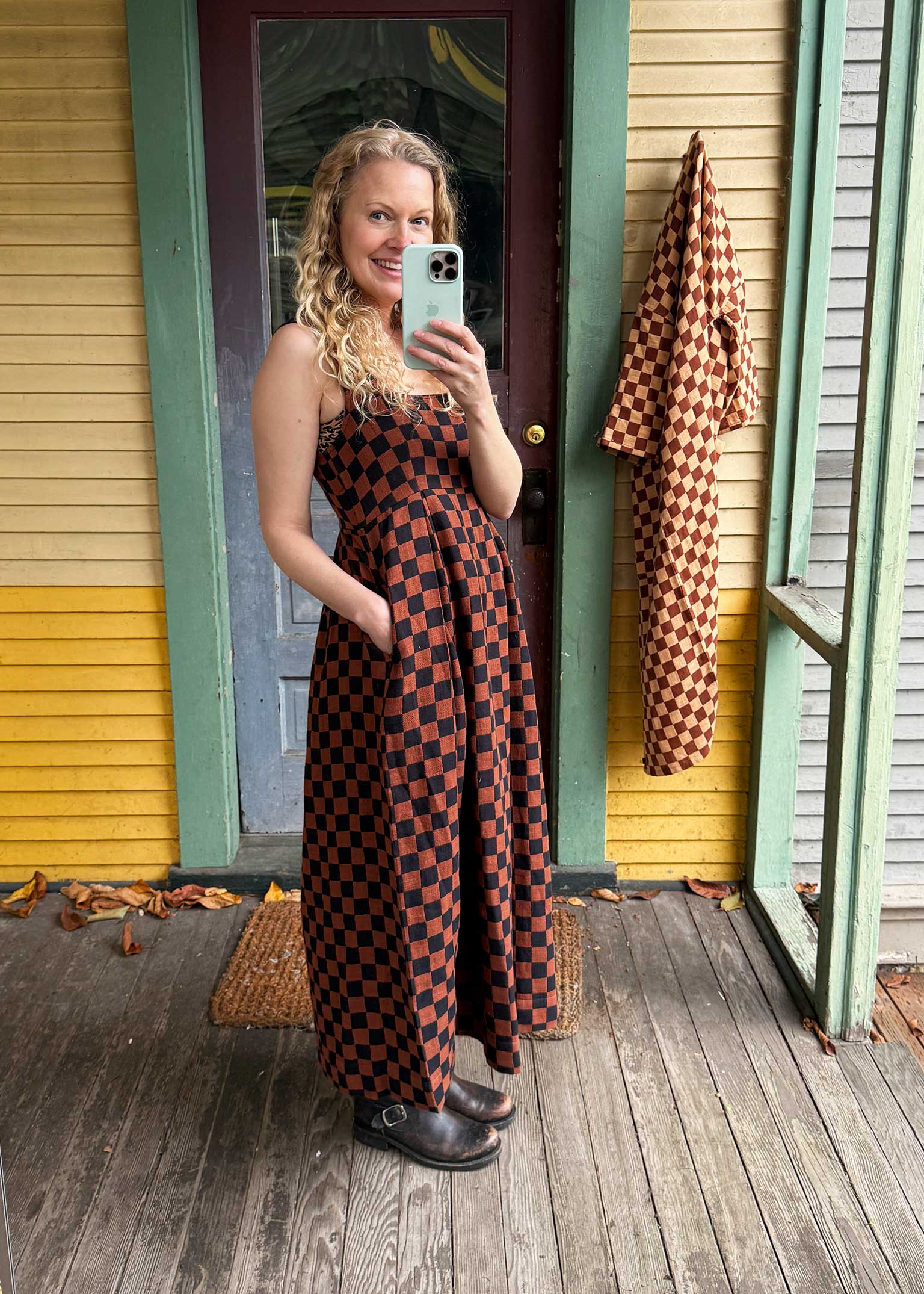 a sleeveless dress with a square neck, fitted bodice, smocked back, and pleated skirt that falls around the ankles. made in our reason textile, a lofty supersoft doublecloth featuring a black and cinnamon brown woven checker pattern. this feels like a knit!
