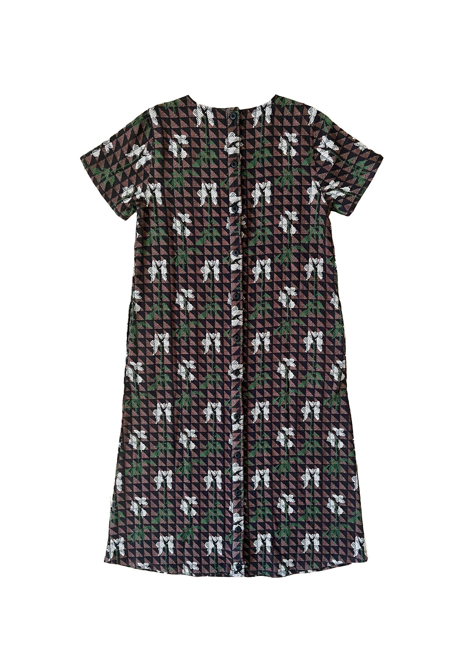 a short-sleeve a-line midi length dress with a button back. think of our Layla Dress, but with short sleeves! made in our atrium textile, a luxe supersoft substantial textile with woven lily motifs in cream and green atop black and brown triangles.