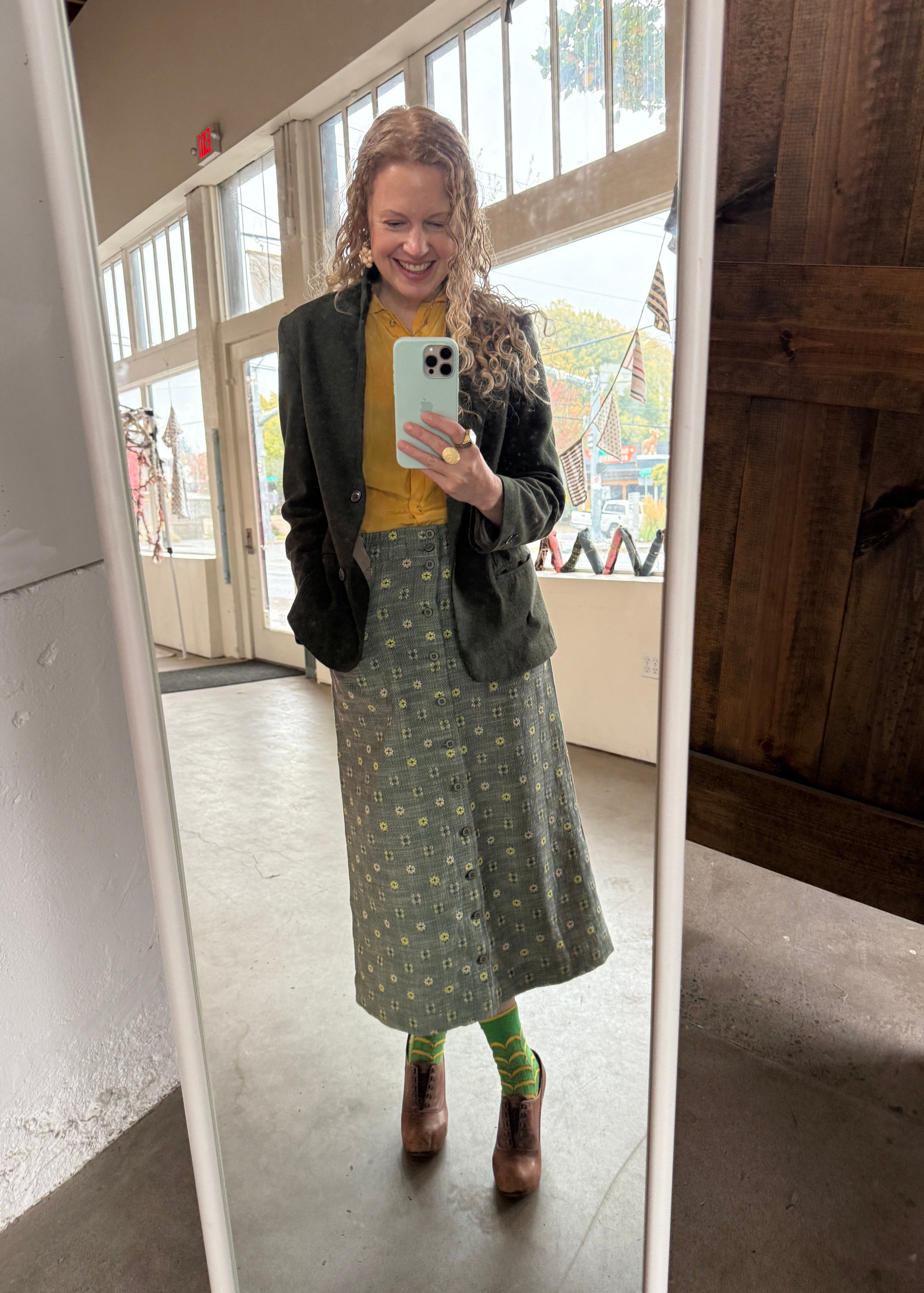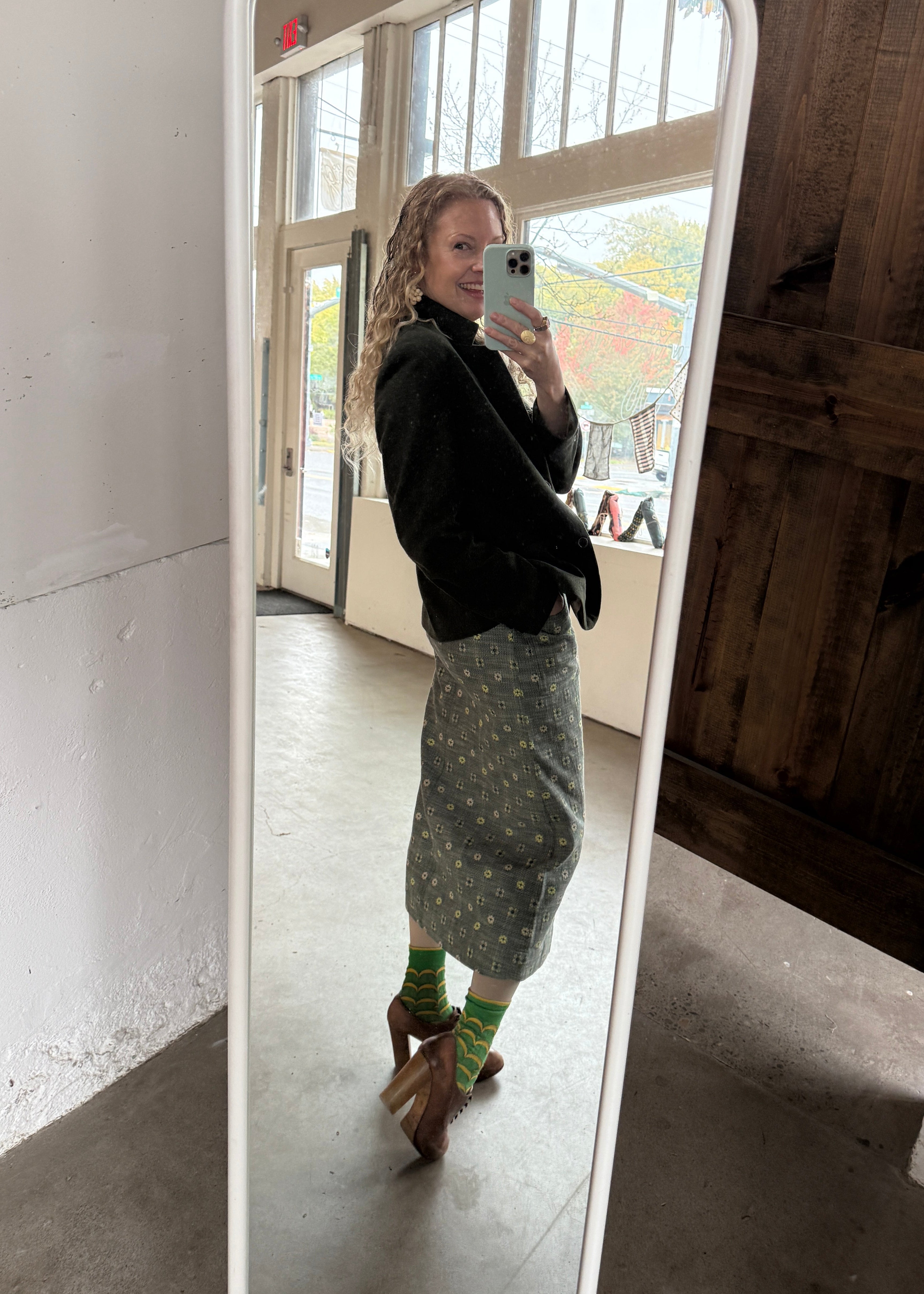 a high-waisted midi length skirt with a button front, partially elasticated waist, and front patch pockets. made in our willow textile, a midweight twill singlecloth in a faded fatigue green, featuring small woven floral motifs in cream and lime.
