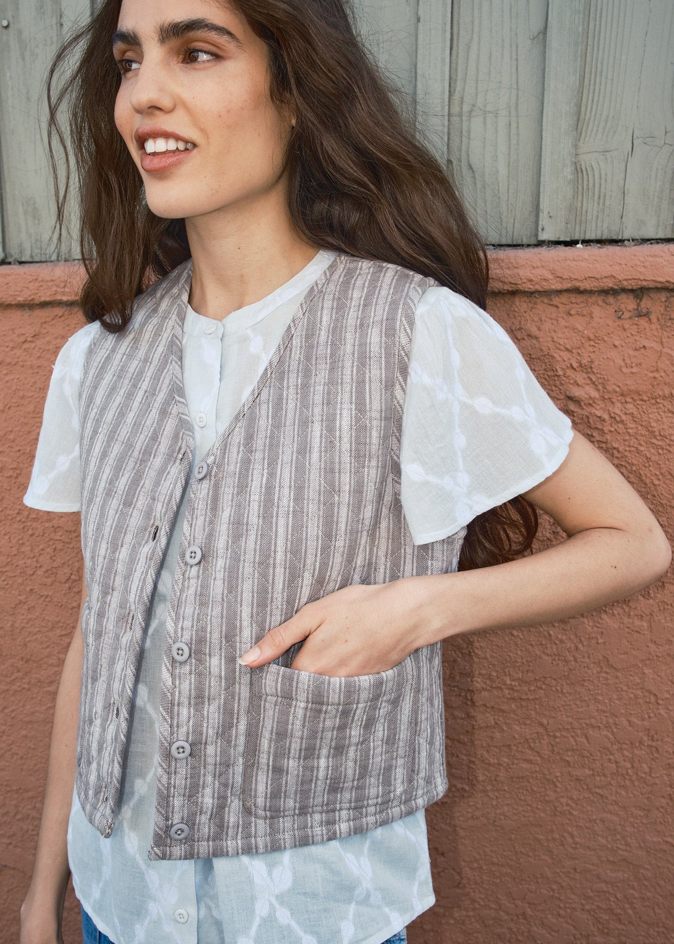 a fully reversible, quilted version of our classic vest! a simple v-neck button-front vest that can be worn alone or layered.made in our scribble textile, a midweight woven singlecloth in a warm gray with subtle faded chalky white stripes. reverses to our trivia textile!