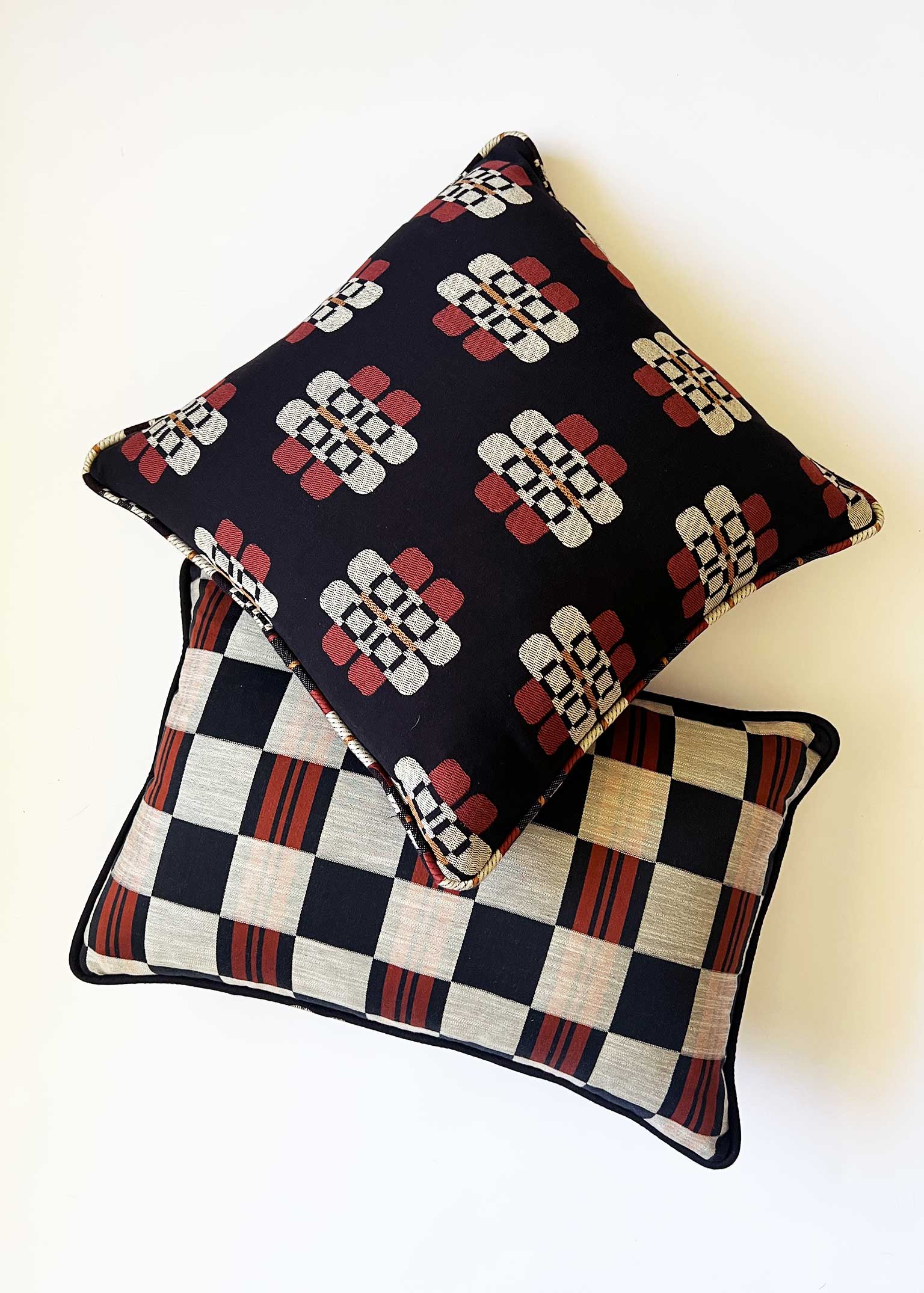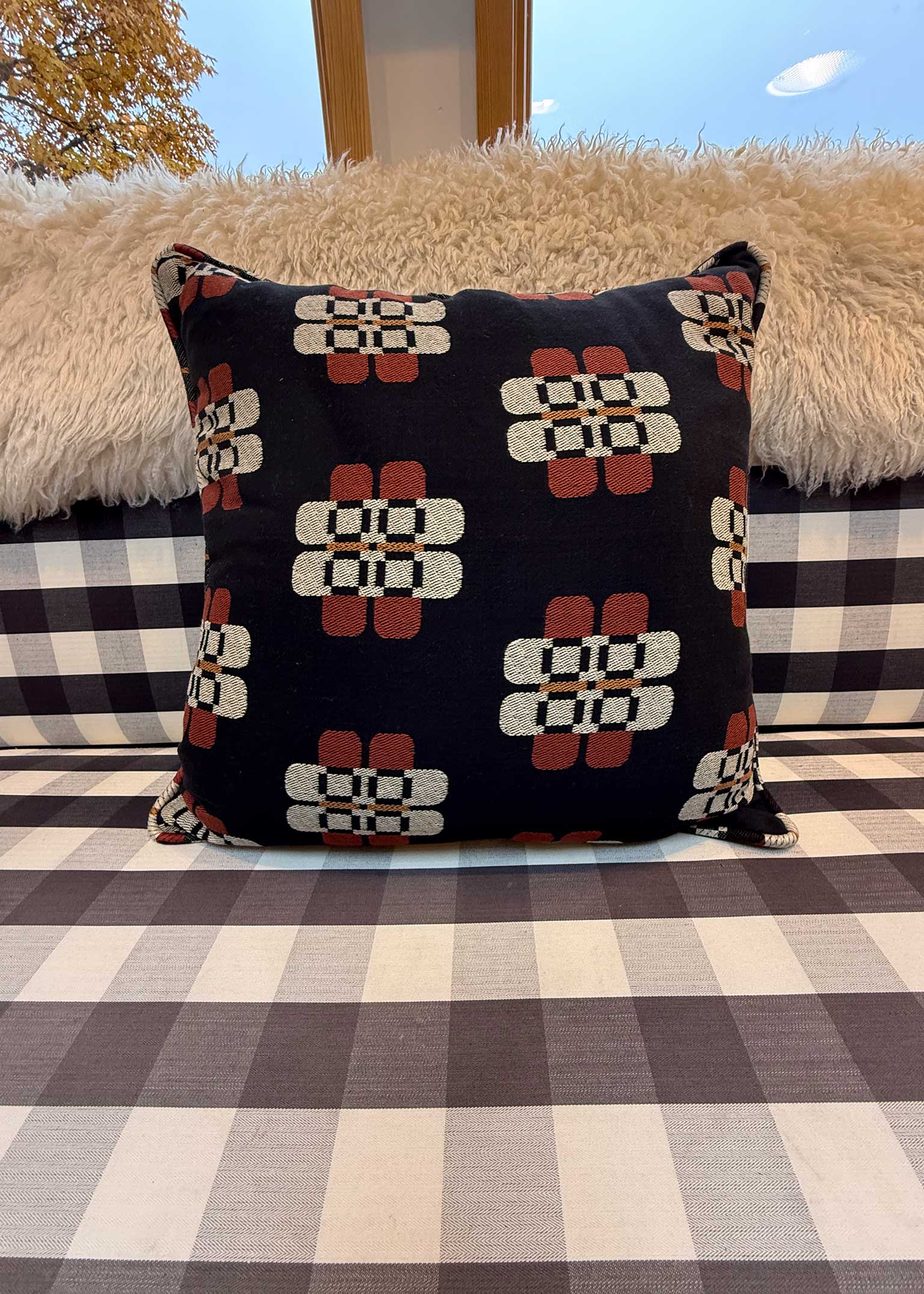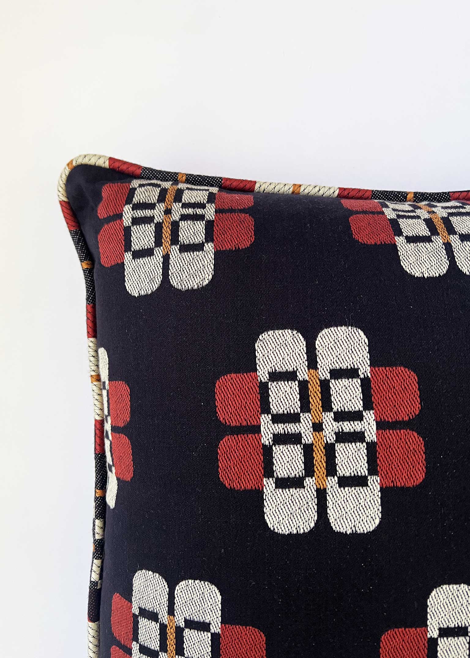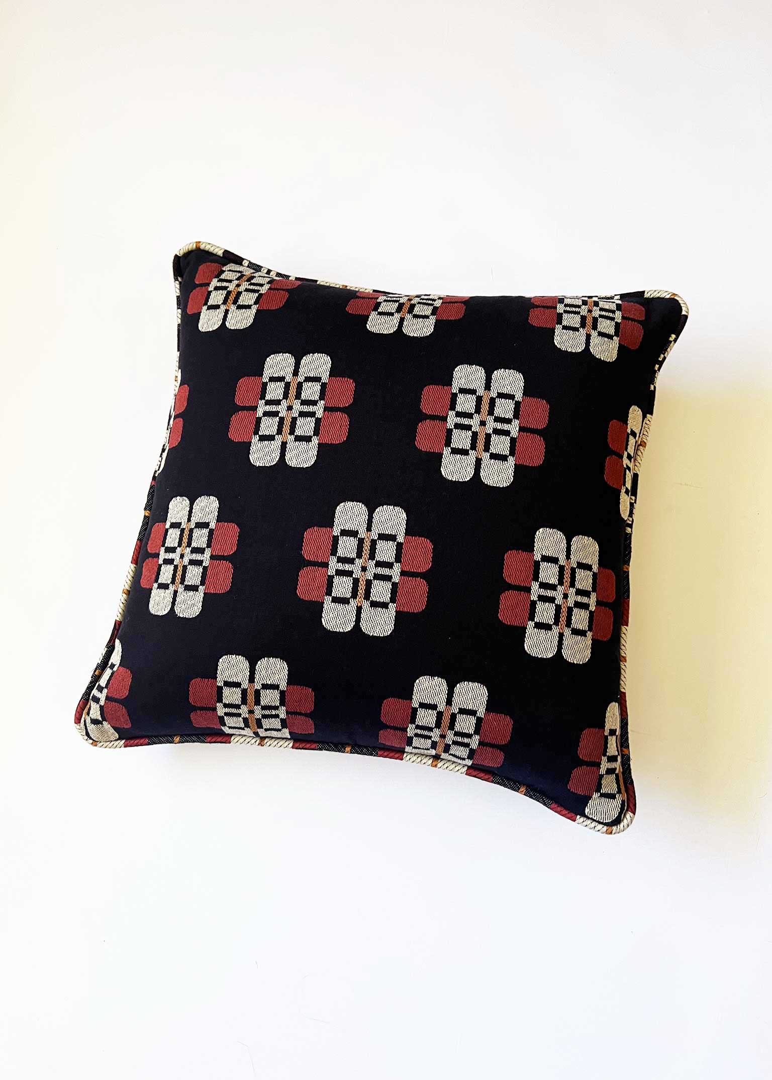 lotus - a luxe black midweight singlecloth with woven flower patterns in rust red, natural, and ochre.