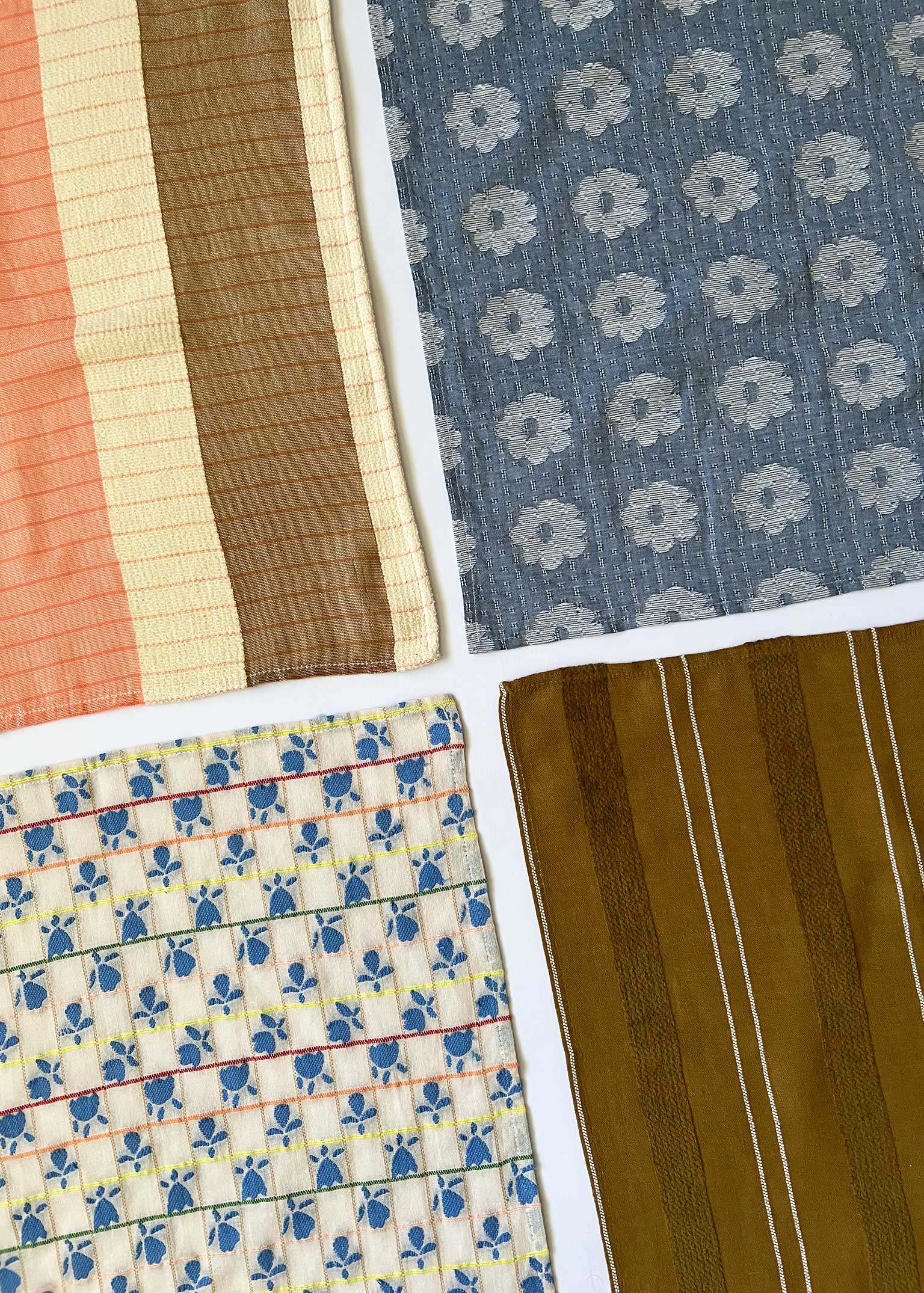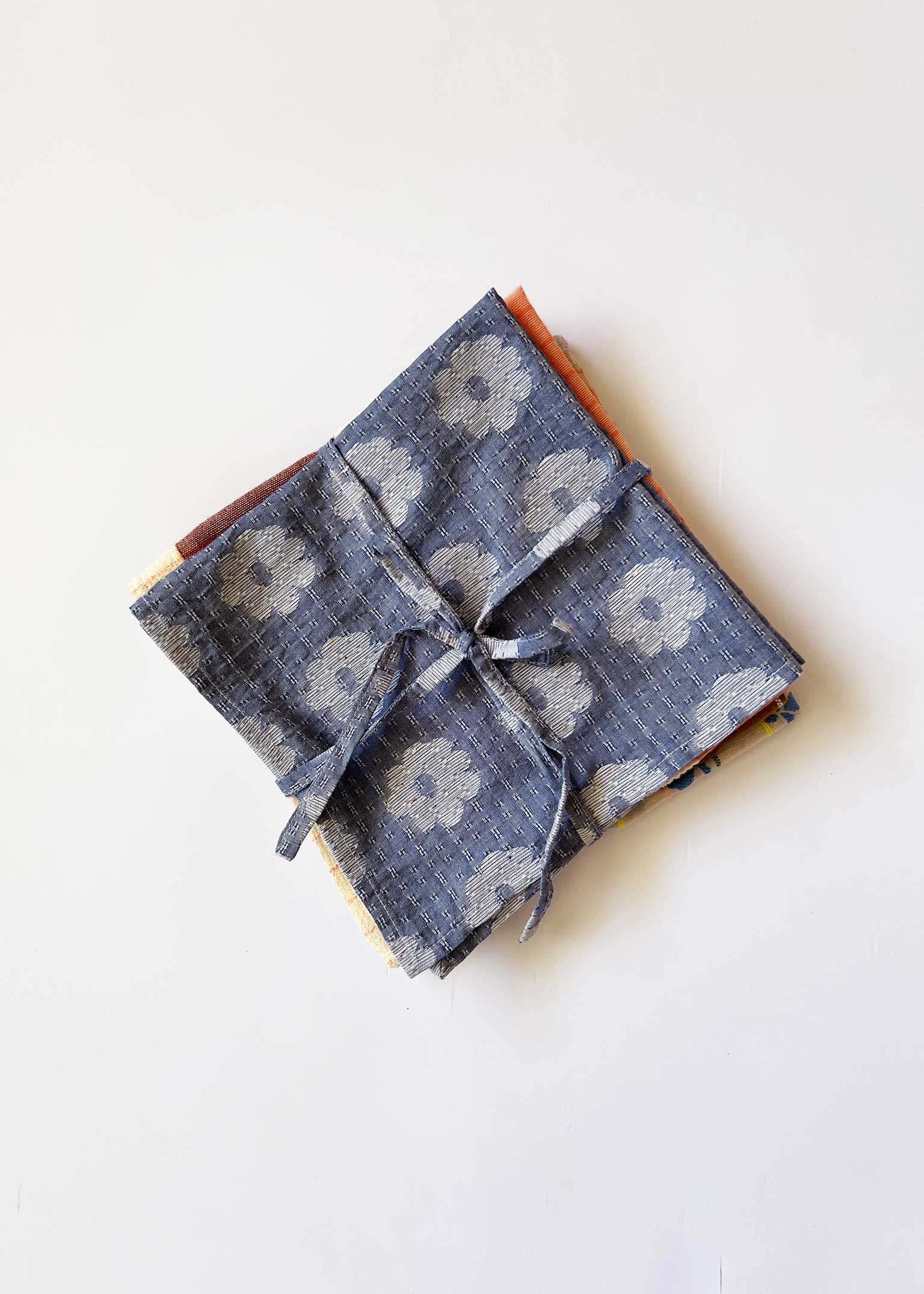 a set of four napkins made from an assortment of our leftover yarn dye woven textiles in keeping with our commitment to reducing textile waste. made in our sunprint textile, a lightweight chambray blue singlecloth featuring woven flower motifs in a speckled natural.