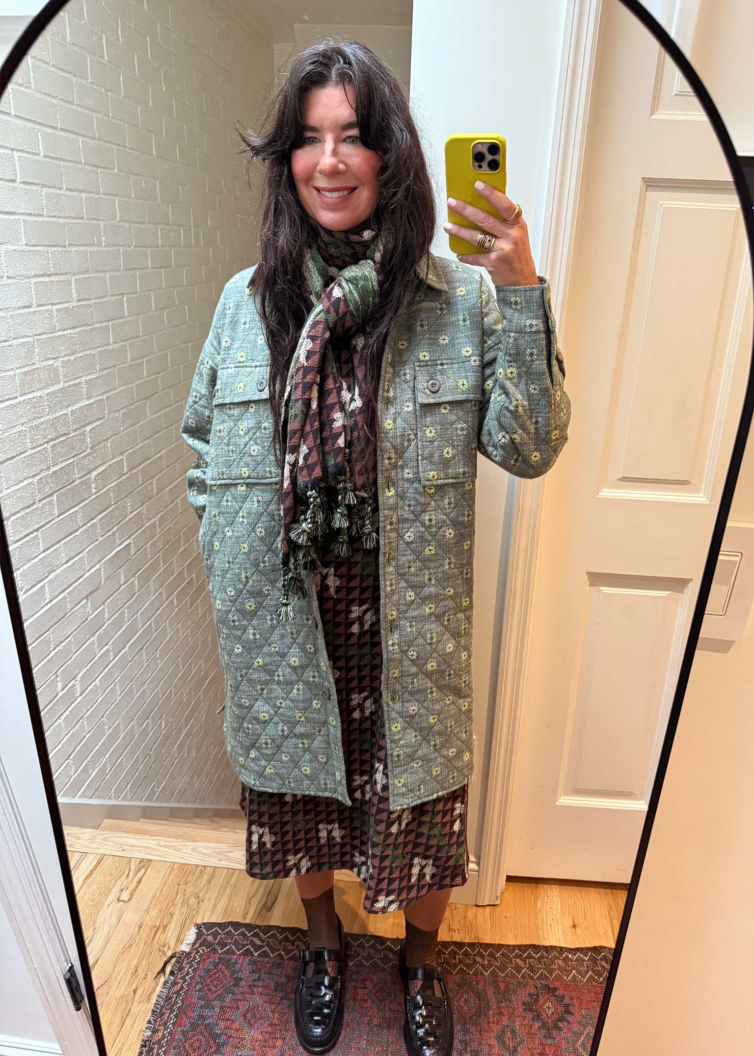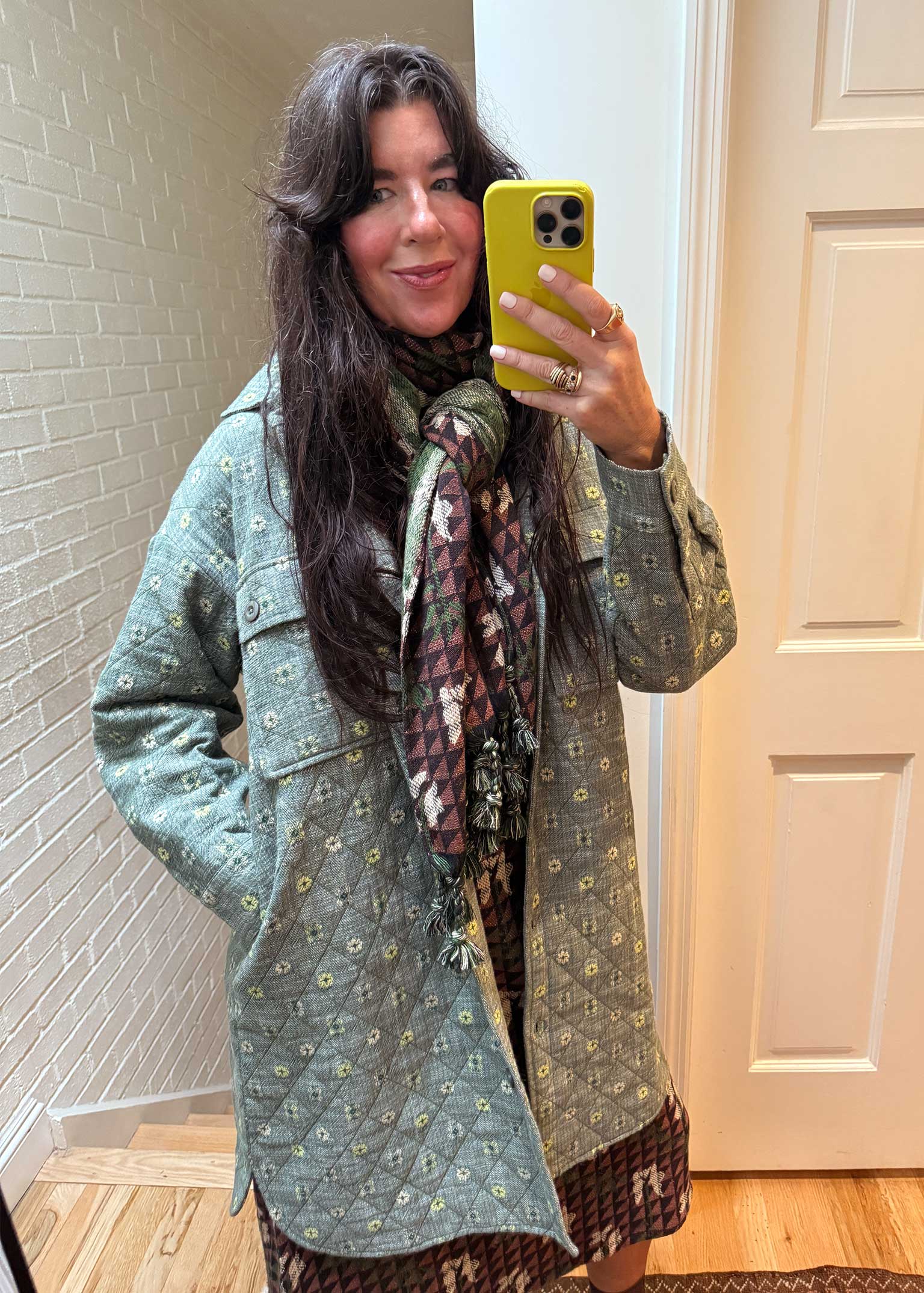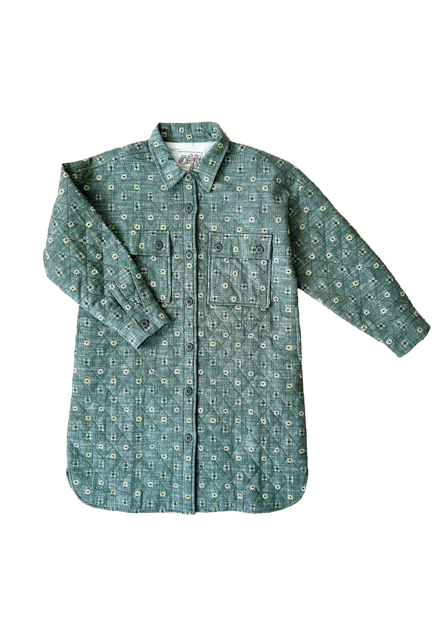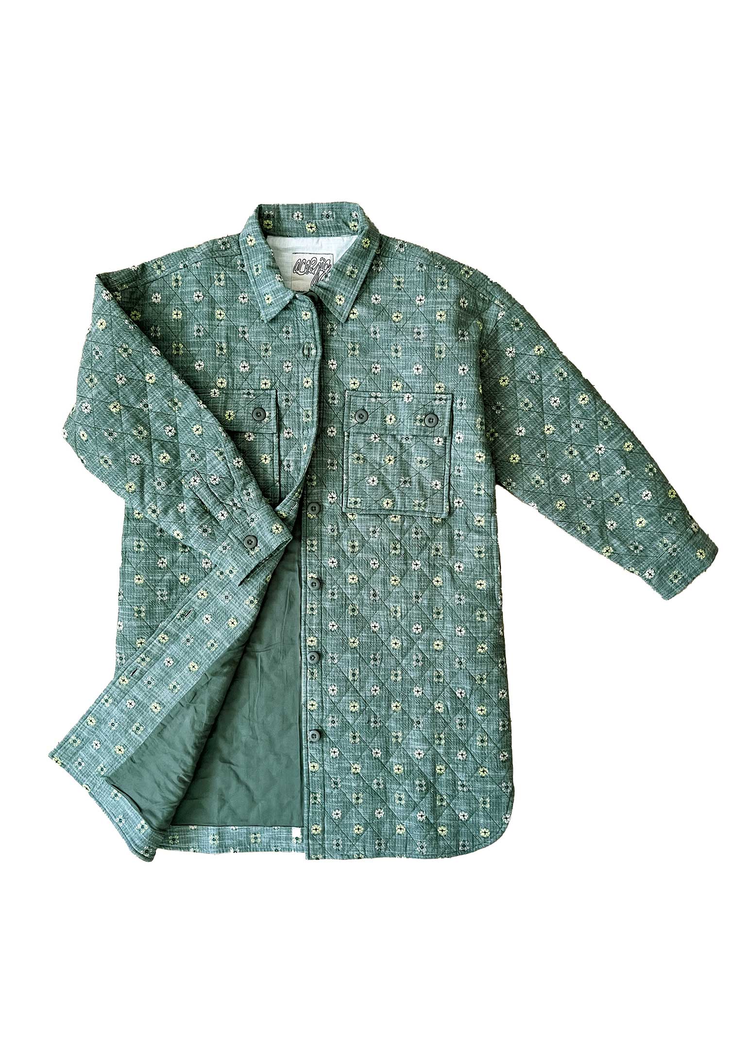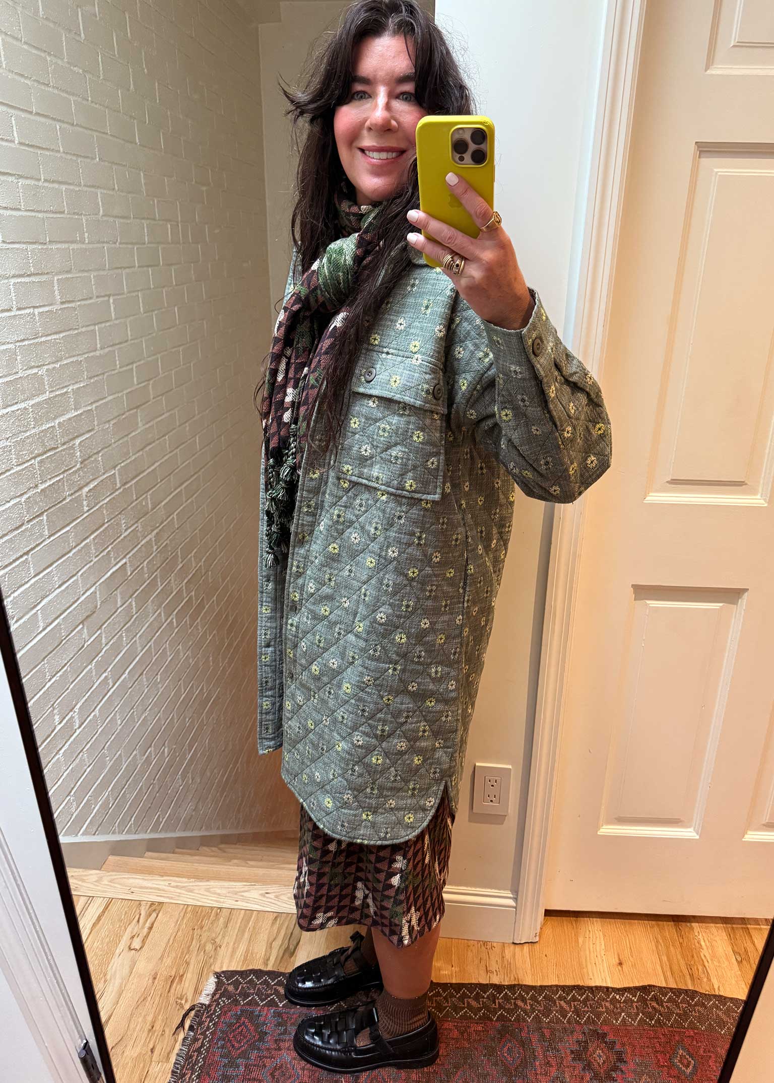 a fully lined quilted overcoat with a foldover collar, a button front, and patched and side slit pockets. made in our willow textile, a midweight twill singlecloth in a faded fatigue green, featuring small woven floral motifs in cream and lime.