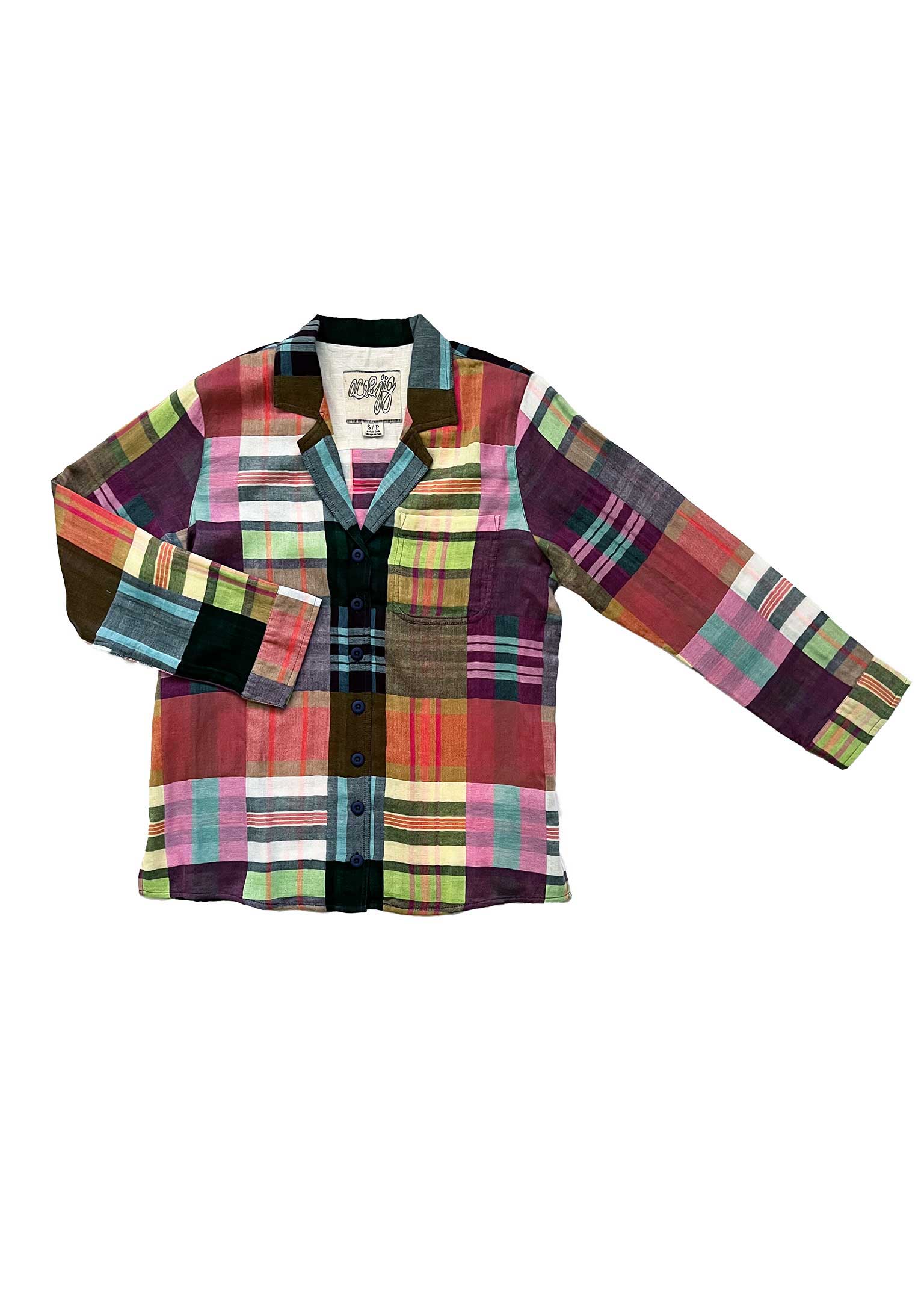 a long sleeve button-up pajama-style top with a notched collar and side slits. made in our paintbox textile, a supersoft lightweight luxe doublegauze featuring a complex multicolored plaid in rich hues.