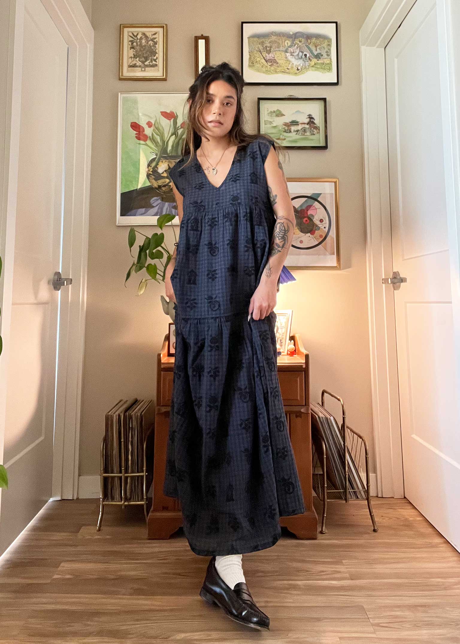 a maxi dress with a v-neck front, empire waist, tiered skirt, side slits and removable fabric belt. made in our trinket textile, a very lightweight textured singlecloth featuring a dark blue and dark gray check with black motifs woven throughout. reminiscent of cross-stitch embroidery!
