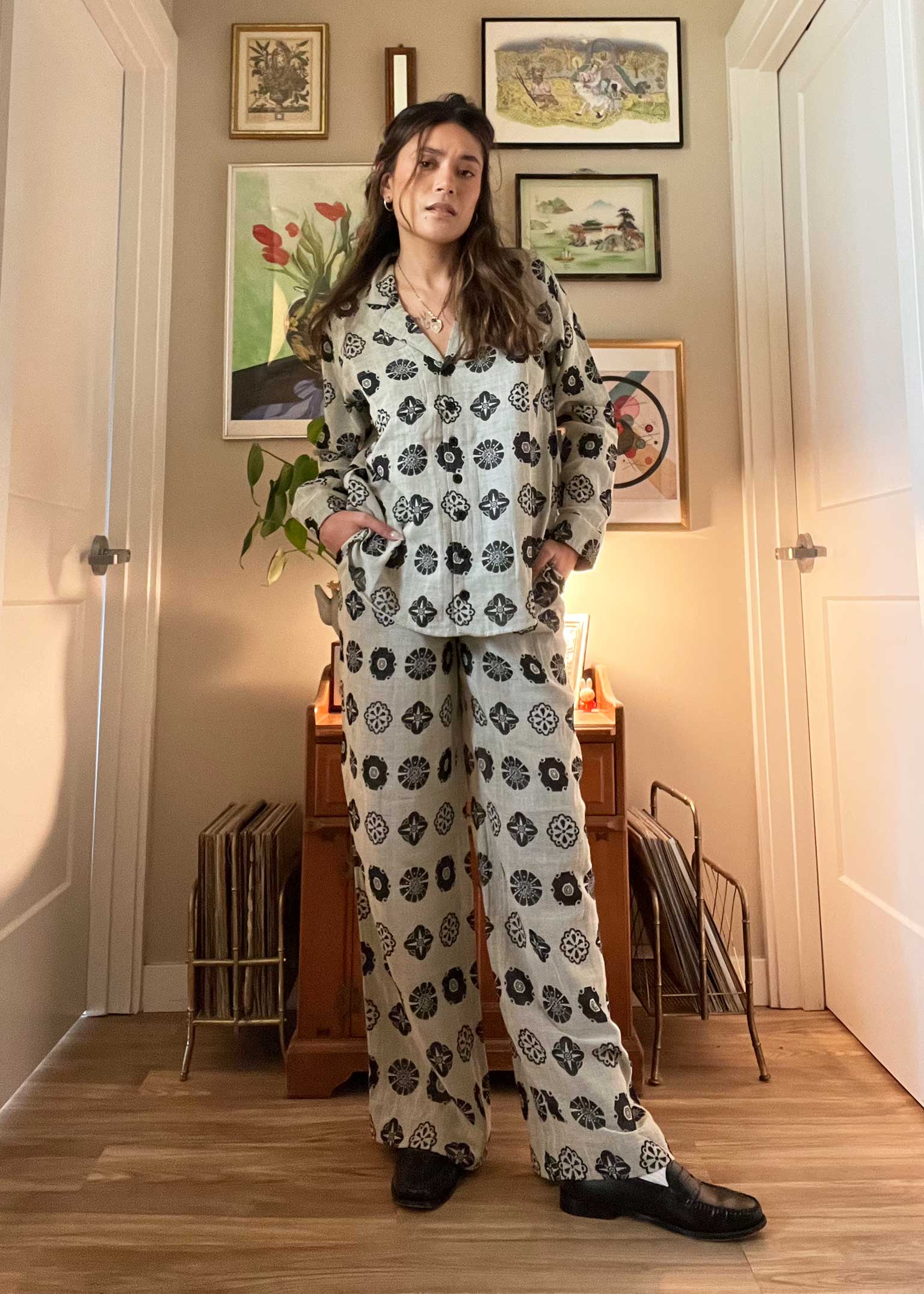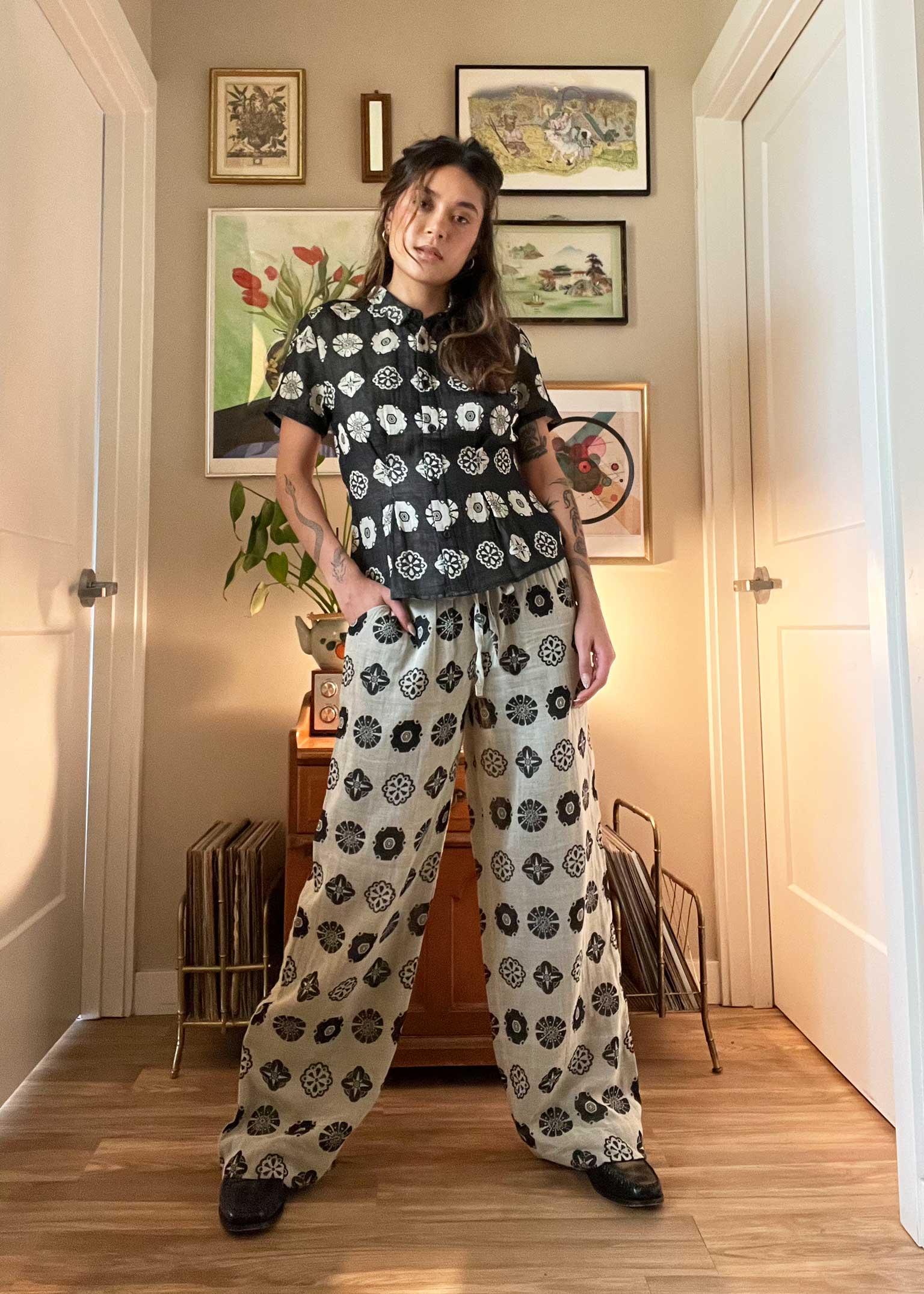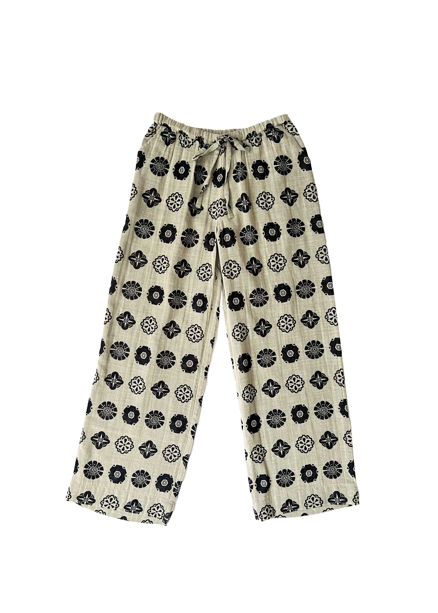 a pull on pant with pockets, an elasticated drawstring waist and a straight legfront rise, inseam made in our gold bauble textile, a lightweight supersoft butter yellow doublegauze textile with intricate woven circular motifs in black.