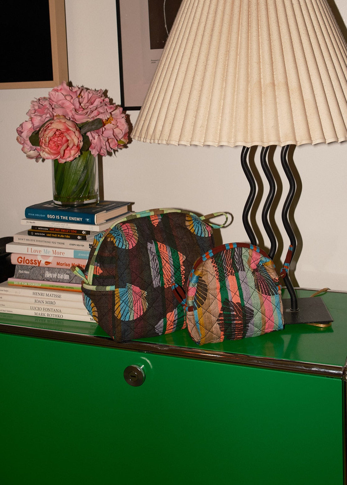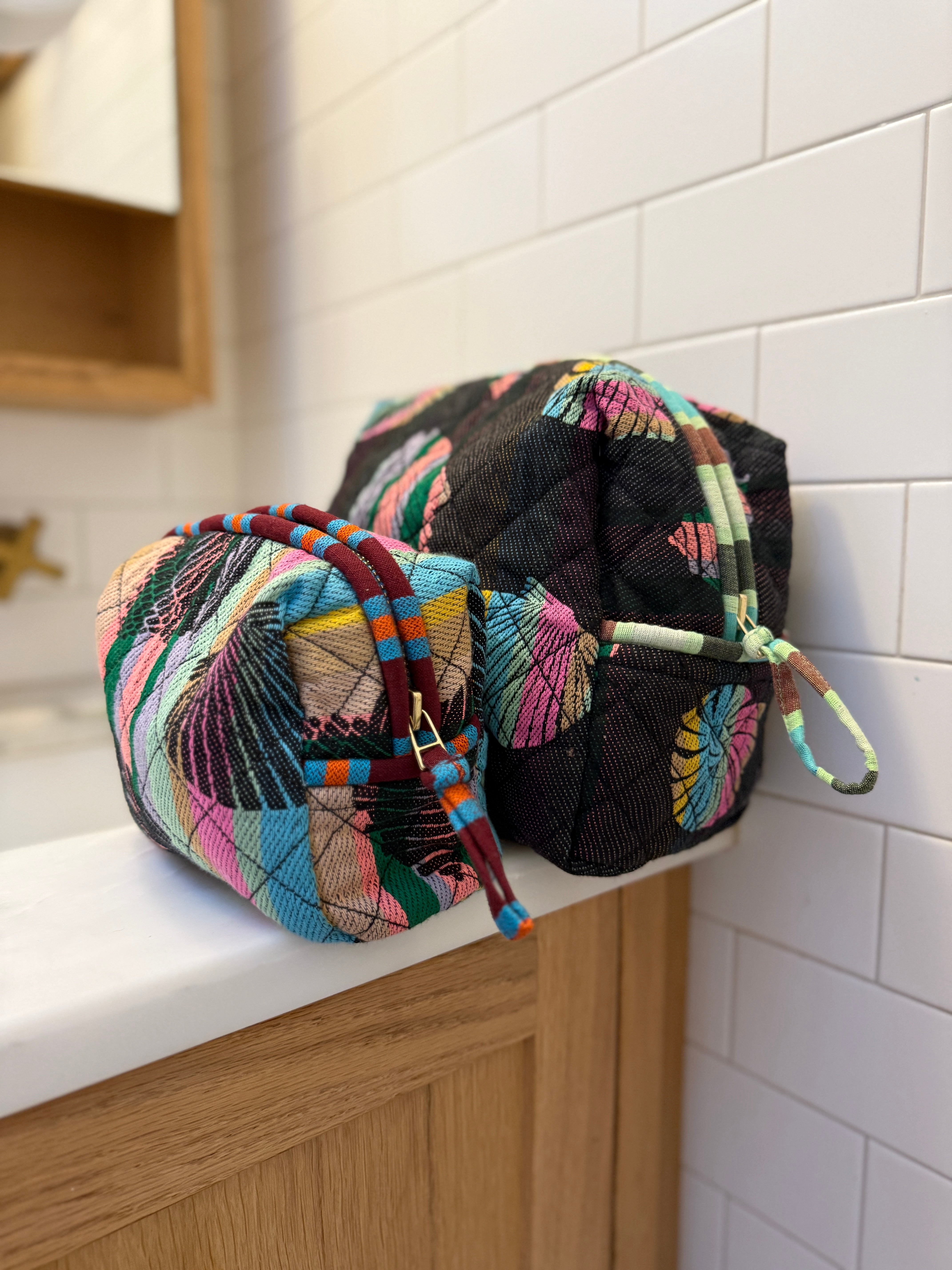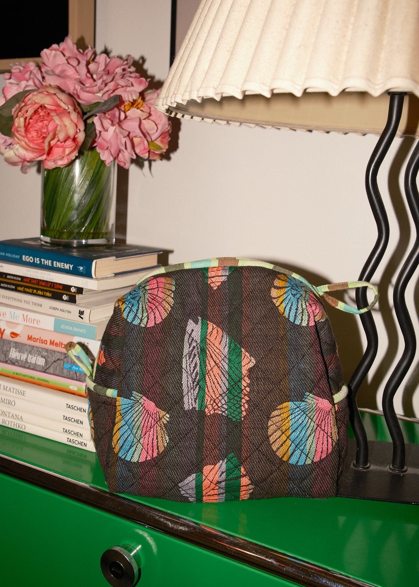 a large quilted pouch featuring a zipper closure with contrast piping and an interior pocket. doubles as a cute clutch! each pouch is made lovingly with leftover textile yardage from our past collections, in keeping with our longstanding commitment to reducing textile waste! made in our beachcomber textile, a midweight singlecloth featuring a faded black background with multicolored woven shell patterns in neon peach, lavender, sky blue, and rich green, with contrast binding in our walk textile.