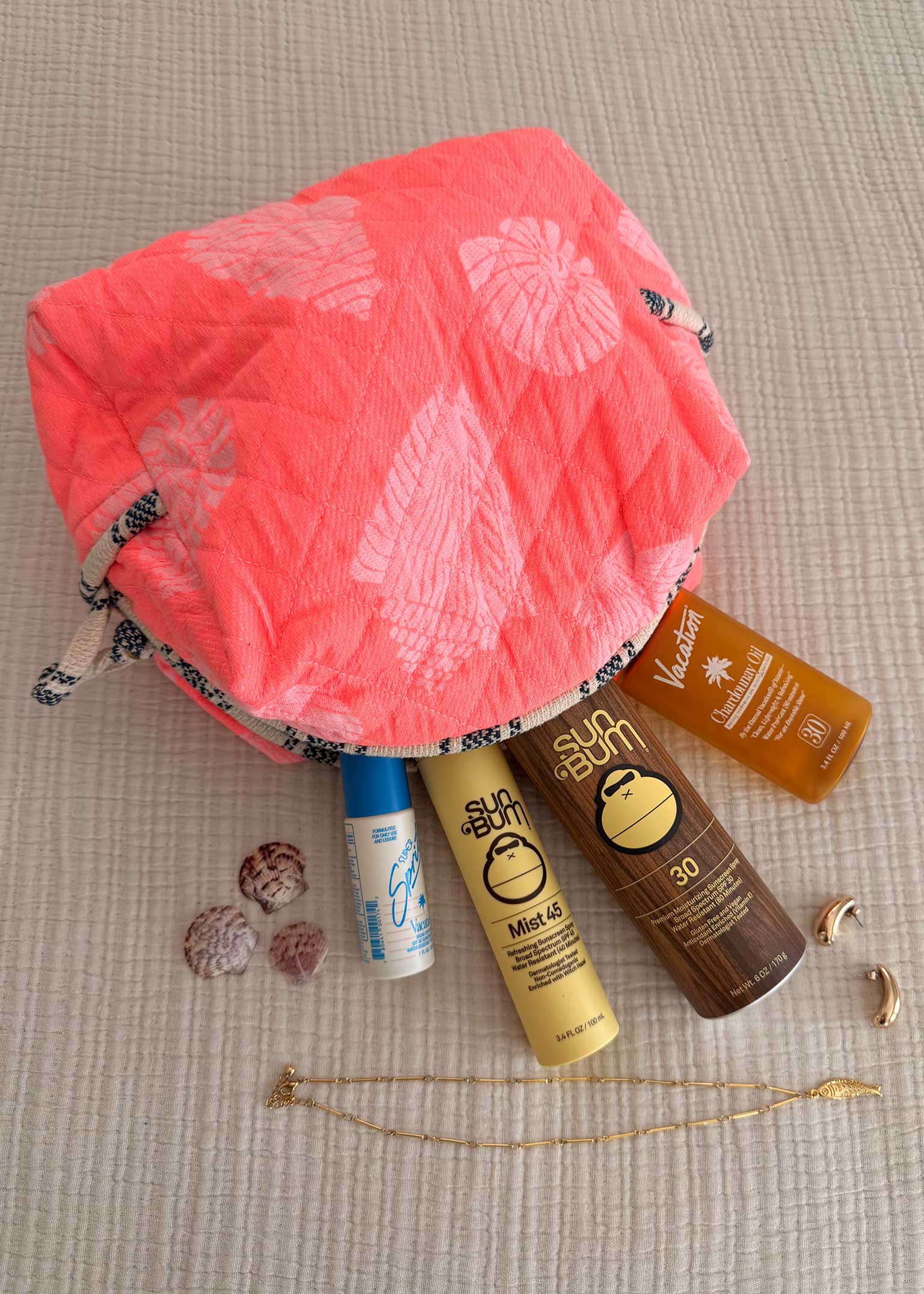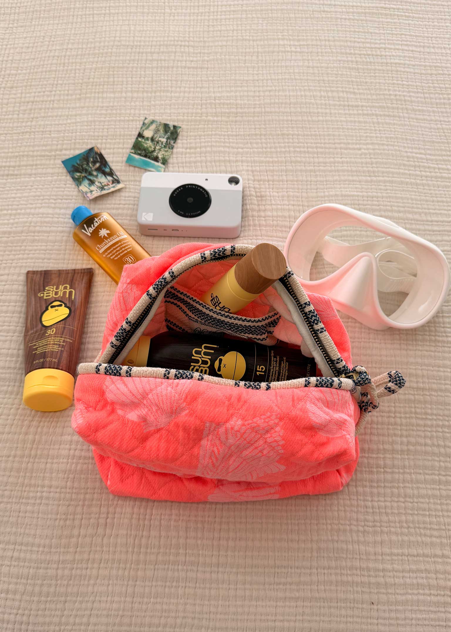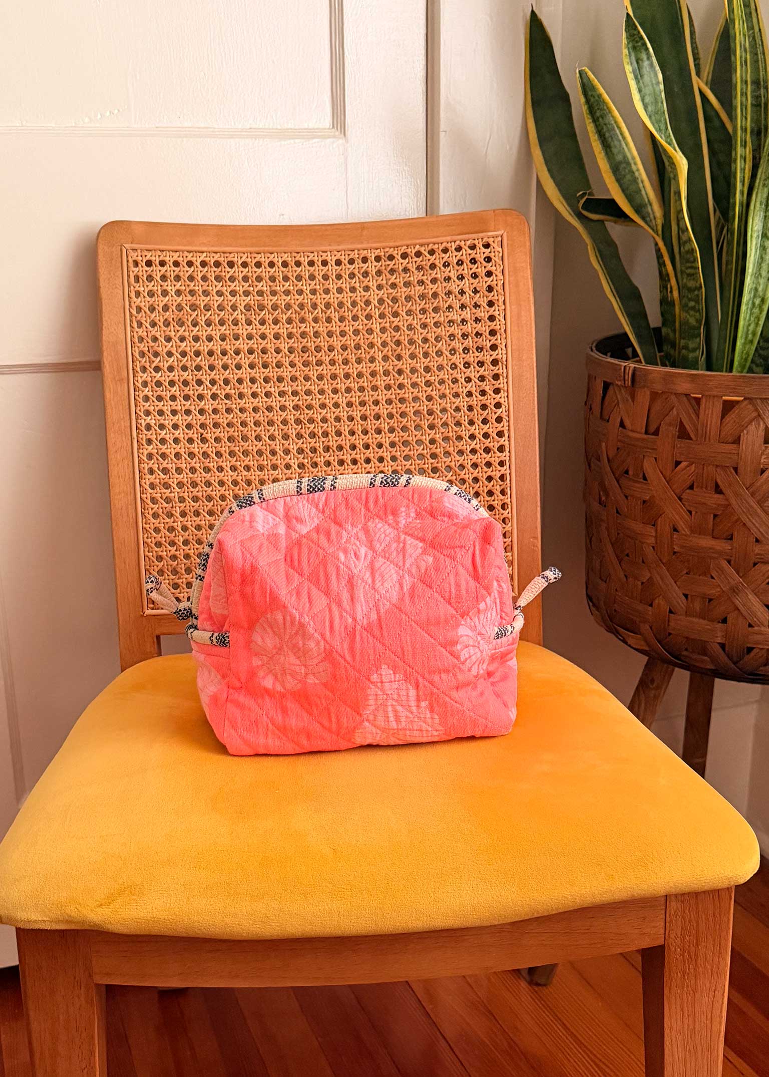 a large quilted pouch featuring a zipper closure with contrast piping and an interior pocket. doubles as a cute clutch! each pouch is made lovingly with leftover textile yardage from our past collections, in keeping with our longstanding commitment to reducing textile waste! made in our biscayne textile, a midweight singlecloth in neon pink with woven soft pink shell patterns, with contrast binding in our weekend textile.