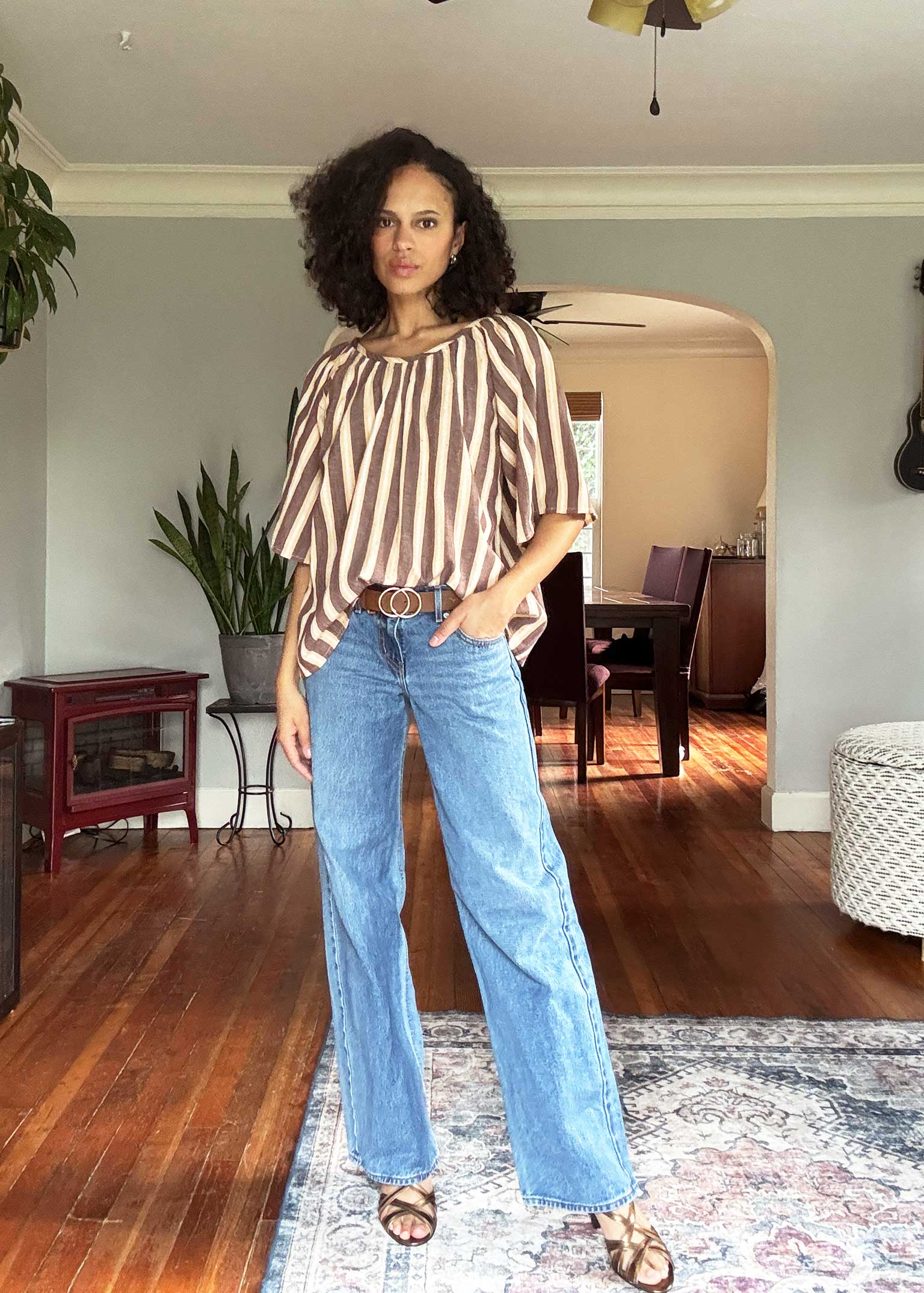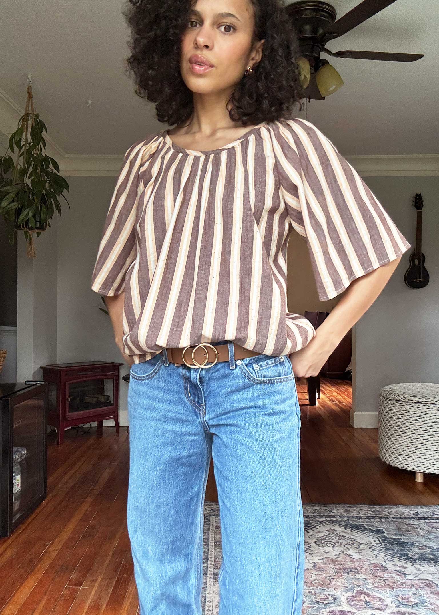 a scoop neck generous blouse with gathered neckline and elbow length sleeves. made in our crete textile, a midweight twill singlecloth, featuring woven stripes in cappuccino brown, light peach, and natural, with multicolored flecks throughout.