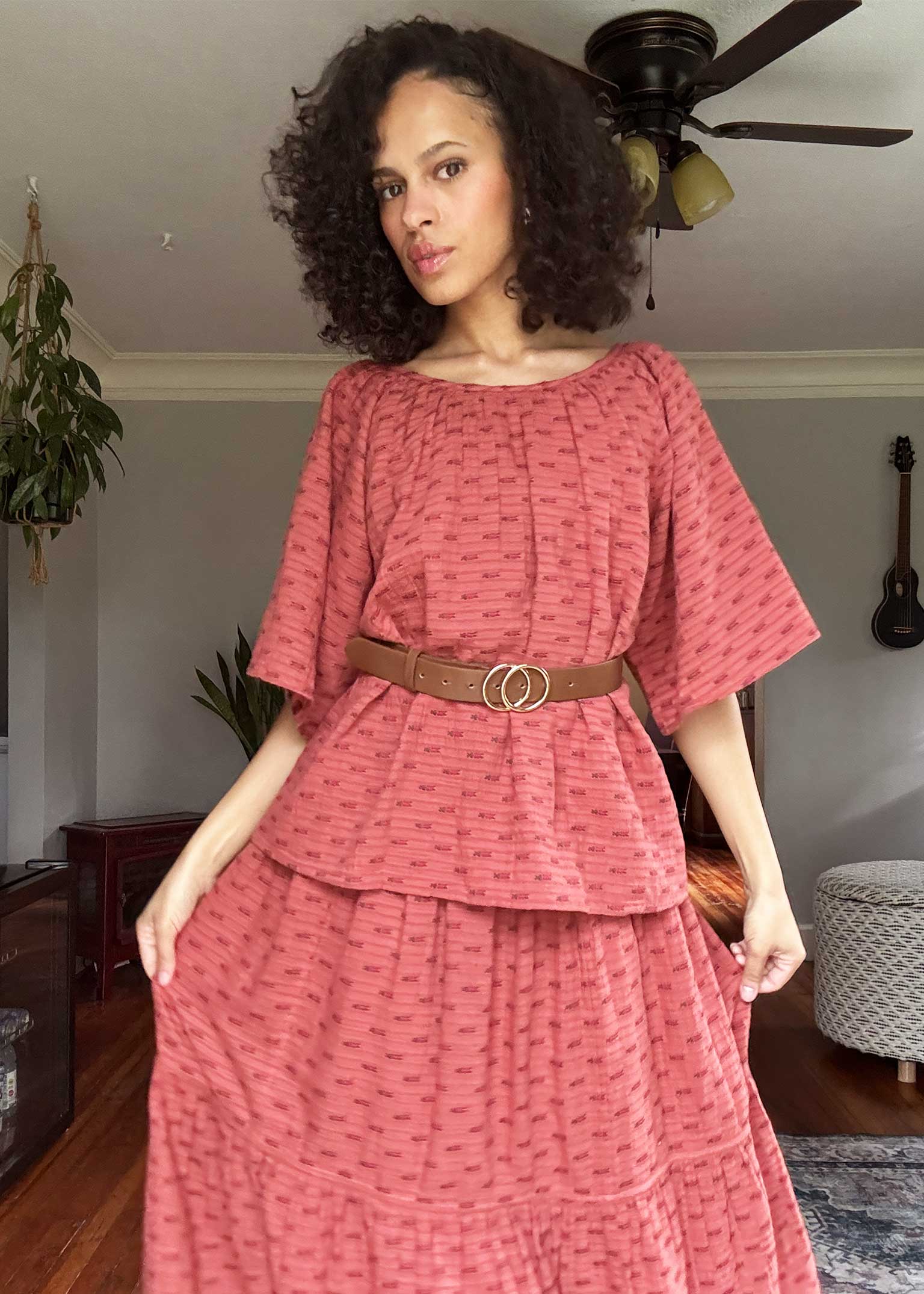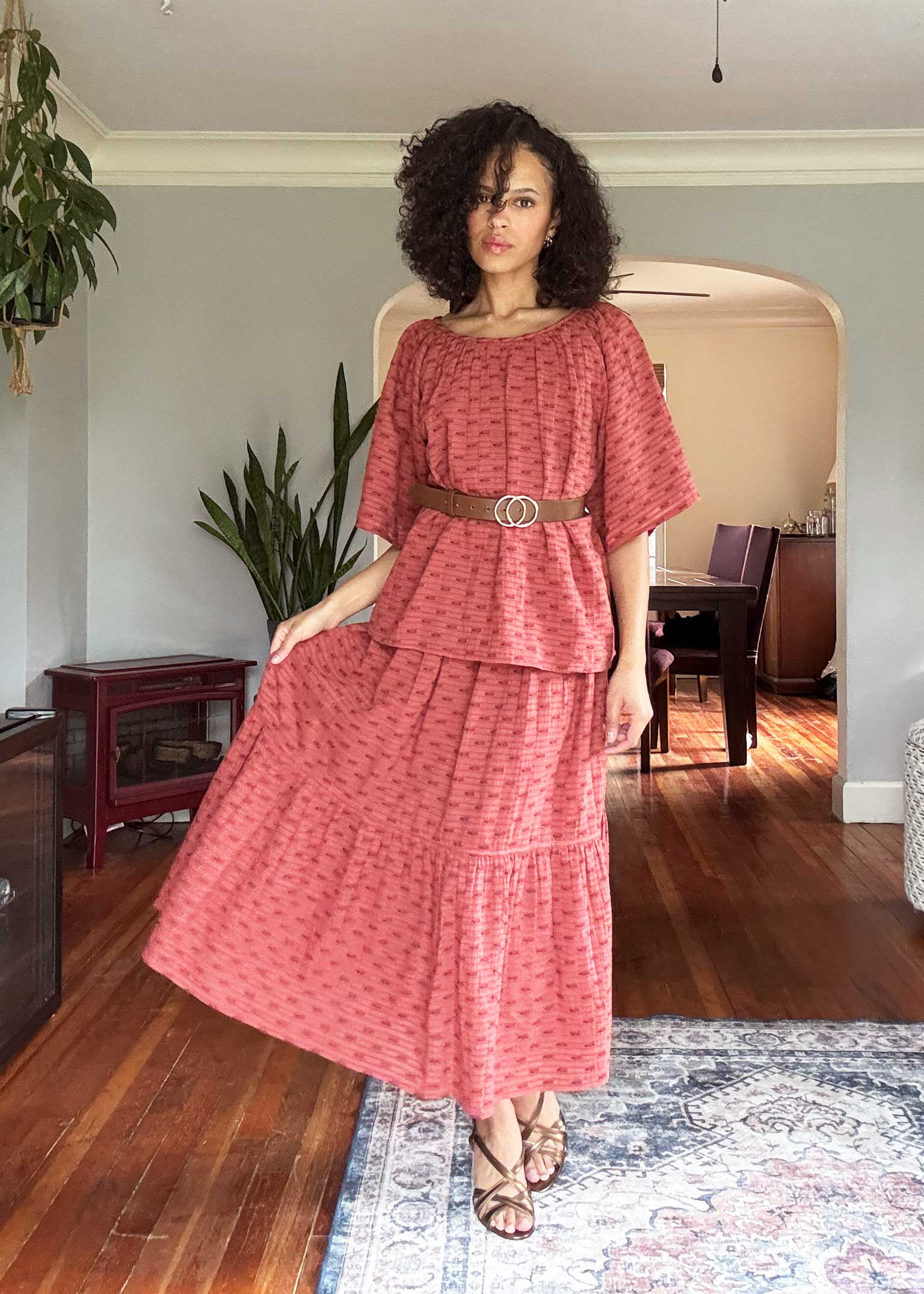 a scoop neck generous blouse with gathered neckline and elbow length sleeves. made in our palette textile, a lightweight textured gauzy terracotta singlecloth with small woven flowers in rose red and brown.