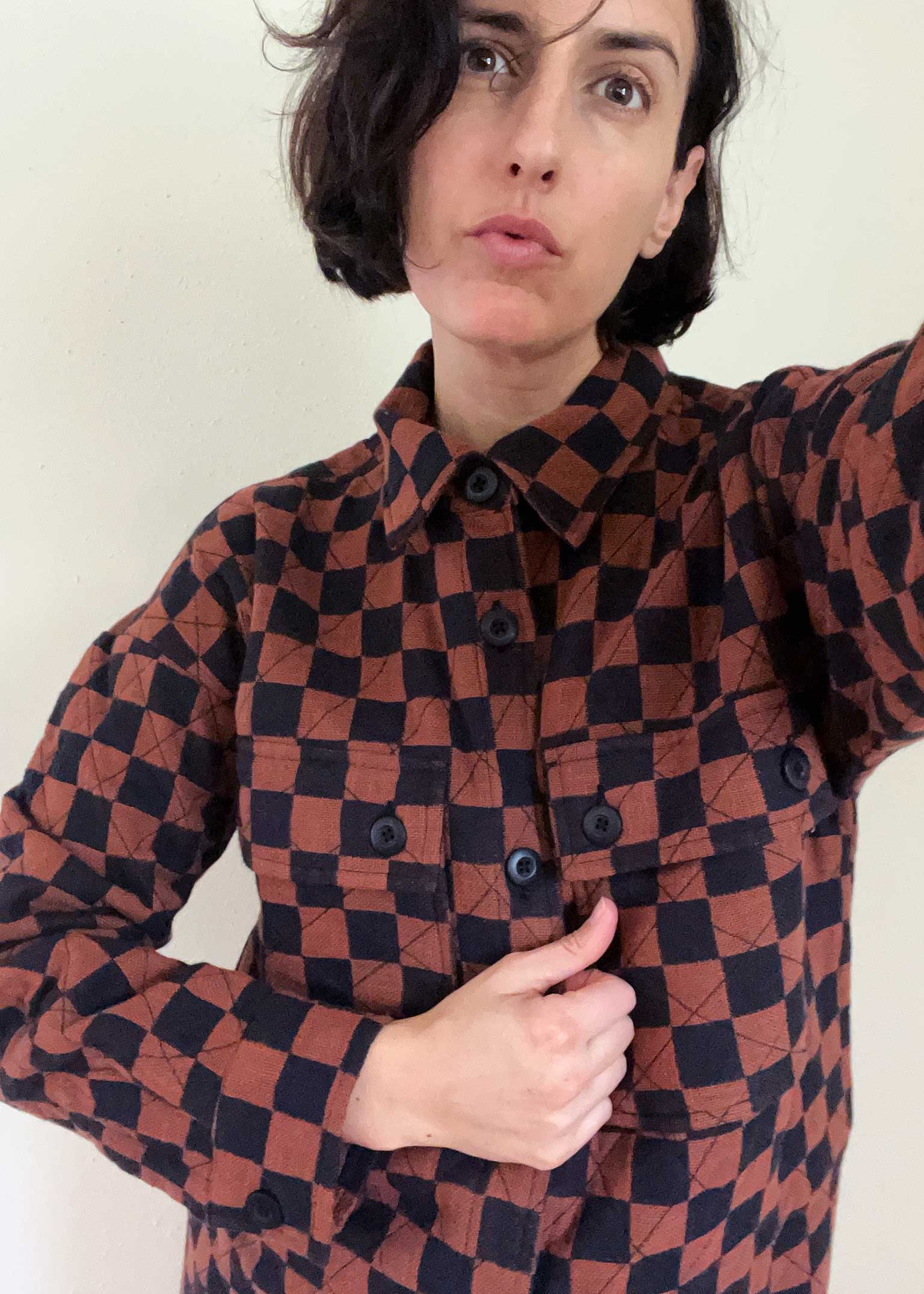 a fully lined quilted overcoat with a foldover collar, a button front, and patched and side slit pockets. made in our reason textile, a lofty supersoft doublecloth featuring a black and cinnamon brown woven checker pattern. this feels like a knit!