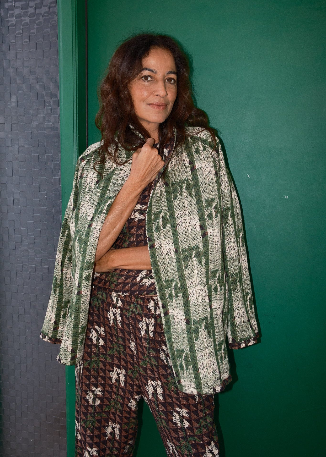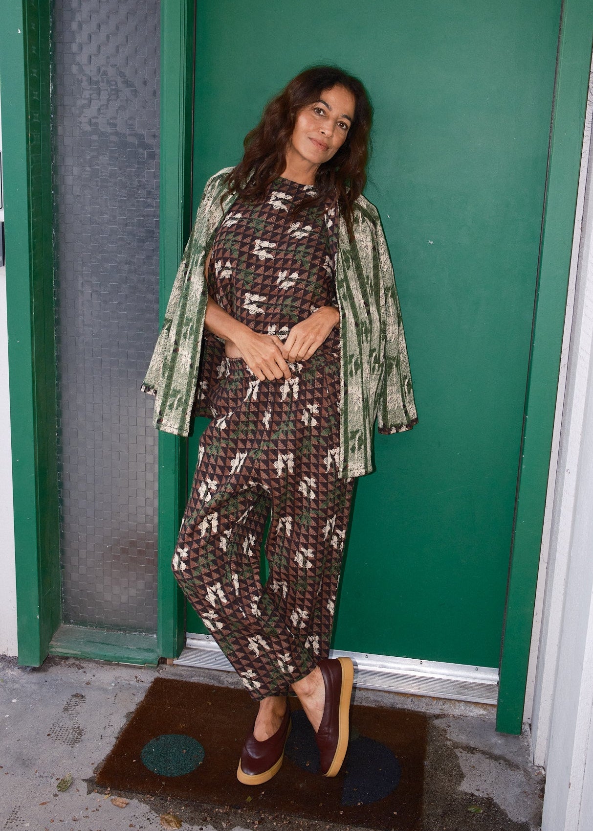 a reversible, wraparound fitted jacket with a foldover contrast neckline, front patch pockets and a removable fabric belt. made in our atrium textile, a luxe supersoft substantial textile with woven lily motifs in cream and green atop black and brown triangles.