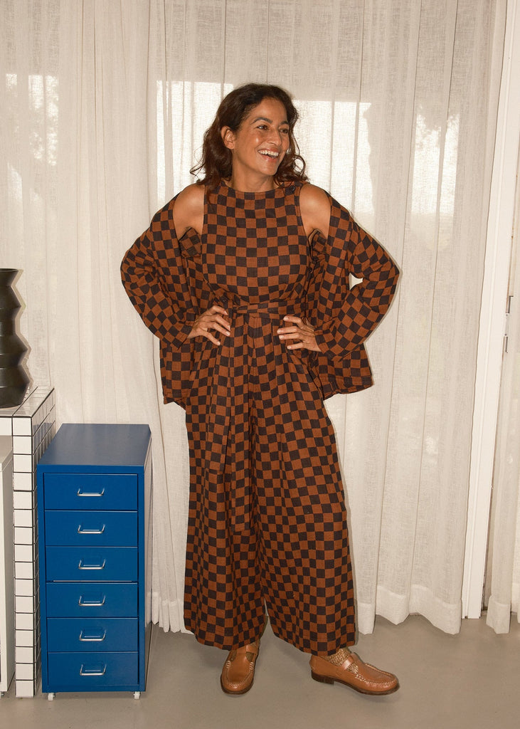 a wraparound fitted jacket with a foldover contrast neckline, front patch pockets and a removable fabric belt. made in our reason textile, a lofty supersoft doublecloth featuring a black and cinnamon brown woven checker pattern. this feels like a knit!