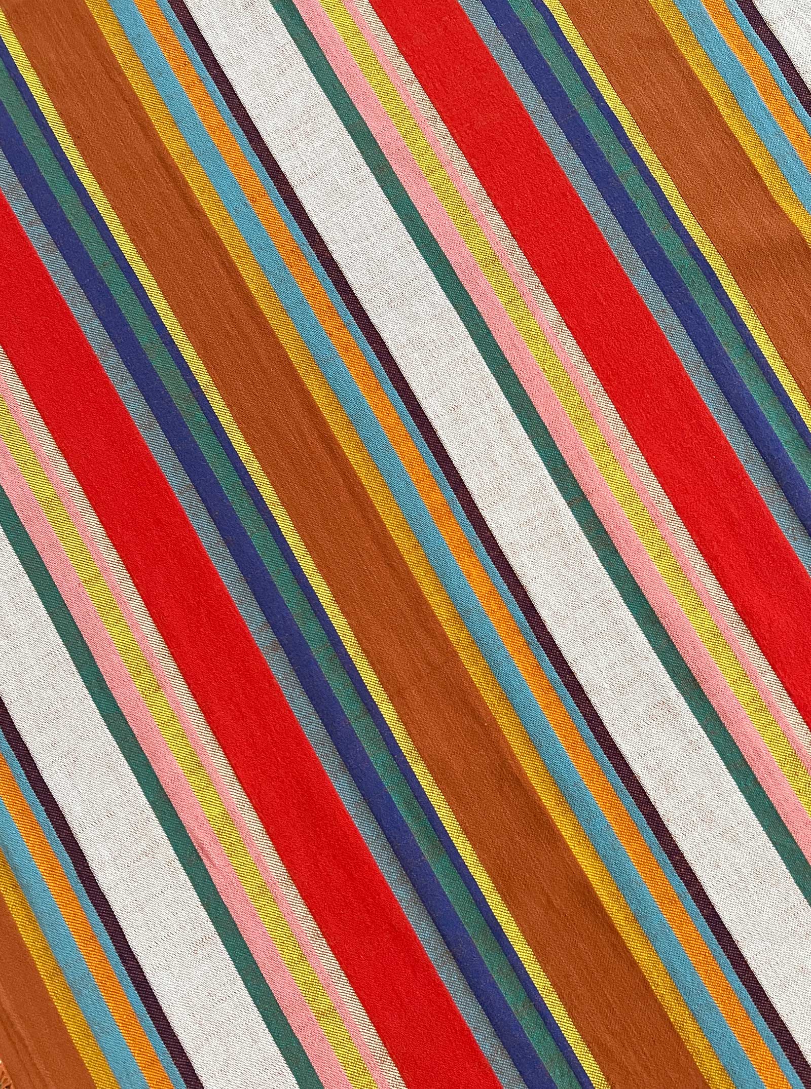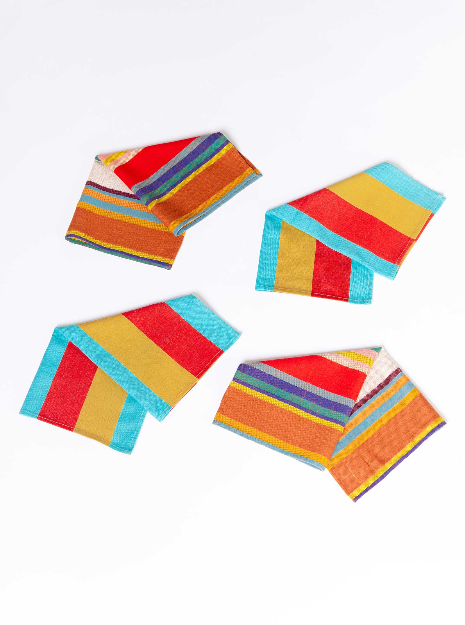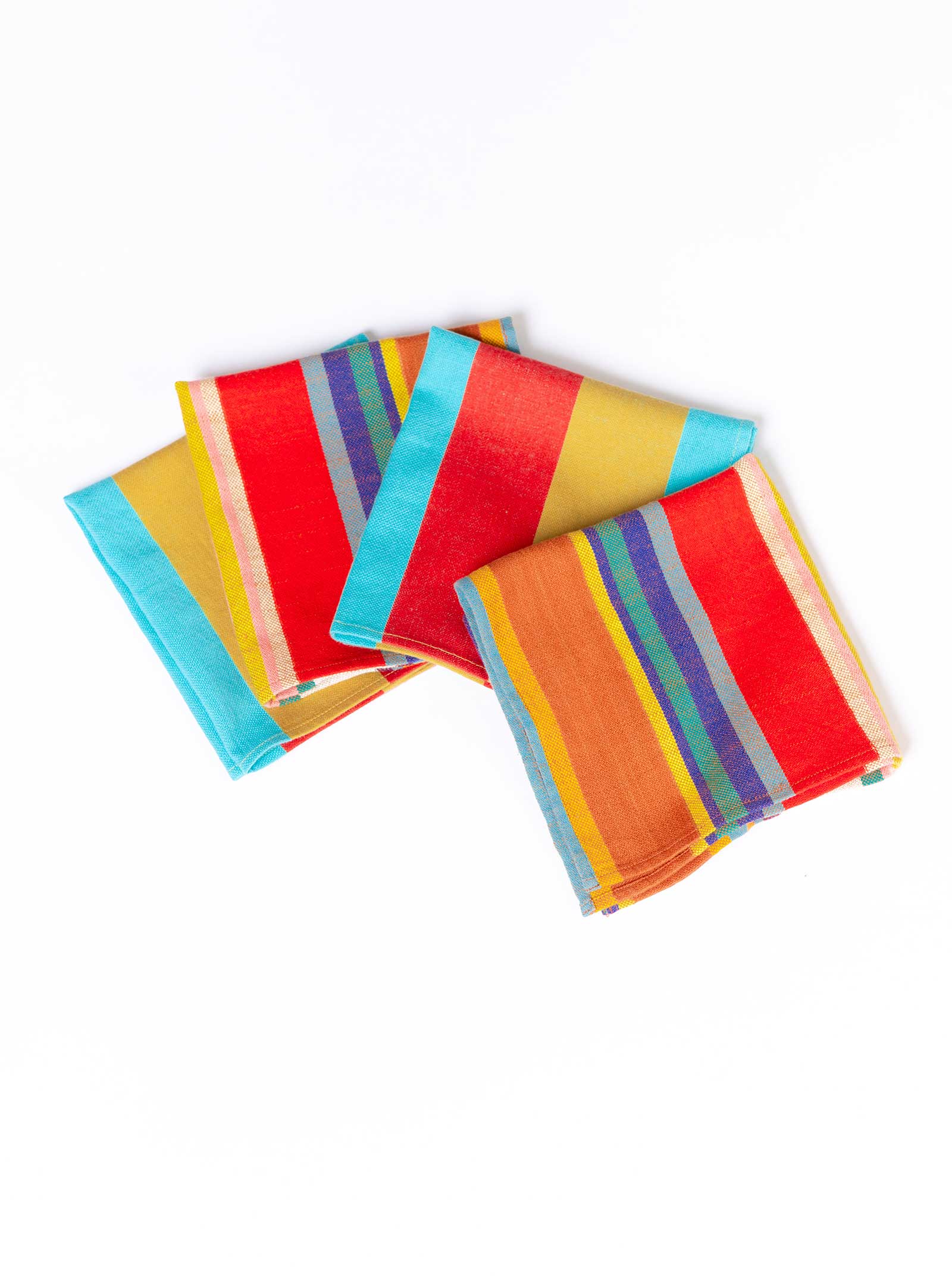a set of four napkins made from an assortment of our leftover yarn dye woven textiles in keeping with our commitment to reducing textile waste. made in our canopy textile, a midweight singlecloth with bold woven stripes in bright red, mustard, and cyan, which also features cocktail.