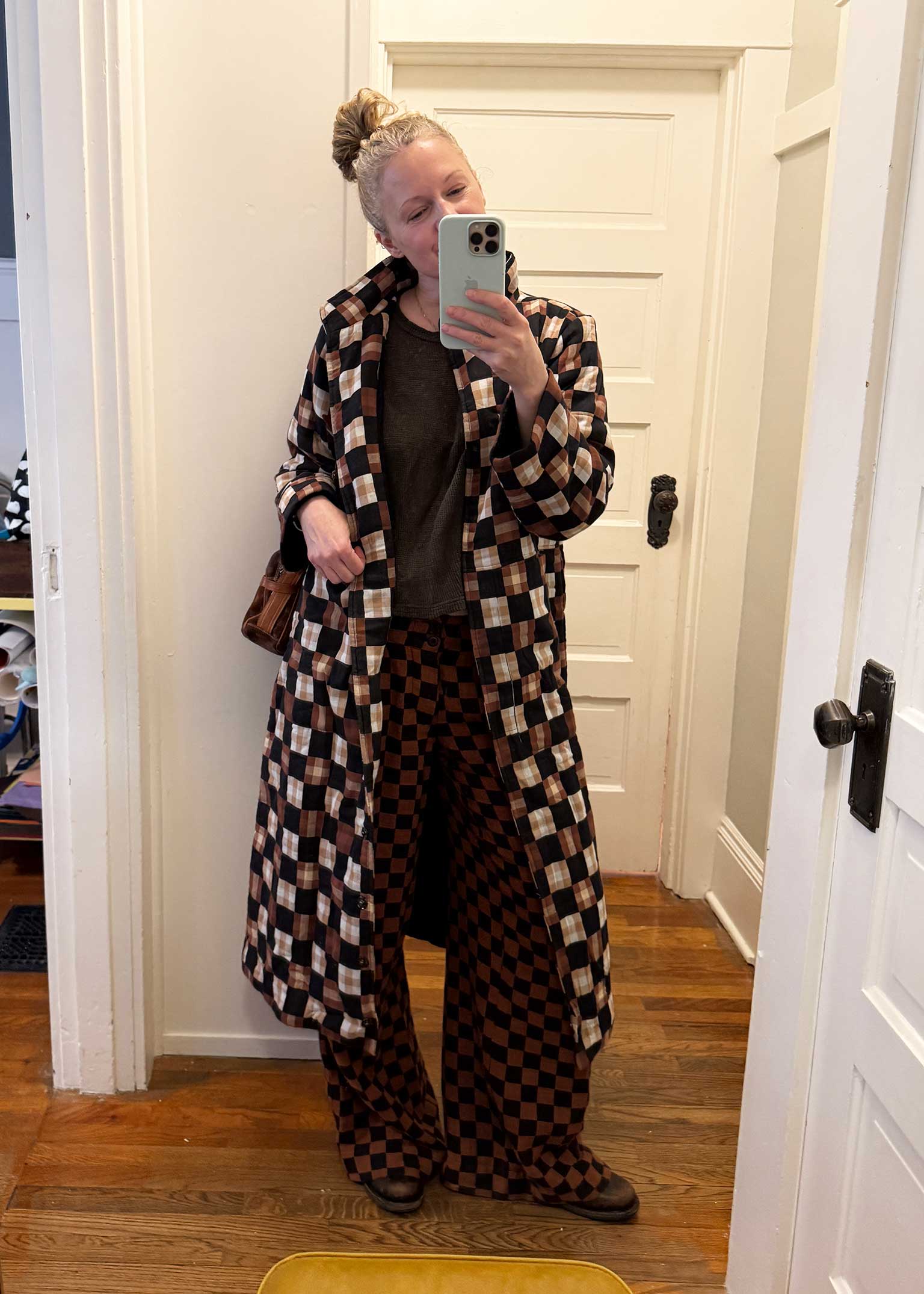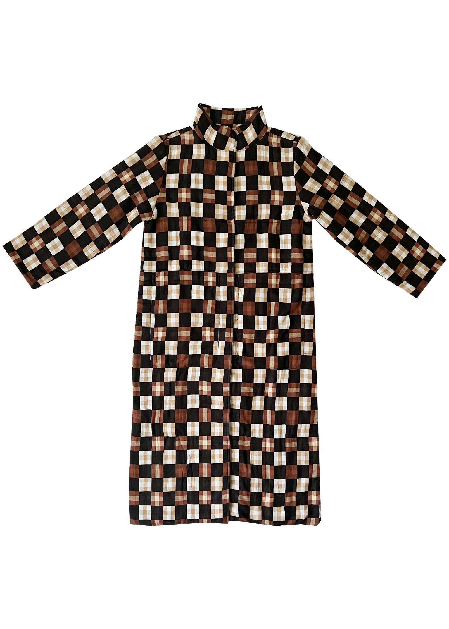 generous quilted coat with a stand collar, snap front, and roomy deep pockets. made in our heartland textile, a lightweight doublecloth featuring a woven checker pattern in rich browns, blacks, and creams.
