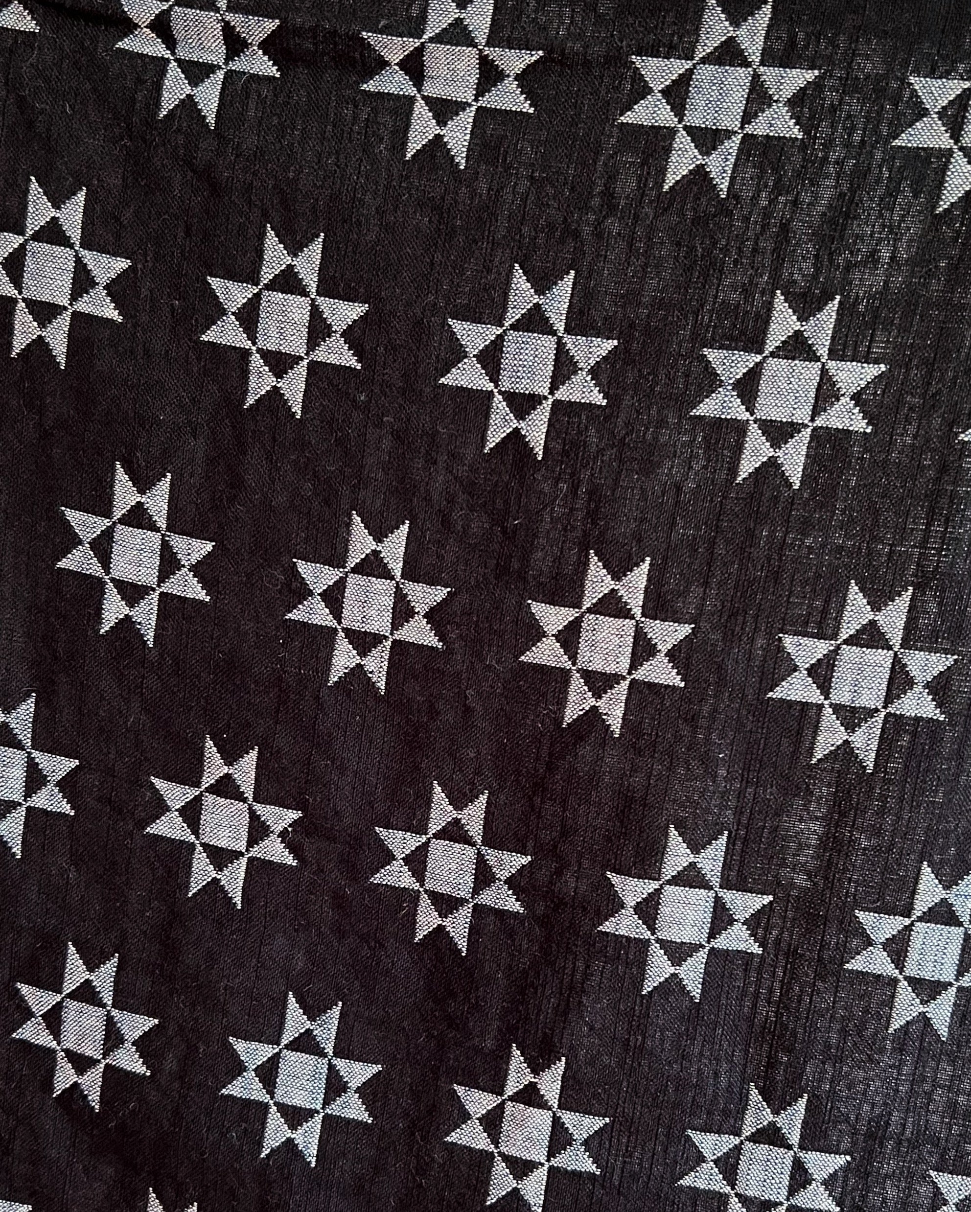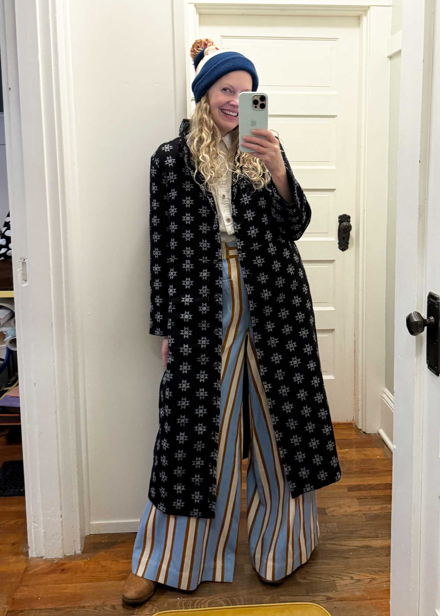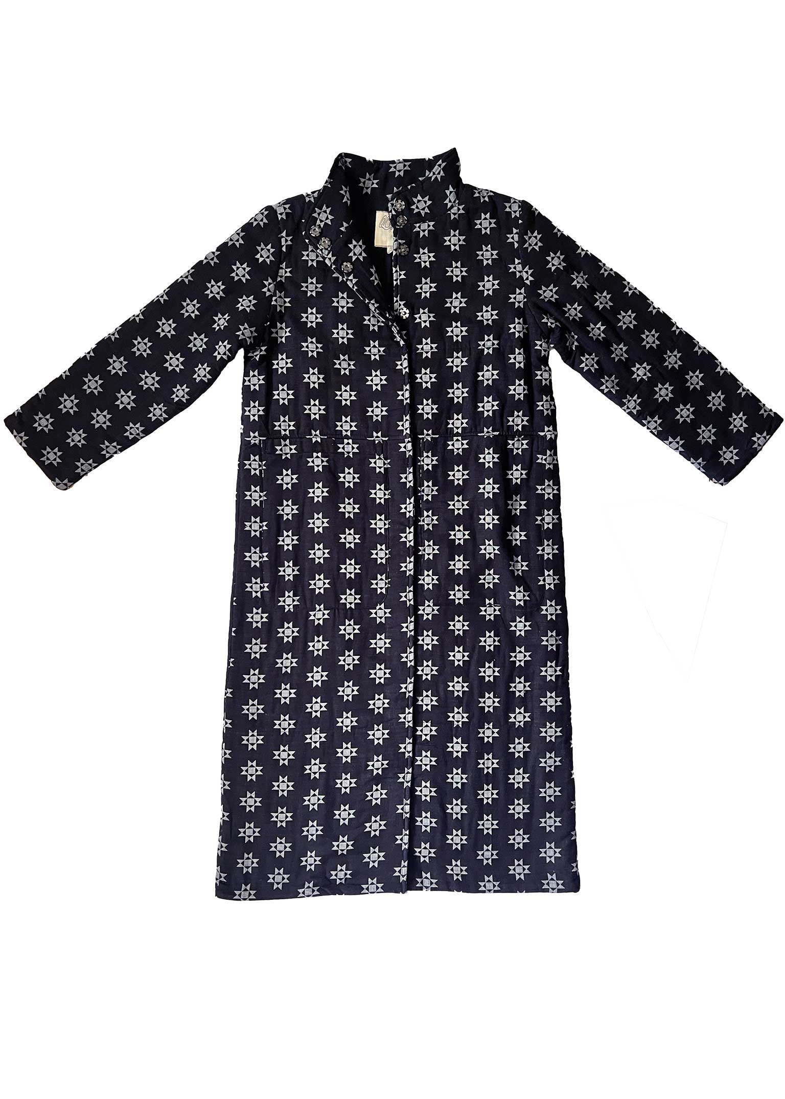 generous quilted coat with a stand collar, snap front, and roomy deep pockets. made in our majorette textile, a lightweight doublecloth in black with graphic woven motifs in gray-blue chambray.