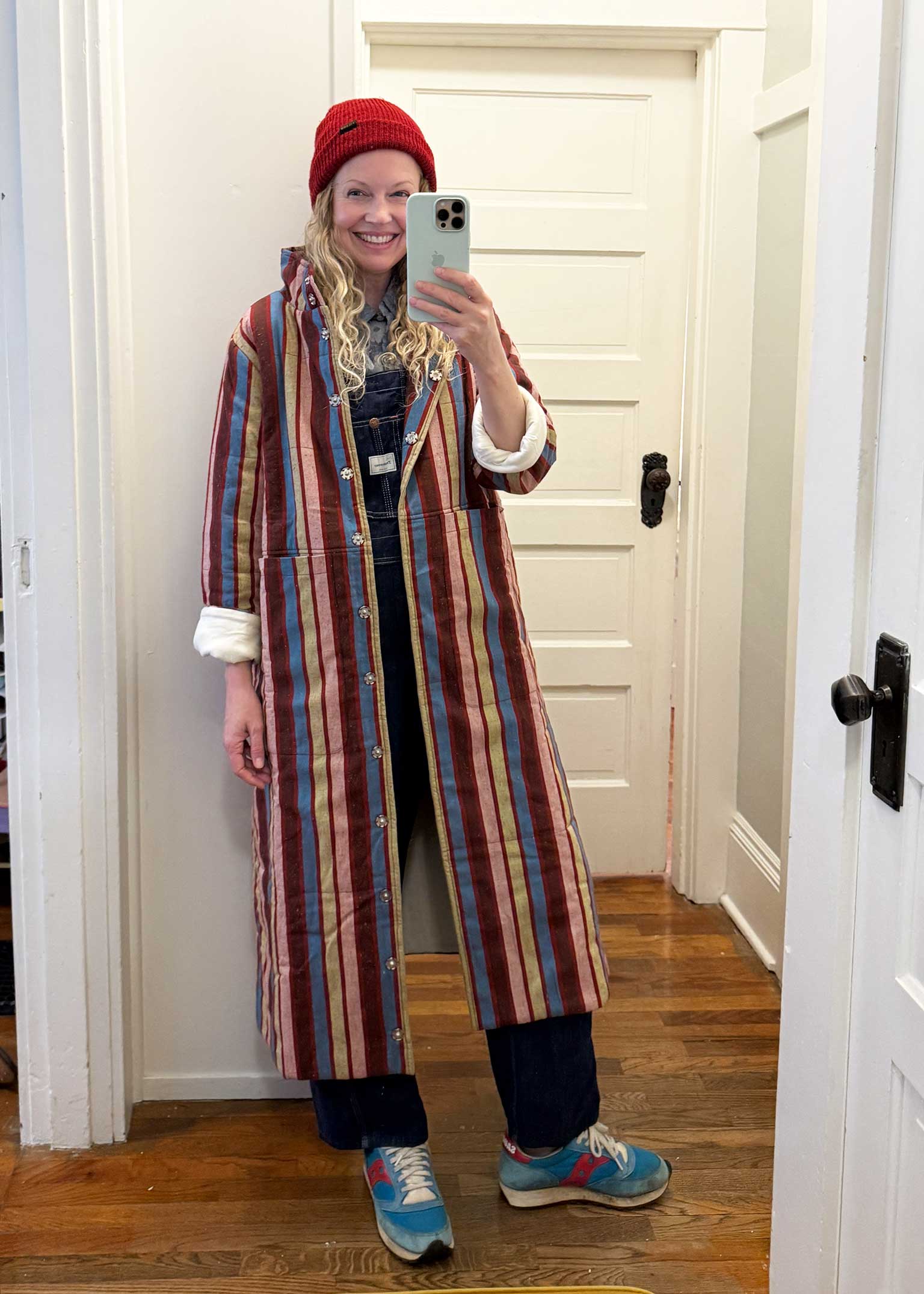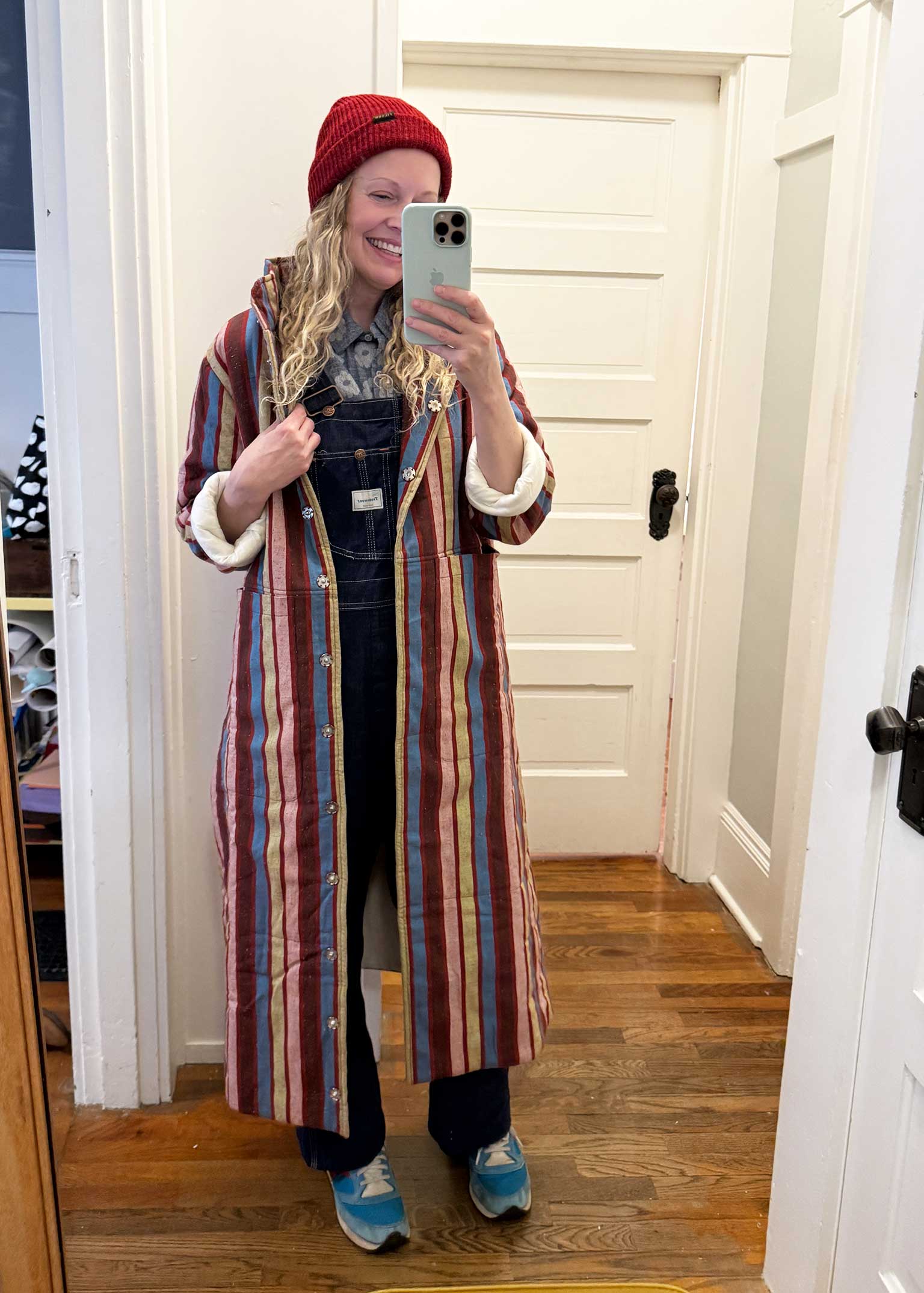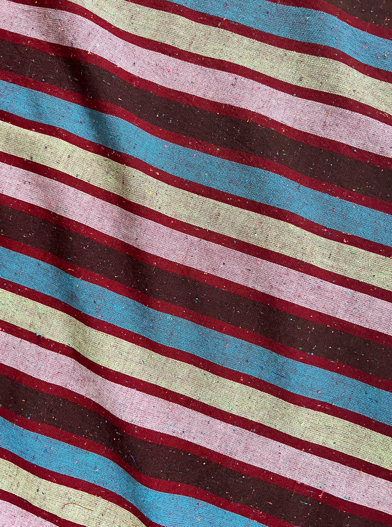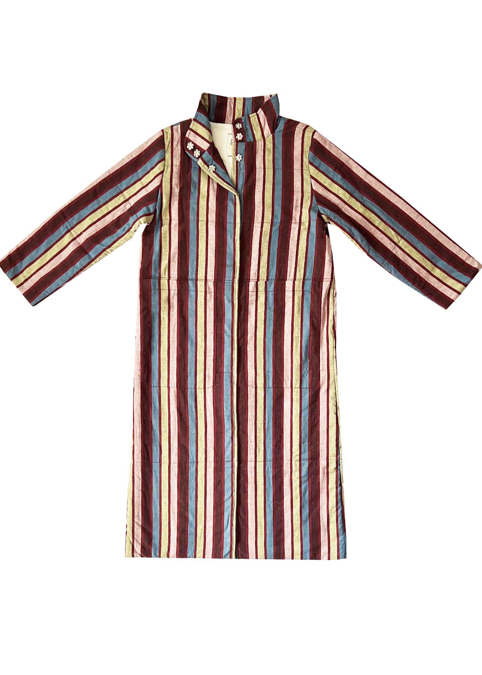generous quilted coat with a stand collar, snap front, and roomy deep pockets. made in our riddle textile, a midweight singlecloth featuring woven stripes in maroon, eggplant, blue, lime, pastel pink, and multicolored flecks throughout.