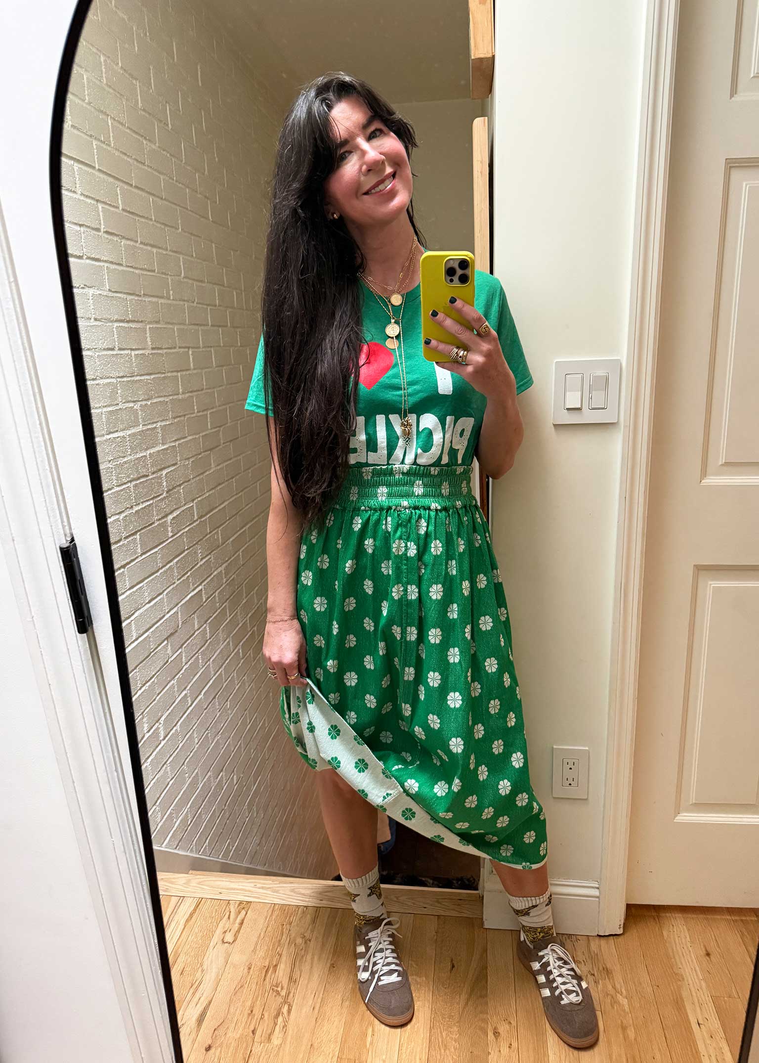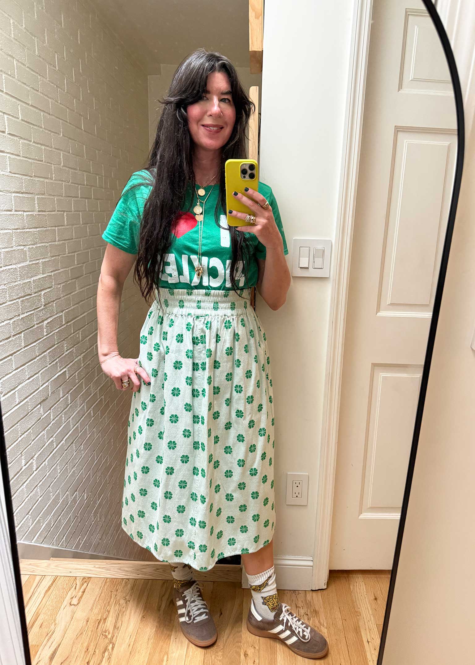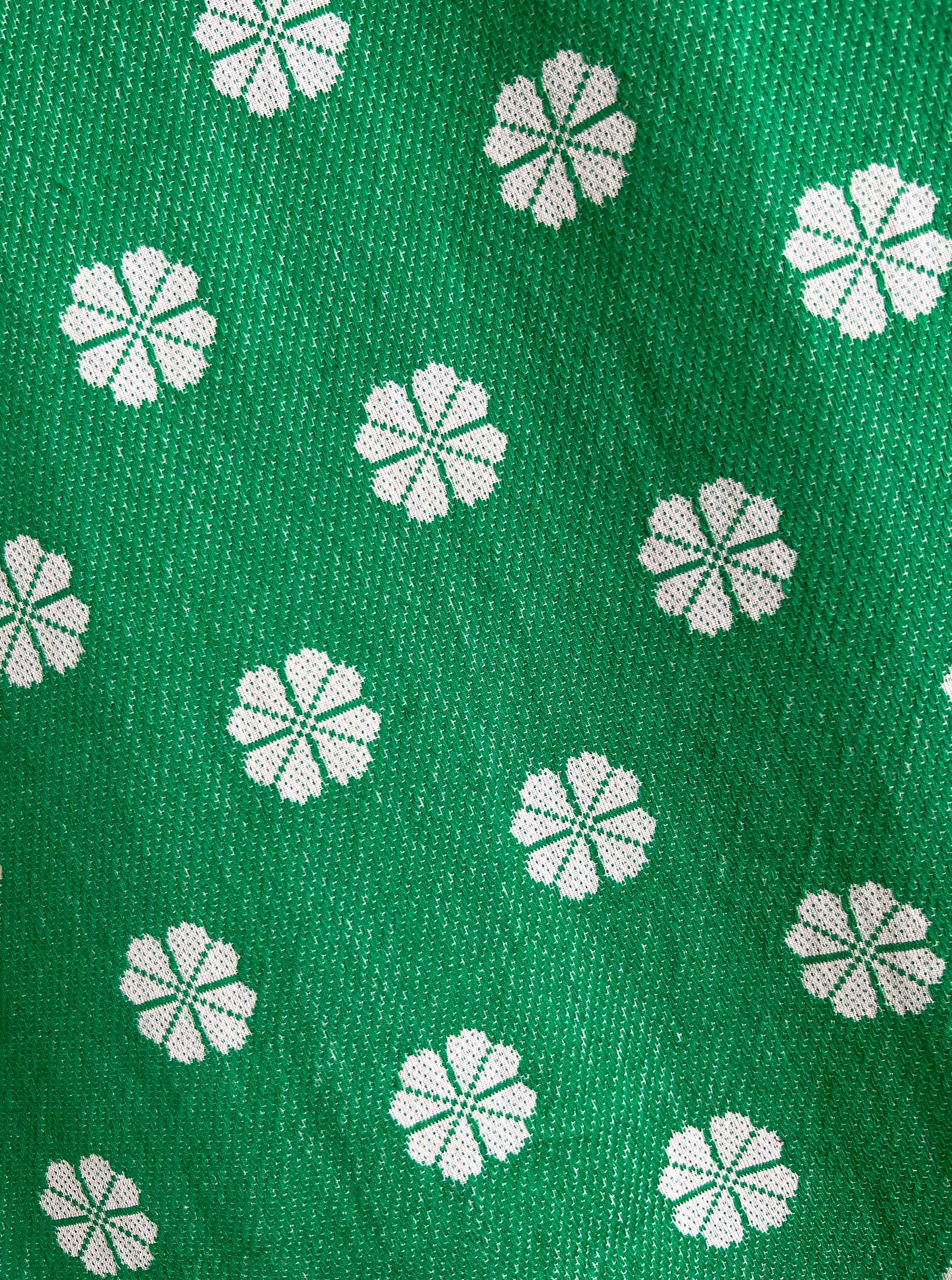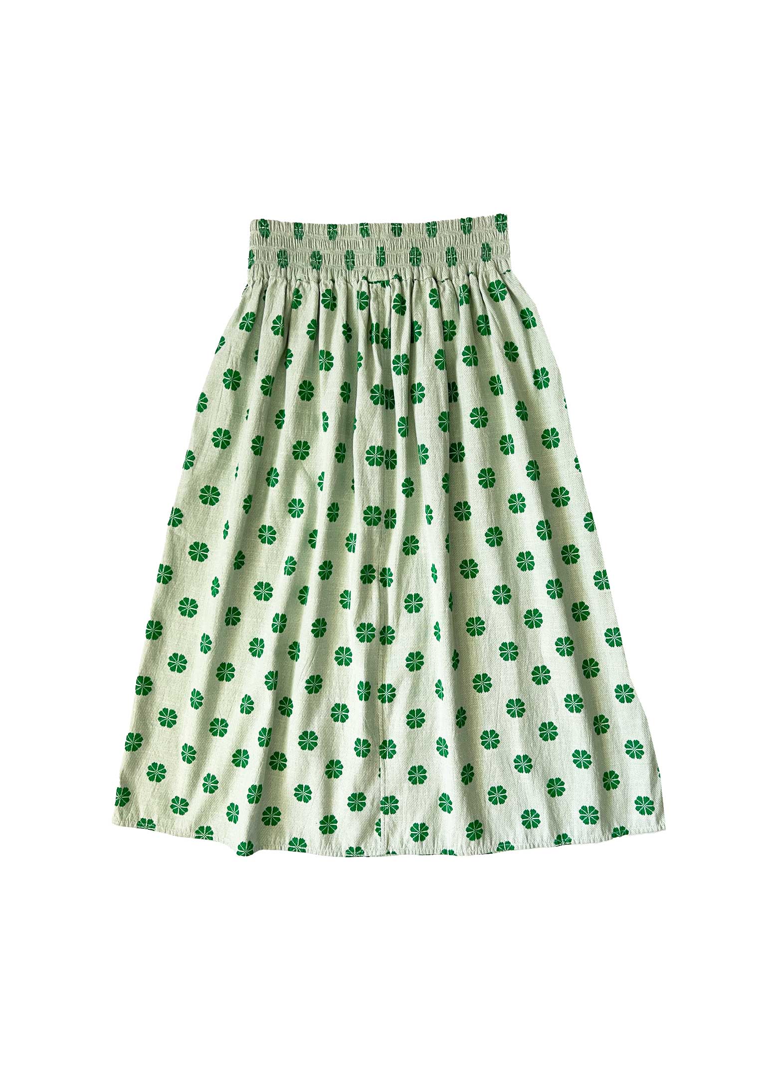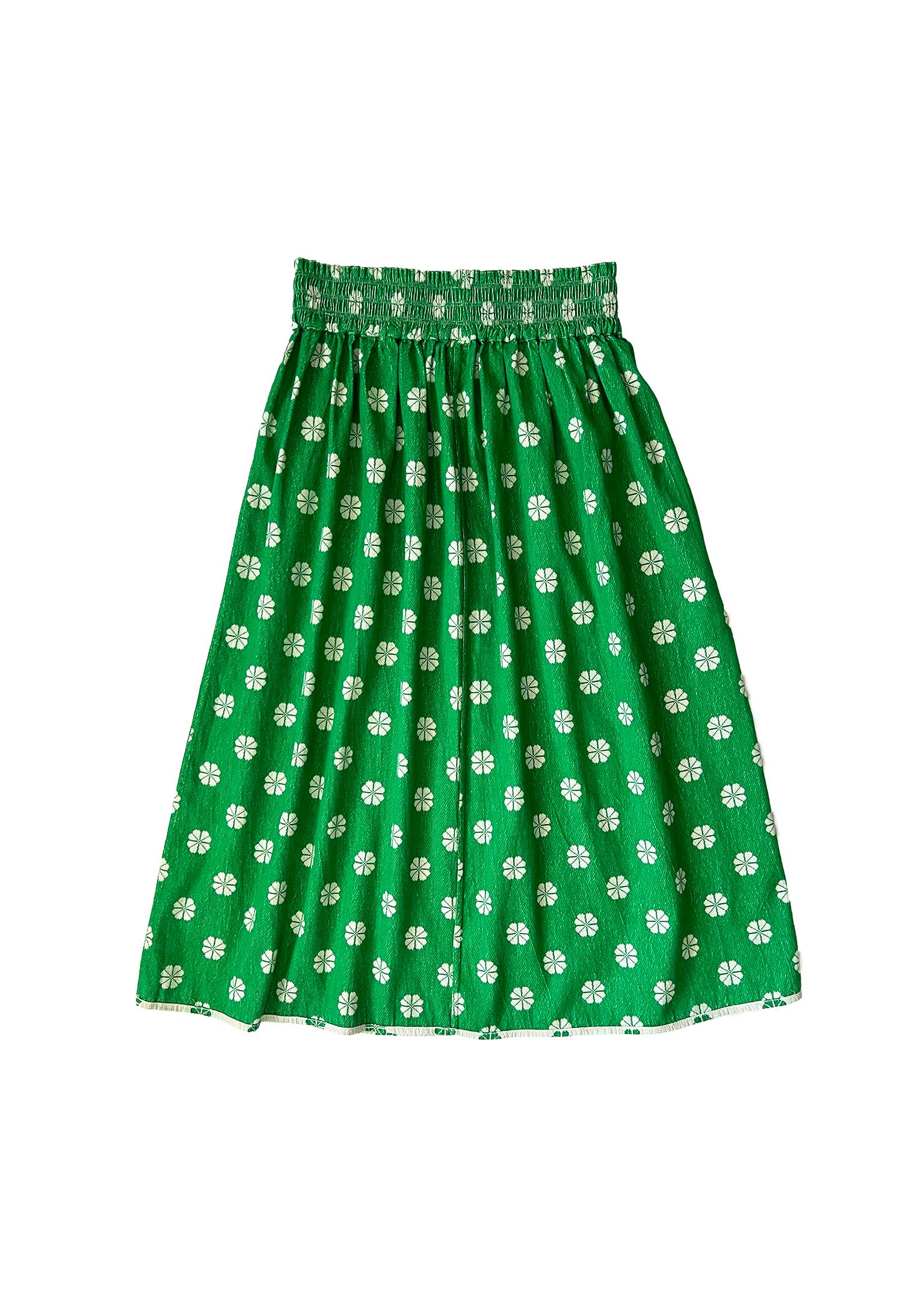 a reversible midi length skirt with an elasticated waistband. made in our daisy textile, a soft midweight singlecloth in white with a kelly green daisy woven floral pattern.