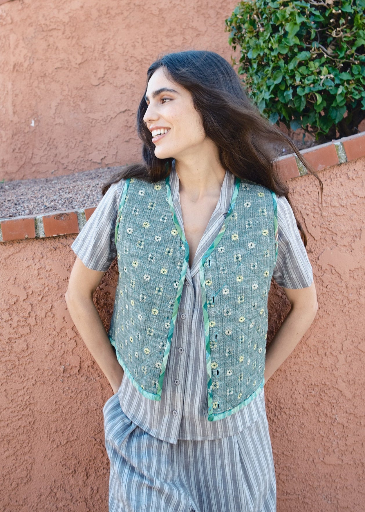 a fully reversible, quilted version of our classic vest! a simple v-neck button-front vest that can be worn alone or layered. made in our garden textile, a supersoft doublegauze in a multitude of greens featuring woven embroidery-like motifs reminiscent of classic ace&jig doublegauzes like nectar and royal! reverses to our willow textile!