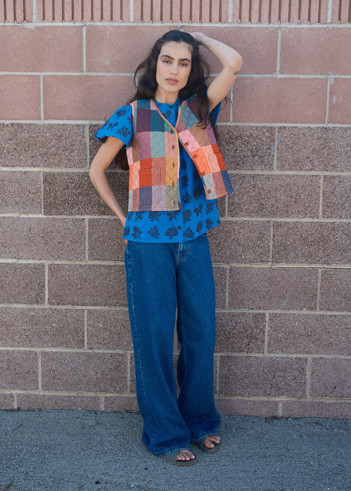 a fully reversible, quilted version of our classic vest! a simple v-neck button-front vest that can be worn alone or layered. made in our glossary textile, a super lightweight multicolored doublegauze, featuring a woven rectangular pattern in rich tonal heathered colors. reverses to our rhyme textile!