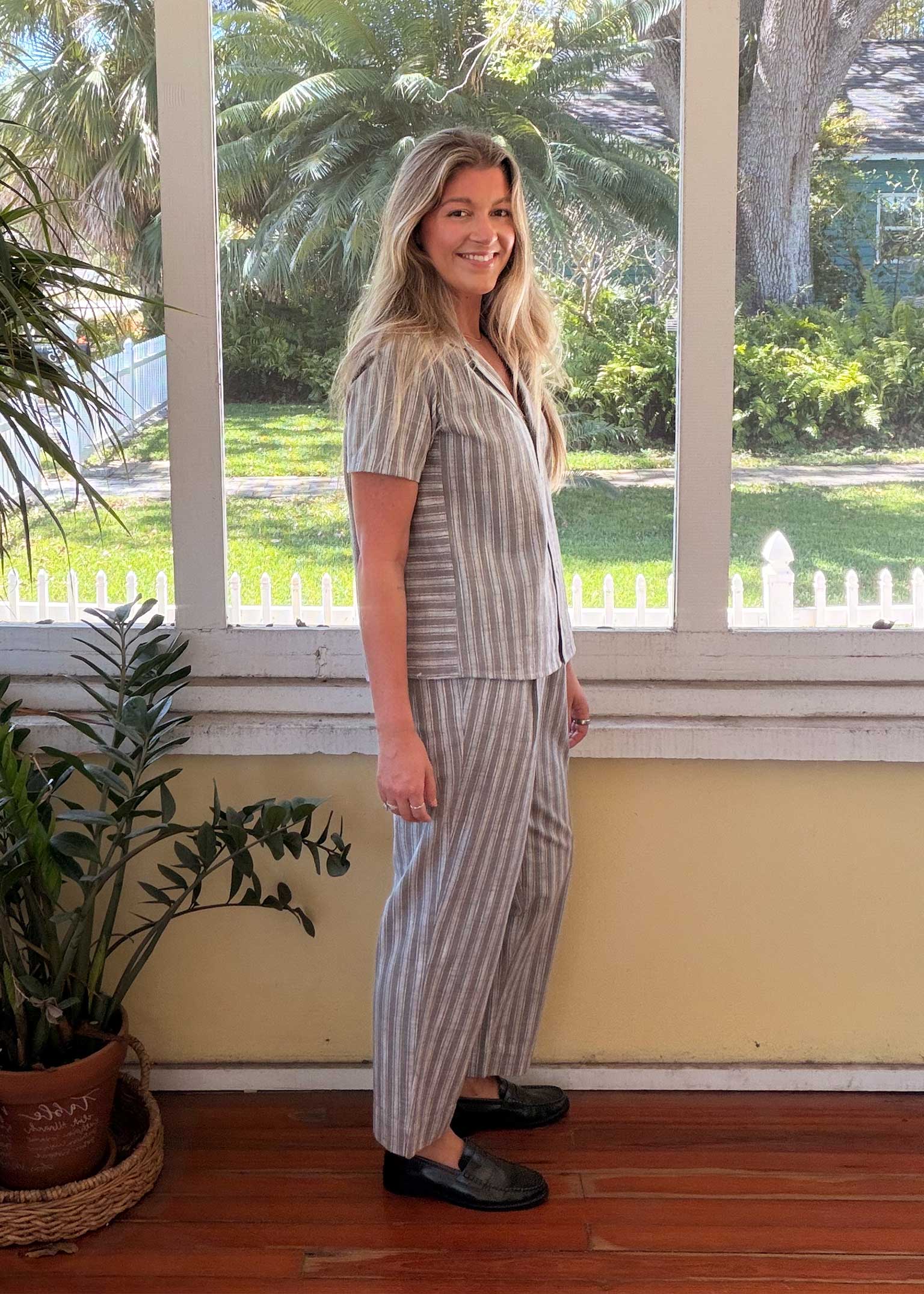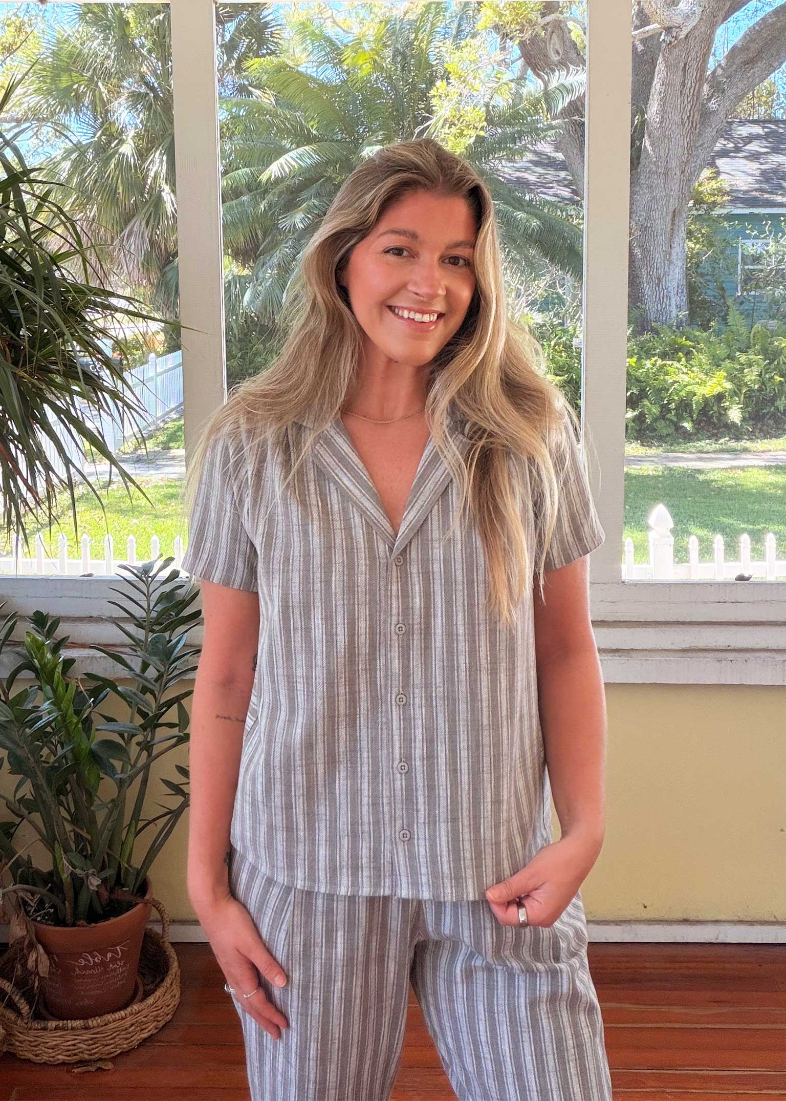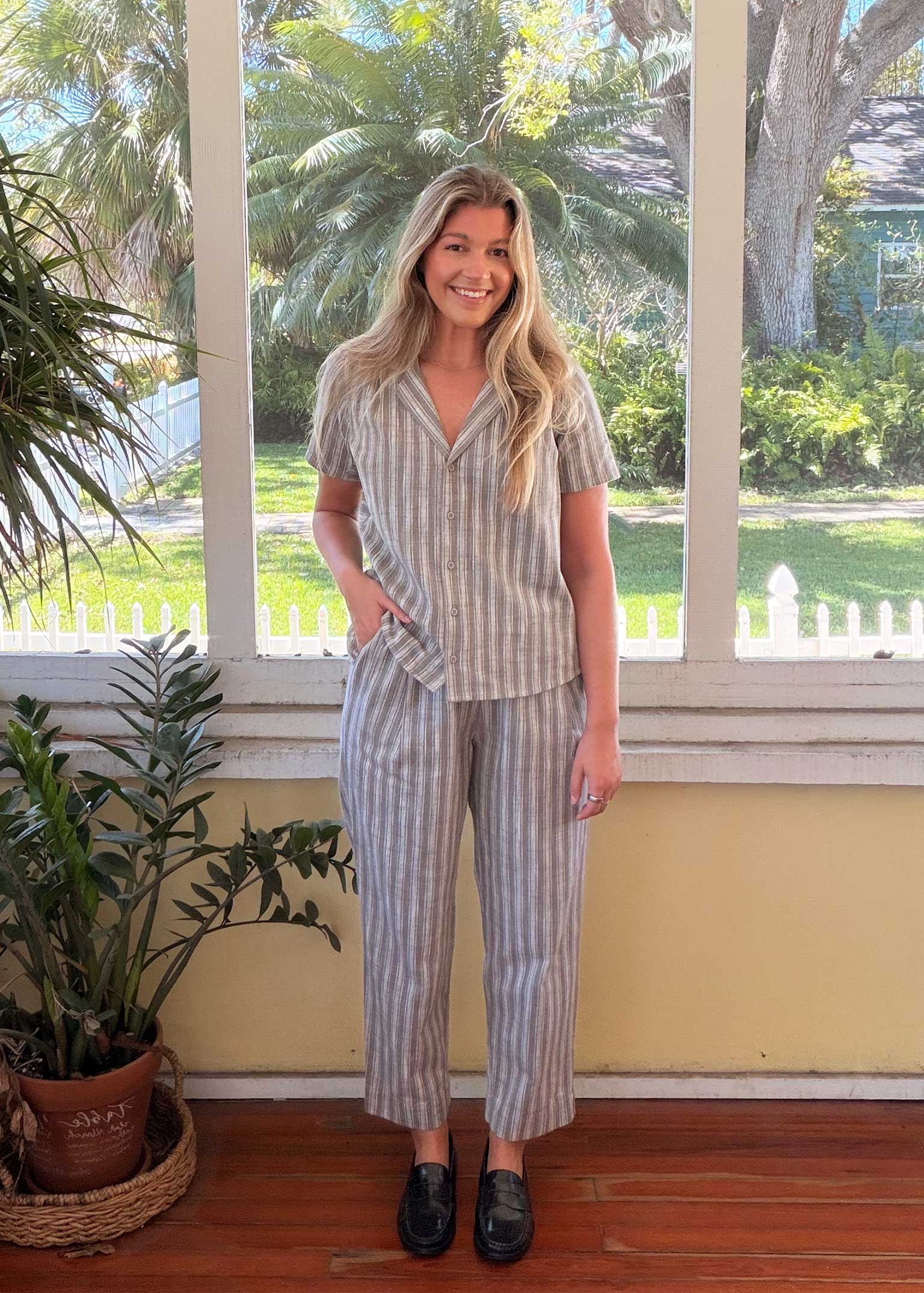a button-up shirt with a notched collar and short sleeves. think: our classic winnie top with the collar of our murphy top! made in our scribble textile, a midweight woven singlecloth in a warm gray with subtle faded chalky white stripes.