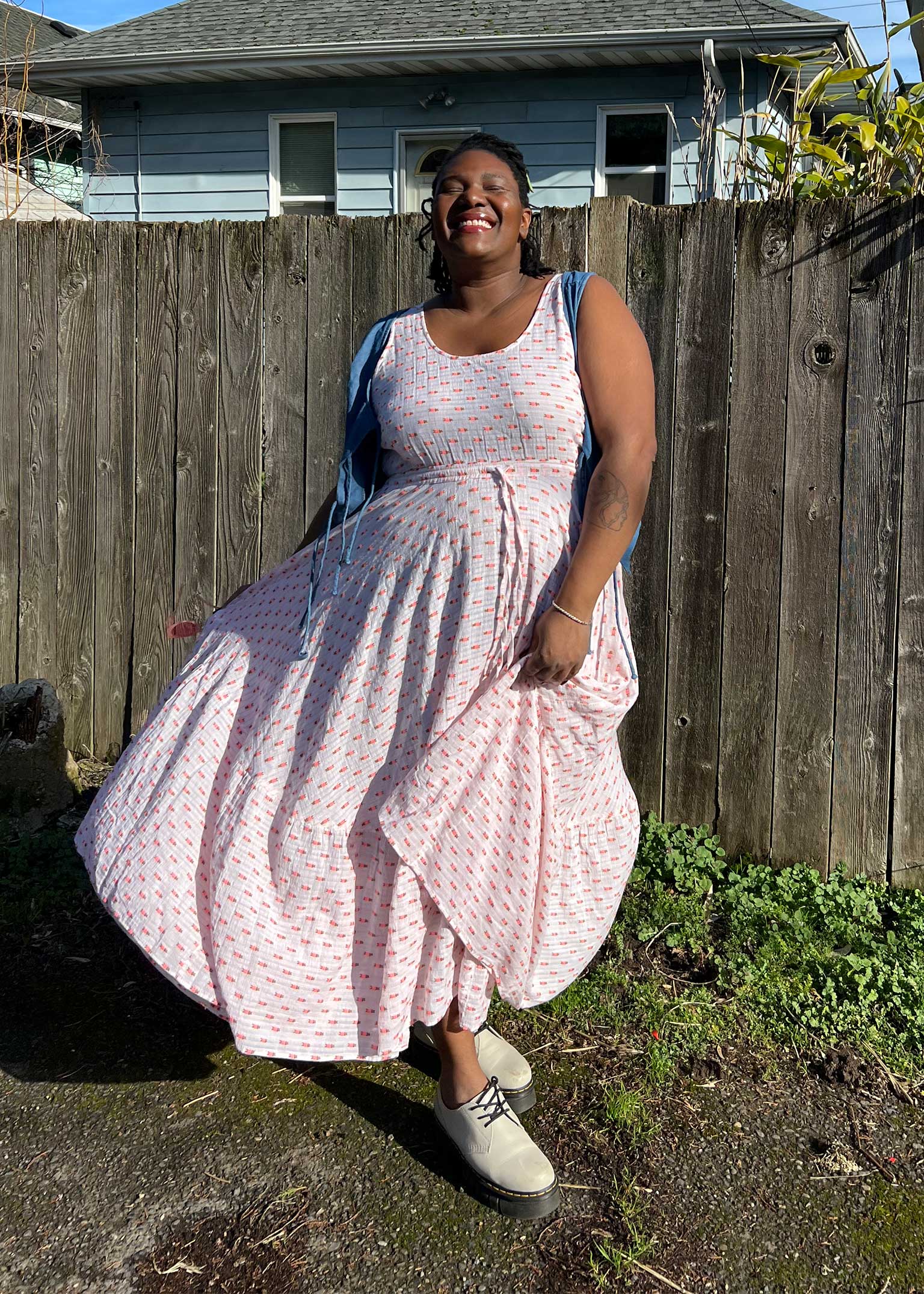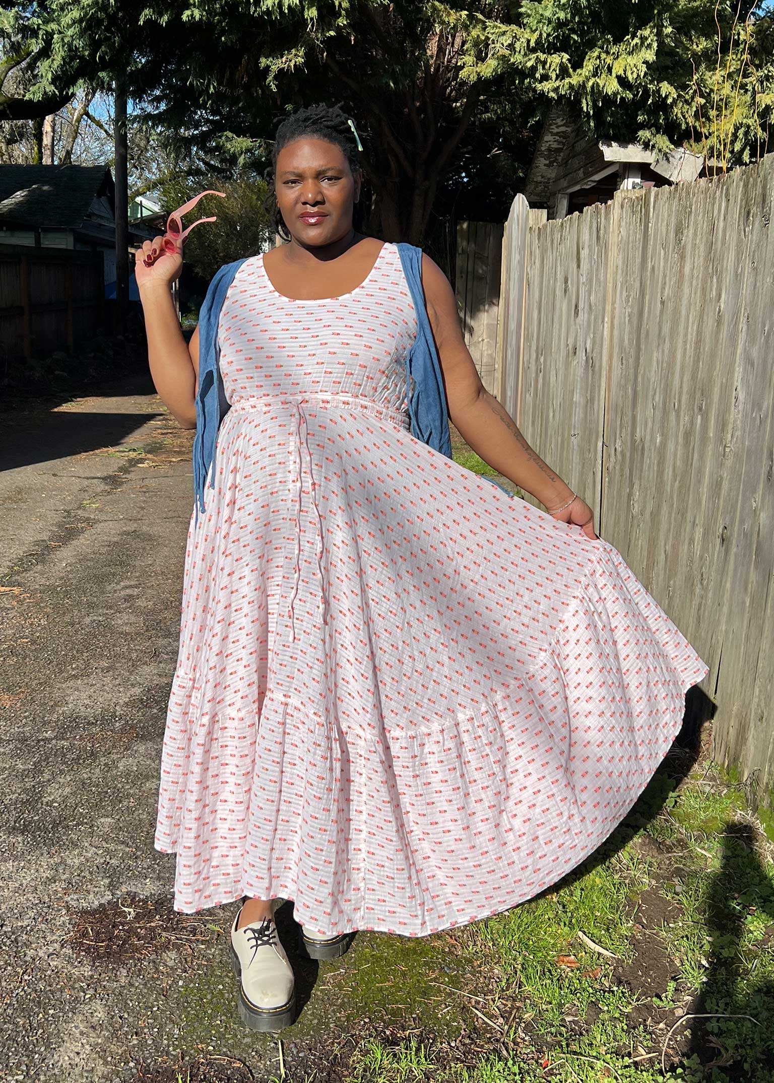 a sleeveless maxi length dress featuring a scoop neck, drawstring and elasticated waist, side slit pockets, and a full tiered skirt. made in our julep textile, a lightweight textured gauzy singlecloth with small woven flowers in bright peach and umber.
