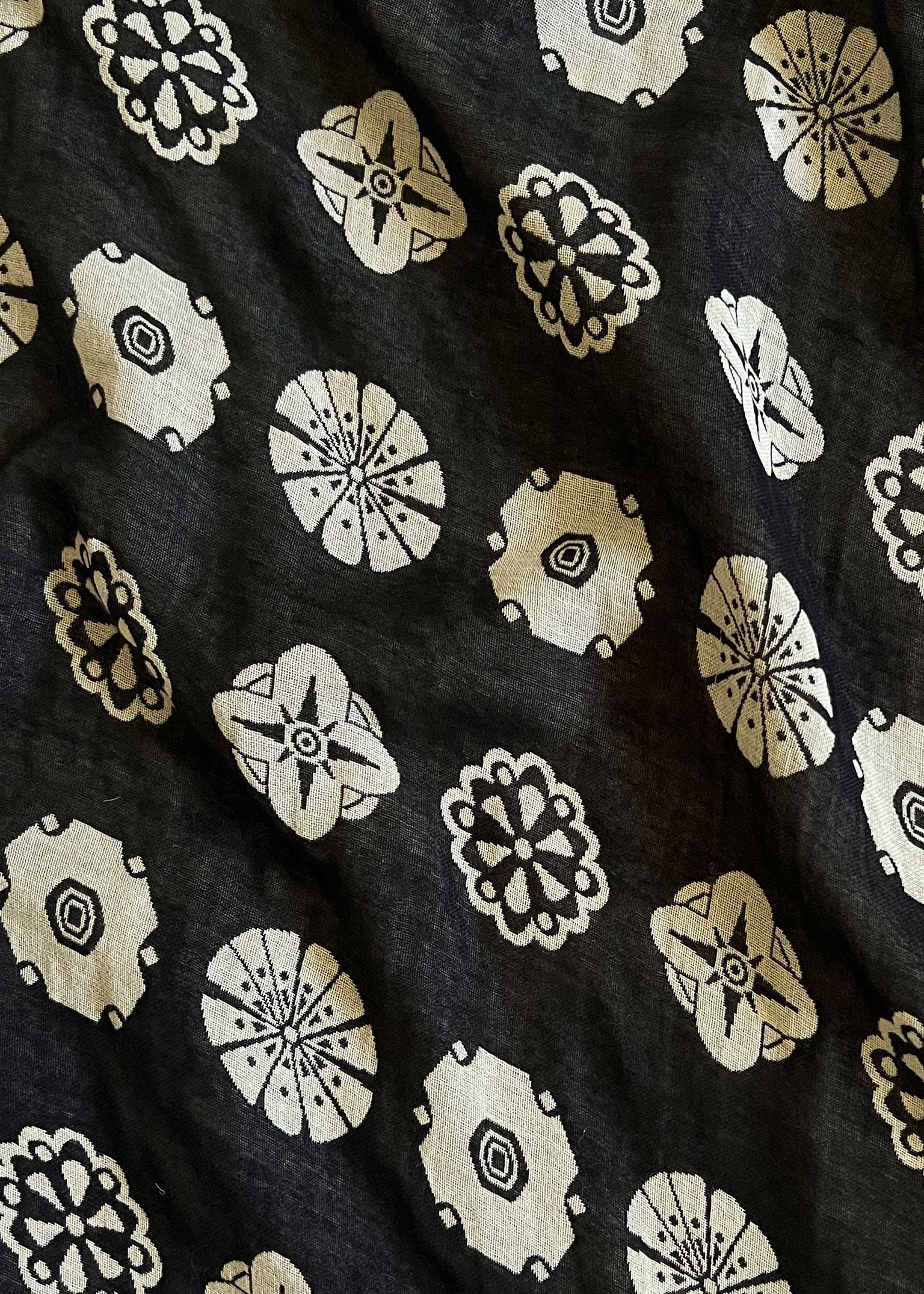 a generous maxi length skirt with a bottom tier, drawstring waist and side seam pockets. made in our bauble textile, a lightweight supersoft black doublegauze textile with intricate woven circular motifs in butter yellow.