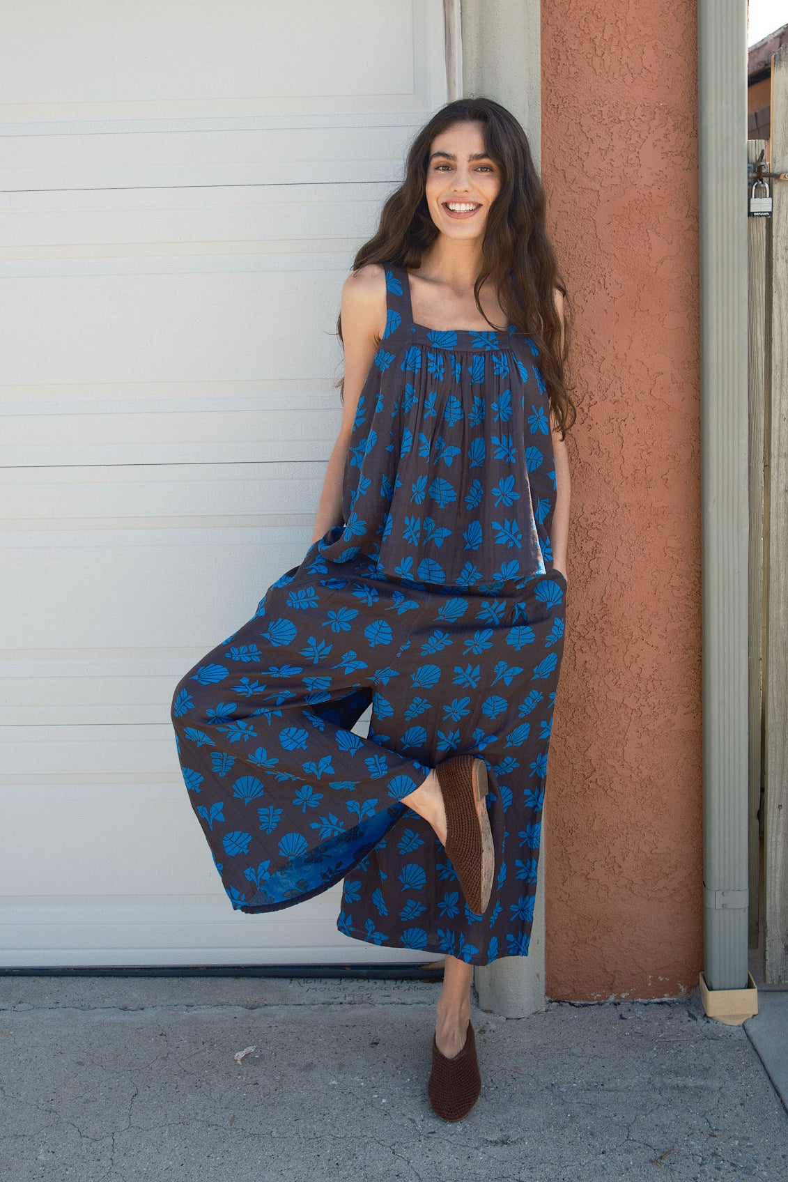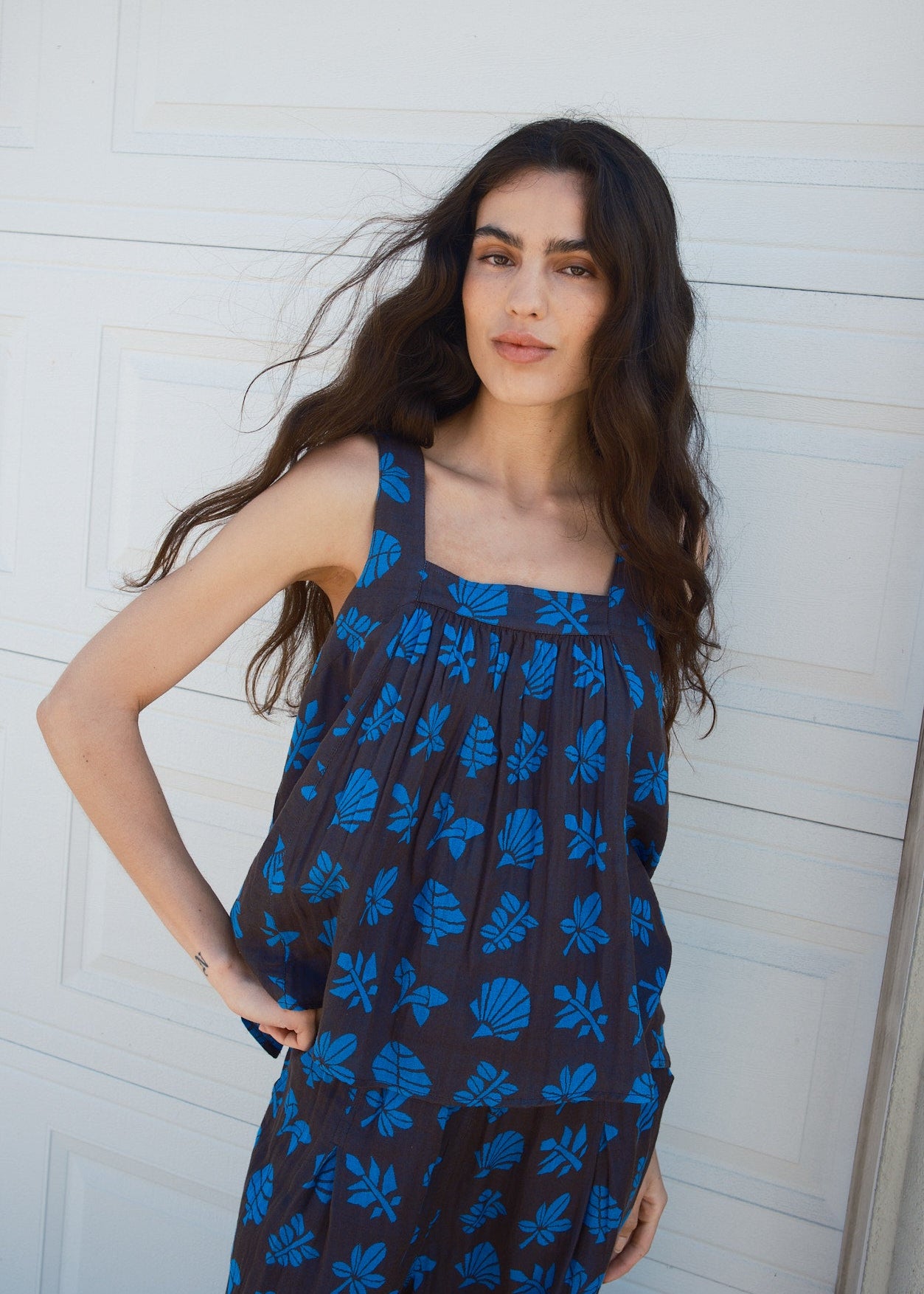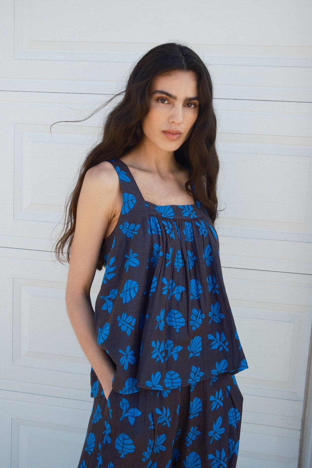 a sleeveless top with a square gathered neckline and front yoke and neckline gathering. made in our java textile, a supersoft lightweight doublegauze in dark brown with brilliant ultramarine blue woven leaf motifs.